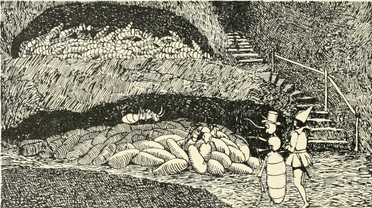 Tom advanced and, bowing politely before the Hamster, asked him for shelter for a weak, ill traveler. When the Hamster saw that there was a lady with Tom, he acted very courteously, and immediately invited them to come in. He ran ahead and returned at once with a torch of rotten wood, with which he lighted them along the corridor, until they came to his dining-room.