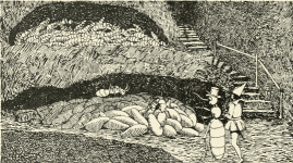 They talked late into the night, and when the Hamster learned that Tom was a prince and king of the Ladybirds' realm, he said that he had never seen gnomes but had heard very much about them from a mouse family that lived under the chapel by the forest.
