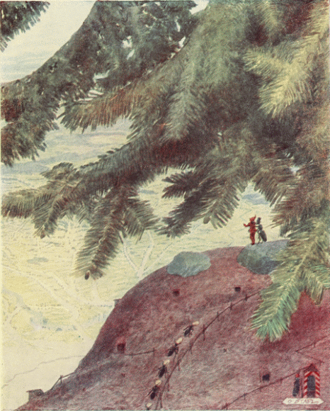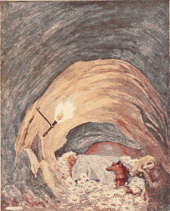 The old lady was pleased that the gnomes wished thus to honor her little altar and readily gave her consent, that they might come to it in order to celebrate the christening of their prince. The messenger bowed and, running quickly down her dress to the floor, disappeared through a little hole by the hearth. Immediately, from behind the great hearth, came the most wonderful procession she had ever seen.[Pg 13]