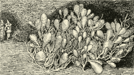 Besides all these pleasant things, the garden was full of roses, mignonette and tall mallow. Close to the fence which ran all about it, grew gooseberries, currants and raspberries; and in the very middle of the garden was a bed of luscious red strawberries, flanked by rows of cabbages, lettuce and peas. Against the walls of the hut, between the windows, old, gnarled vines ran clear to the eaves, bearing bunches of delicious grapes.