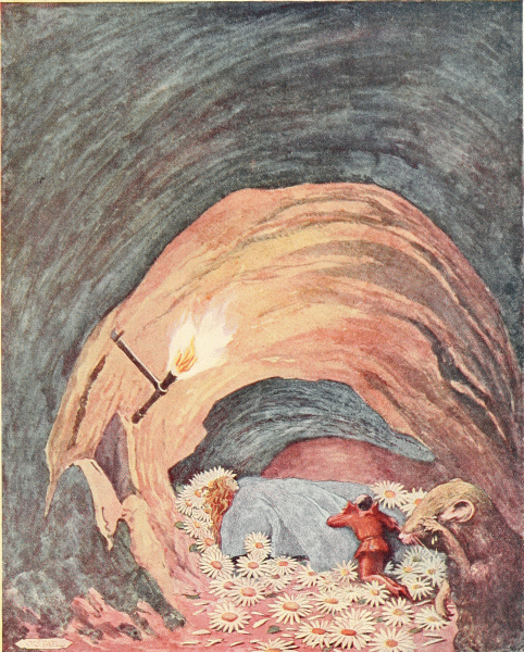 Tom obeyed blindly, covering her with her cloak, then raised her in his arms and walked behind the Hamster through a long corridor until they came to a small niche which the Hamster had dug and lined with daisies for Chrysomela. When they had laid her there, Tom said good bye to her, the Hamster closed in the niche, and they went back to the lonely dining-room.