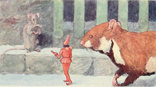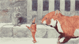 All about them was only the dark night, while the cold of the evening pierced them to the bone. Chrysomela pressed close to Little Tom, but she was so weary, she could hardly stand on her feet. Tom feared to leave her, lest he might lose her, so, supporting her as best he could, stumbled on with her along the furrow until they came to a broad hole. He wanted at once to step in with Chrysomela, not caring who was there, and to ask for shelter, when, suddenly, out of the darkness, came a gigantic animal in a fur coat, with bristling whiskers and puffed out cheeks. It was the Hamster.[Pg 129]
