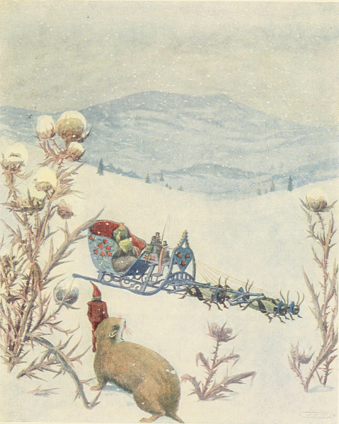 The leaf came nearer; but it proved to be not a leaf at all, but a beautiful sledge drawn by four black crickets. On the box, sat a speckled coachman and, beside him, the footmen—centipedes, while, behind, nestled a most beautiful lady, all wrapped up in the green and black fur of a butterfly caterpillar. The little bells were ringing on the horses and the coachman snapped his whip as they approached the Hamster.