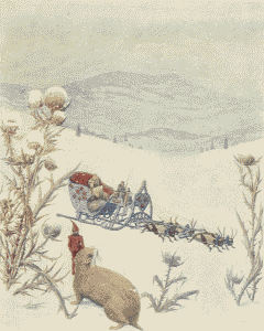 Tom went to say farewell to Chrysomela's last resting place; then he took his seat in the Hamster's fur coat and started out of the hole. Tom was greatly amazed when he looked around. Far and wide, wherever the eye could see, there was a great, white plain, and, everywhere, the snow was sparkling in the sun. The Hamster hurried through the snow, with the snow-dust rising behind them. Tom held on to his fur and could hardly breathe in the fresh morning air. They ran down by the field, crossed the meadow and saw the chapel under the wood, shining in the plain by the brook, but nowhere was the hut.[Pg 134]