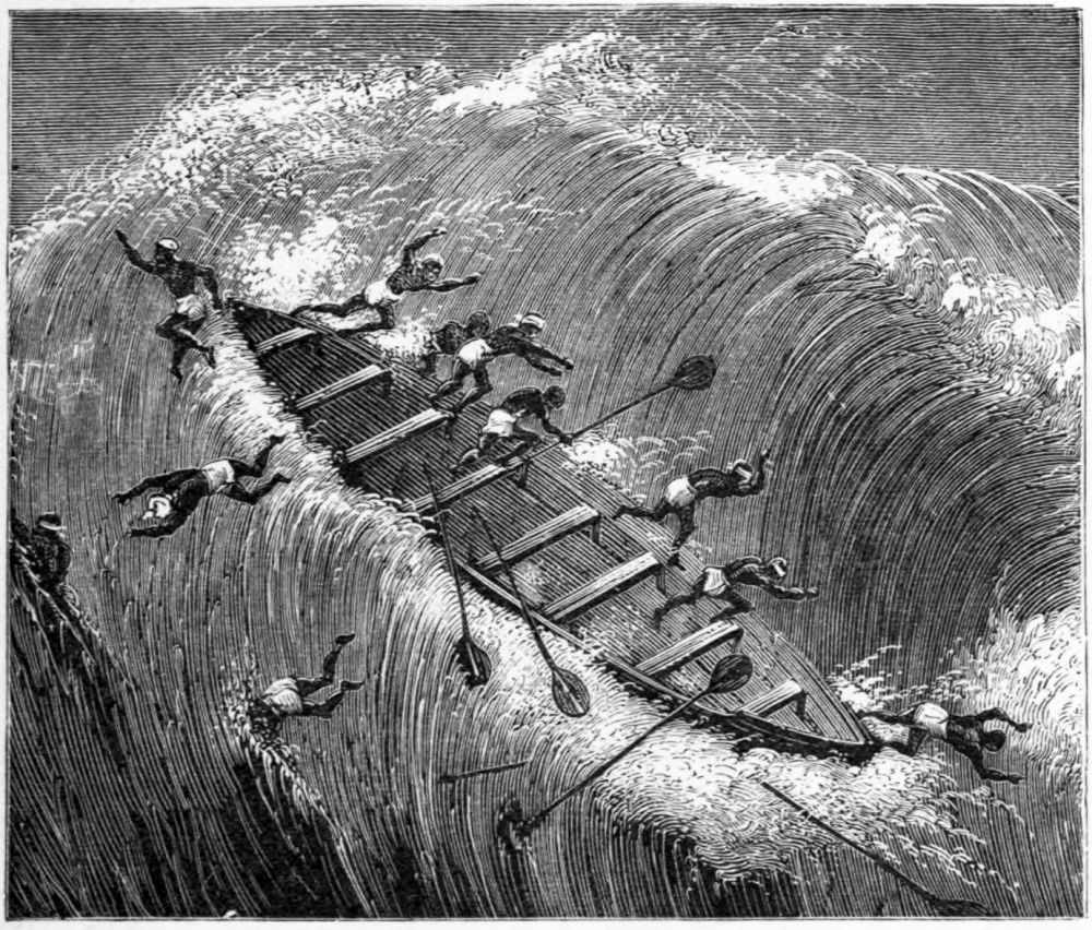 At the time I had seen the Petrel in the river they had been put on their guard by my cutting the branches from the schooner’s masthead, and they had fortunately been able to beat off the attack made by Okopa’s people and the schooner. The latter they had jammed on the bar, where she must have become a complete wreck. As they had not recognized me, they had no idea of my being in their neighbourhood. Indeed they had all supposed that I was either drowned or carried off by sharks when the boat capsized at Whydah.