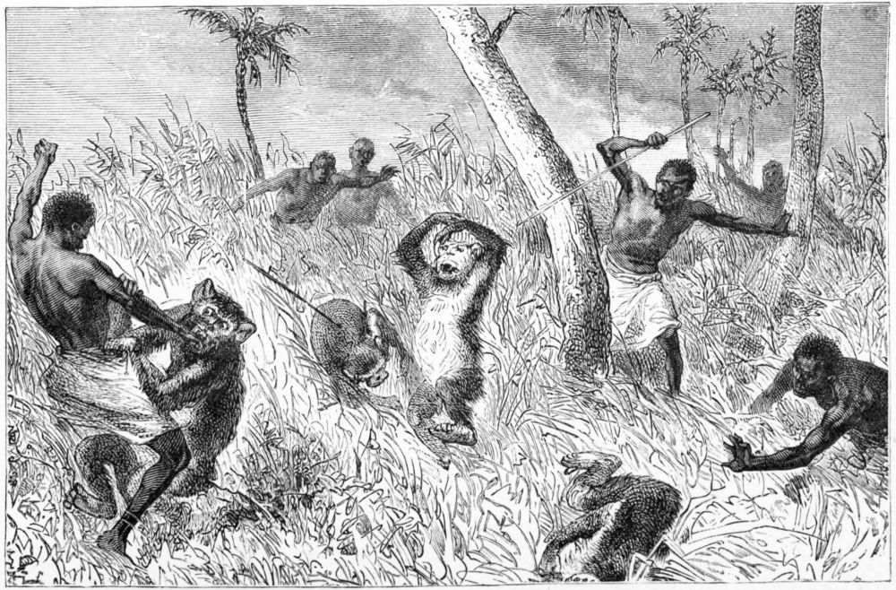 Abundance of game was not without its drawbacks, as two incidents which occurred and which come vividly to my memory may prove. One day while we were all marching along slowly and sadly, no one having any heart for the songs or shouts with which the African usually enlivens his day’s march, I was astonished by seeing a sudden panic seize the carriers, who pitched their loads on the ground and scampering off to the handiest trees commenced to climb them. Hatibu shouted to me to follow him, as with the agility of a monkey he swung himself on to the lower branches of an acacia tree, regardless of the thorns, and I, hardly knowing what I was doing, hastened to place myself beside him.