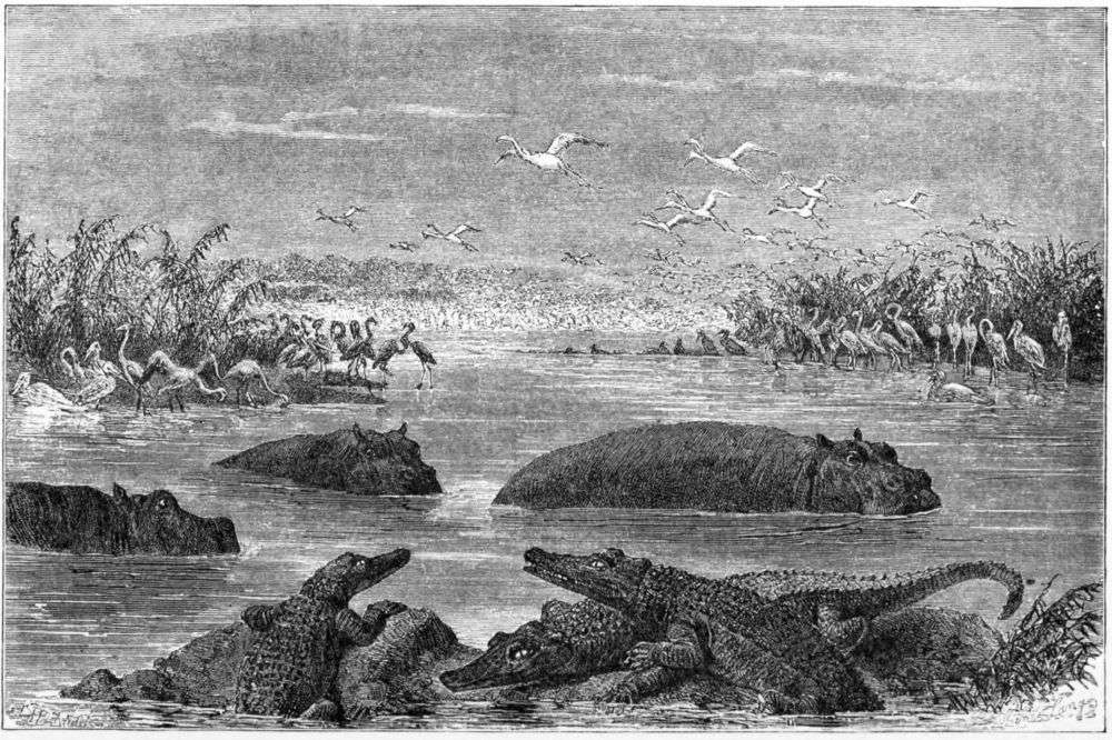 I was up to my waist in mud and water, picking the pods off the water-lilies, when I heard a scream and a crash, or more properly a crash and a scream, and I heard the voice of a man crying out, “Franki, Franki! mbogo, mbogo!” (buffalo, buffalo). Pushing through the reeds I saw one poor fellow on the ground gored by a buffalo, while another, though only armed with a shoka, or hatchet, was preparing to attack the infuriated animal.