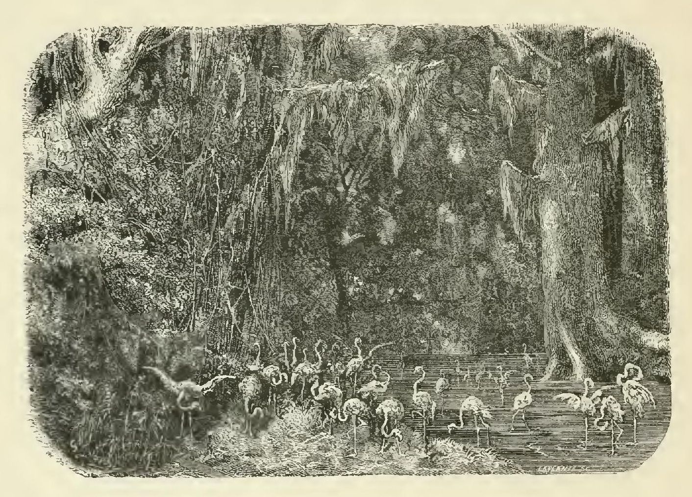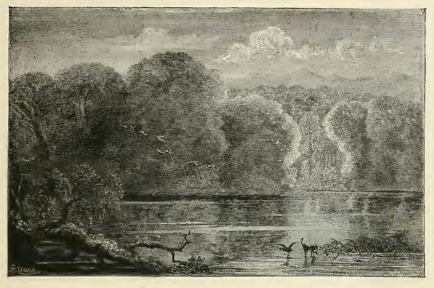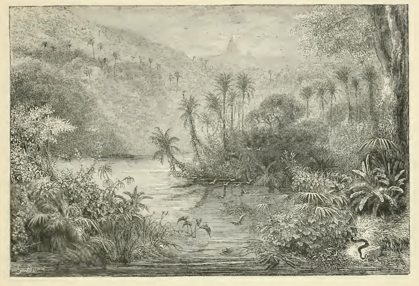 If all is silence and repose in the savannahs on the other side of the river, all here, on the contrary, is sound and motion; peckings against the trunks of the oaks, frictions of animals walking along as they nibble or crush between their teeth the stones of fruits, the roaring of the waves, plaintive cries, dull bellowings and mild cooings, fill these deserts with a tender yet wild harmony. But when a breeze happens to animate these solitudes, to swing these floating bodies, to confound these masses of white, blue, green, and pink, to mix all the colors and to combine all the murmurs, there issue such sounds from the depths of the forests, and such things pass before the eyes, that I should in vain endeavor to describe them to those who have never visited these primitive fields of Nature.