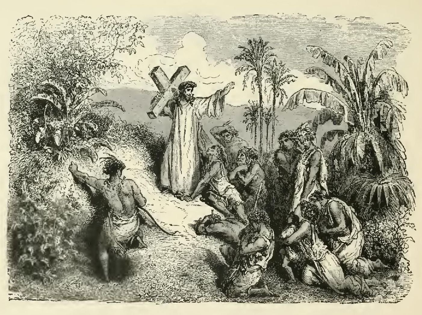 “Thus escorted, we arrived at the foot of the large cross placed by the roadside. It was here that the servant of God was in the habit of celebrating the mysteries of his religion. ‘My dear neophytes,’ said he, turning himself towards the crowd, ‘a brother and a sister have come up to you, and, as an additional happiness, I see that Providence spared your harvests yesterday. Behold two great reasons for thankfulness. Let us therefore offer up the holy sacrifice, and may each of you bring to it deep attention, a lively faith, infinite gratitude, and a humble heart!’