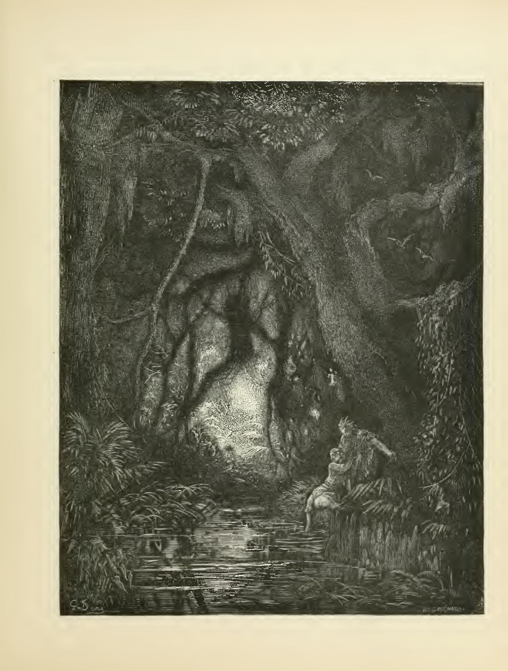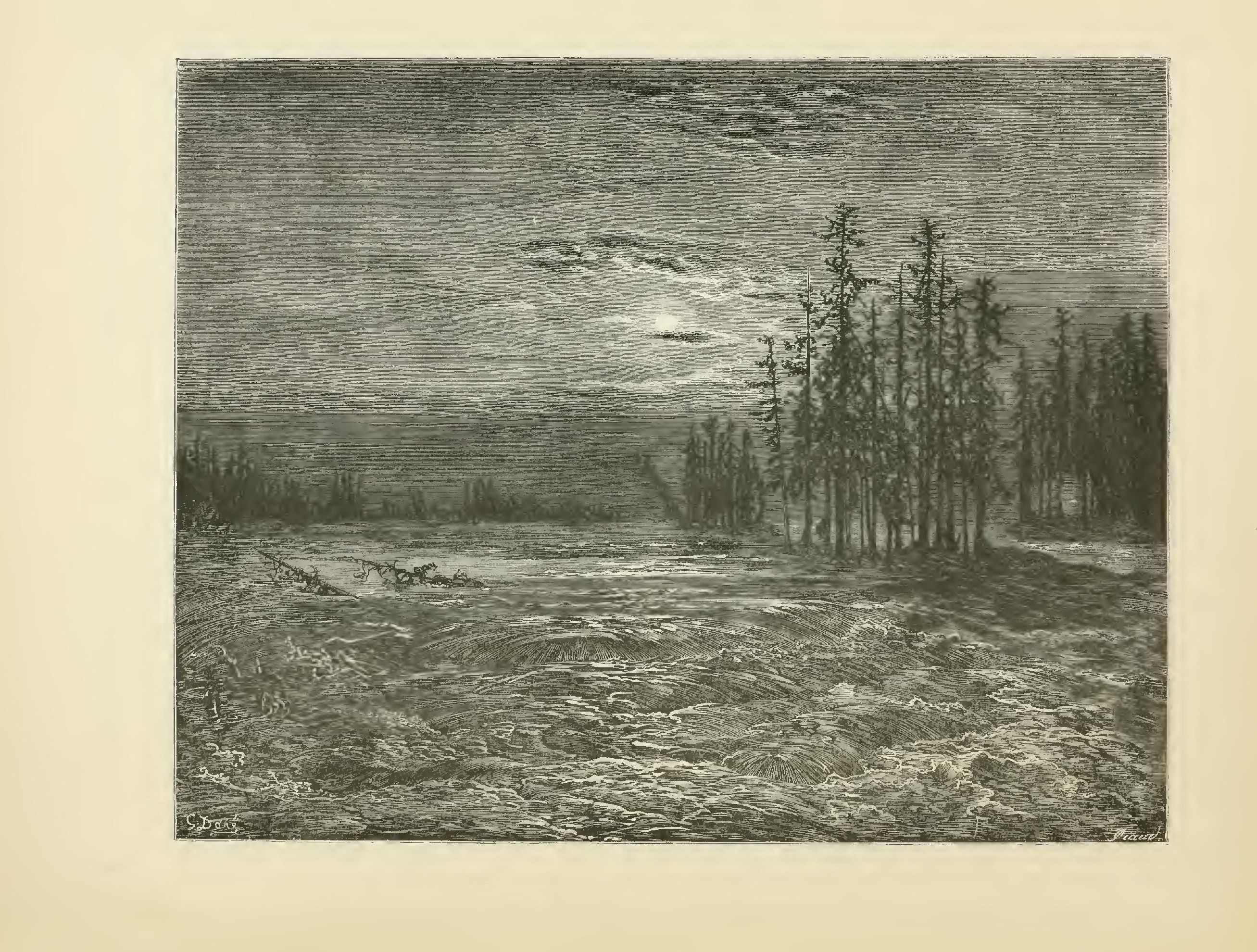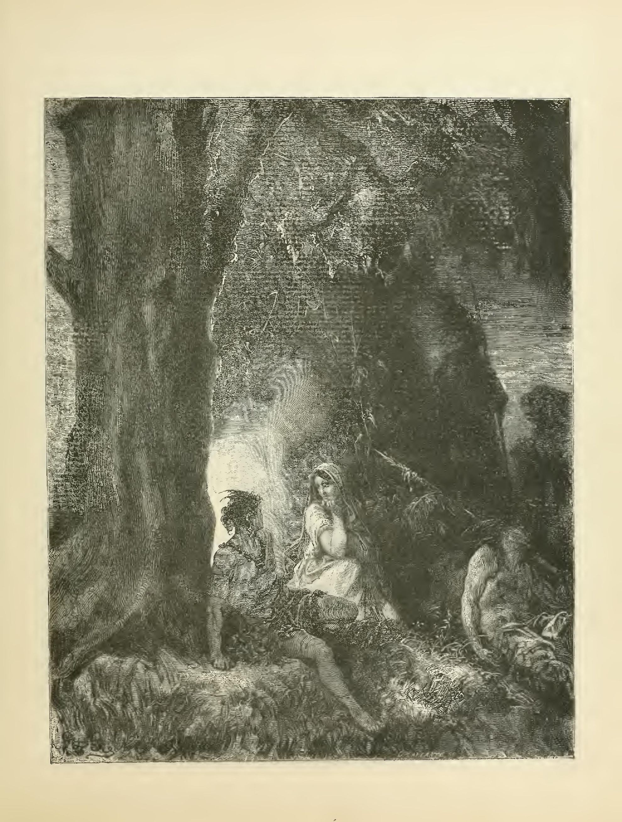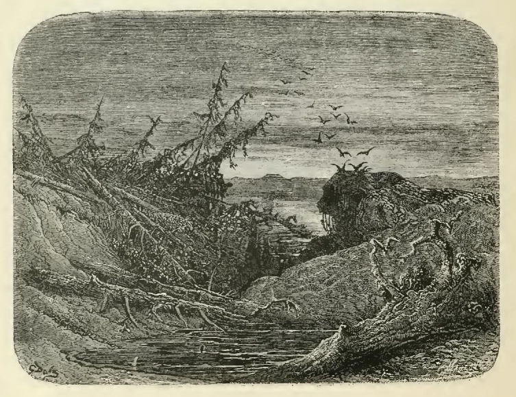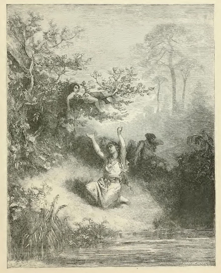 The illustrations of M. Doré have given an additional value to this tale, so simple, so unsophisticated, yet blooming with all the wild luxuriance of nature. The artist has added his gifts to those of the poet; and those acquainted only with his ready and original powers as the delineator of farce and drollery, or of the exceptionally tragic and horrible, will find new cause for admiration in these quiet renderings of the primeval beauties of the American wild—its plains and forests, its still lagoons and roaring cataracts, its mountain slopes and deep defiles—all its aspects of rudest workmanship—and will welcome these efforts of his genius in the lovely realm of descriptive art, wedded as they are to the exquisite simplicity of this Indian romance. As in his other works, here may be noted the same surpassing fertility of resource, the same alertness of intellect and readiness and swiftness of touch; but there may also be found new proofs of his complete sympathy with all that is picturesque in forest beauty and his high intuitive perception of every possible phase of nature in her wildest caprice and most tender bloom.