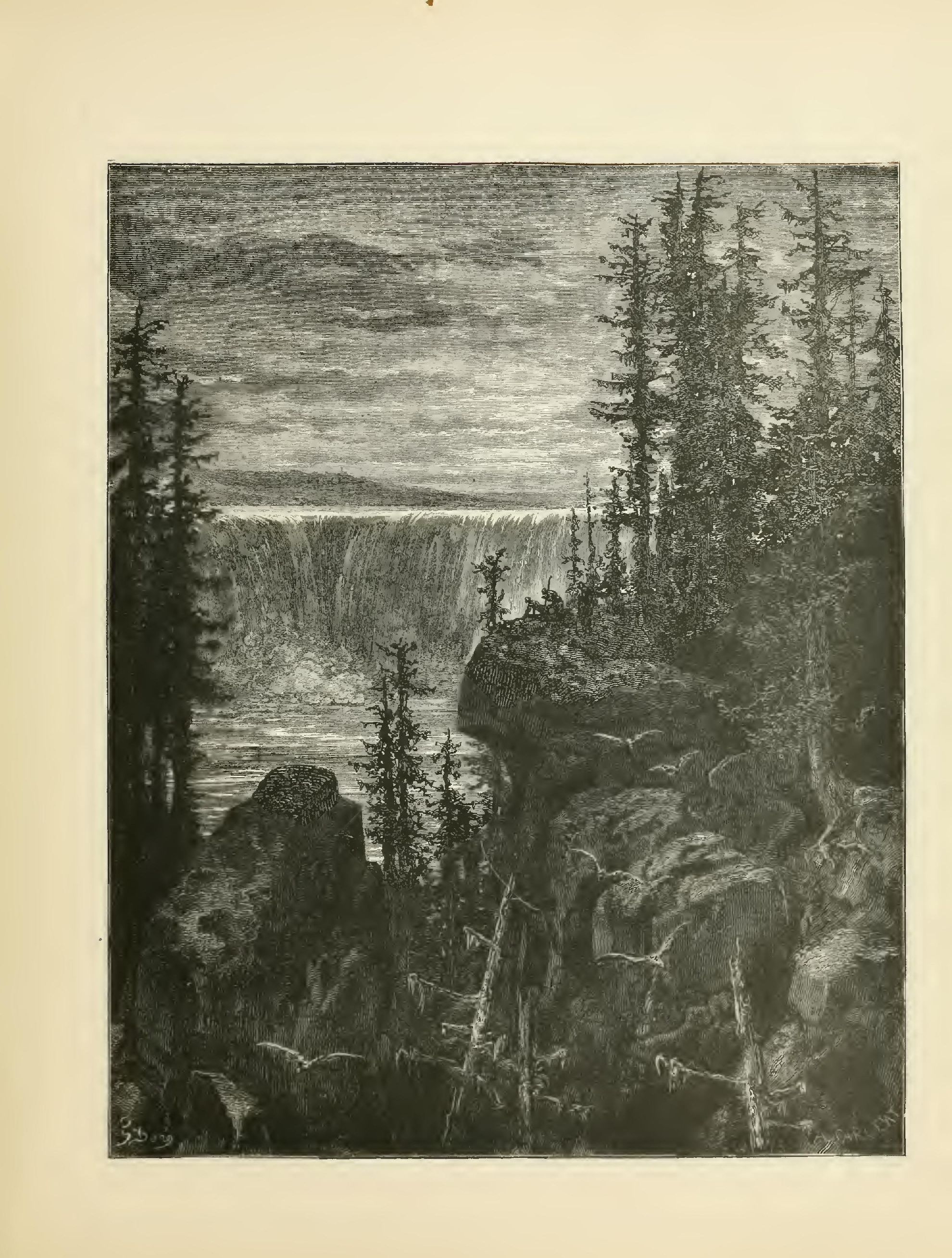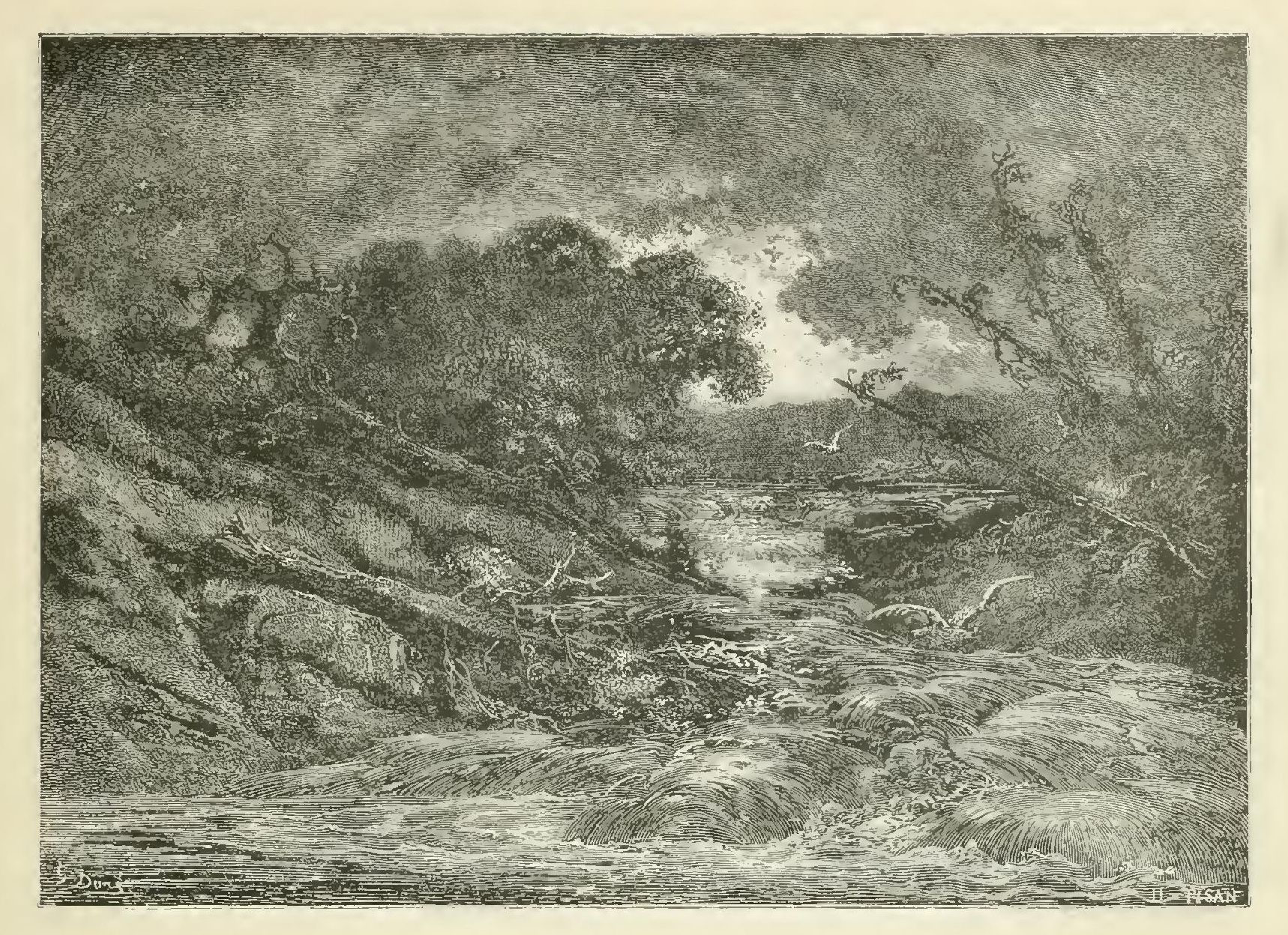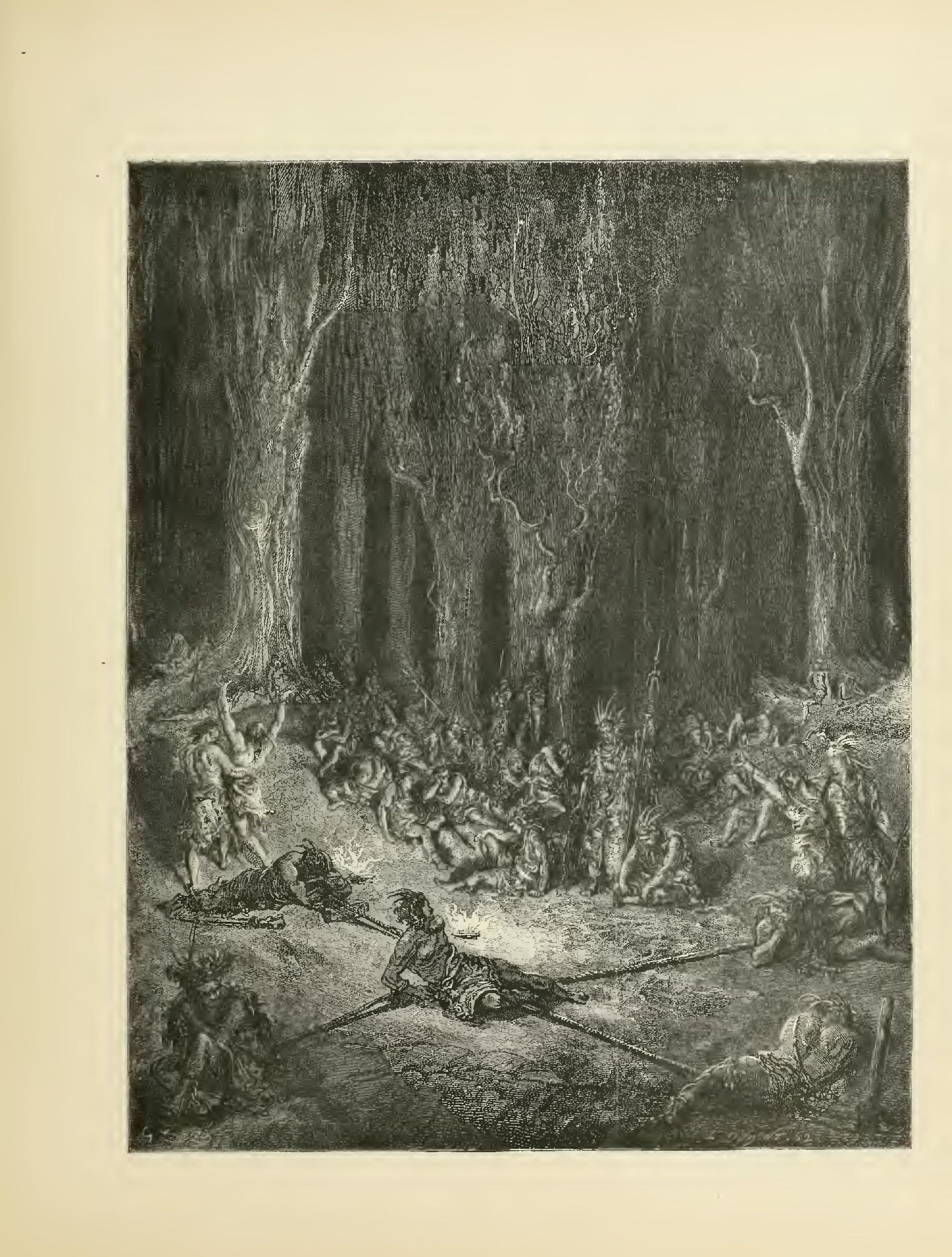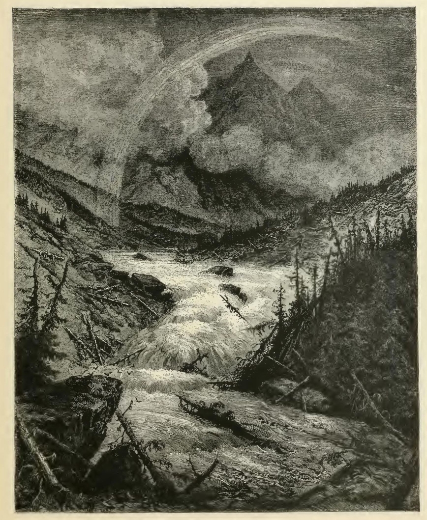 The illustrations of M. Doré have given an additional value to this tale, so simple, so unsophisticated, yet blooming with all the wild luxuriance of nature. The artist has added his gifts to those of the poet; and those acquainted only with his ready and original powers as the delineator of farce and drollery, or of the exceptionally tragic and horrible, will find new cause for admiration in these quiet renderings of the primeval beauties of the American wild—its plains and forests, its still lagoons and roaring cataracts, its mountain slopes and deep defiles—all its aspects of rudest workmanship—and will welcome these efforts of his genius in the lovely realm of descriptive art, wedded as they are to the exquisite simplicity of this Indian romance. As in his other works, here may be noted the same surpassing fertility of resource, the same alertness of intellect and readiness and swiftness of touch; but there may also be found new proofs of his complete sympathy with all that is picturesque in forest beauty and his high intuitive perception of every possible phase of nature in her wildest caprice and most tender bloom.