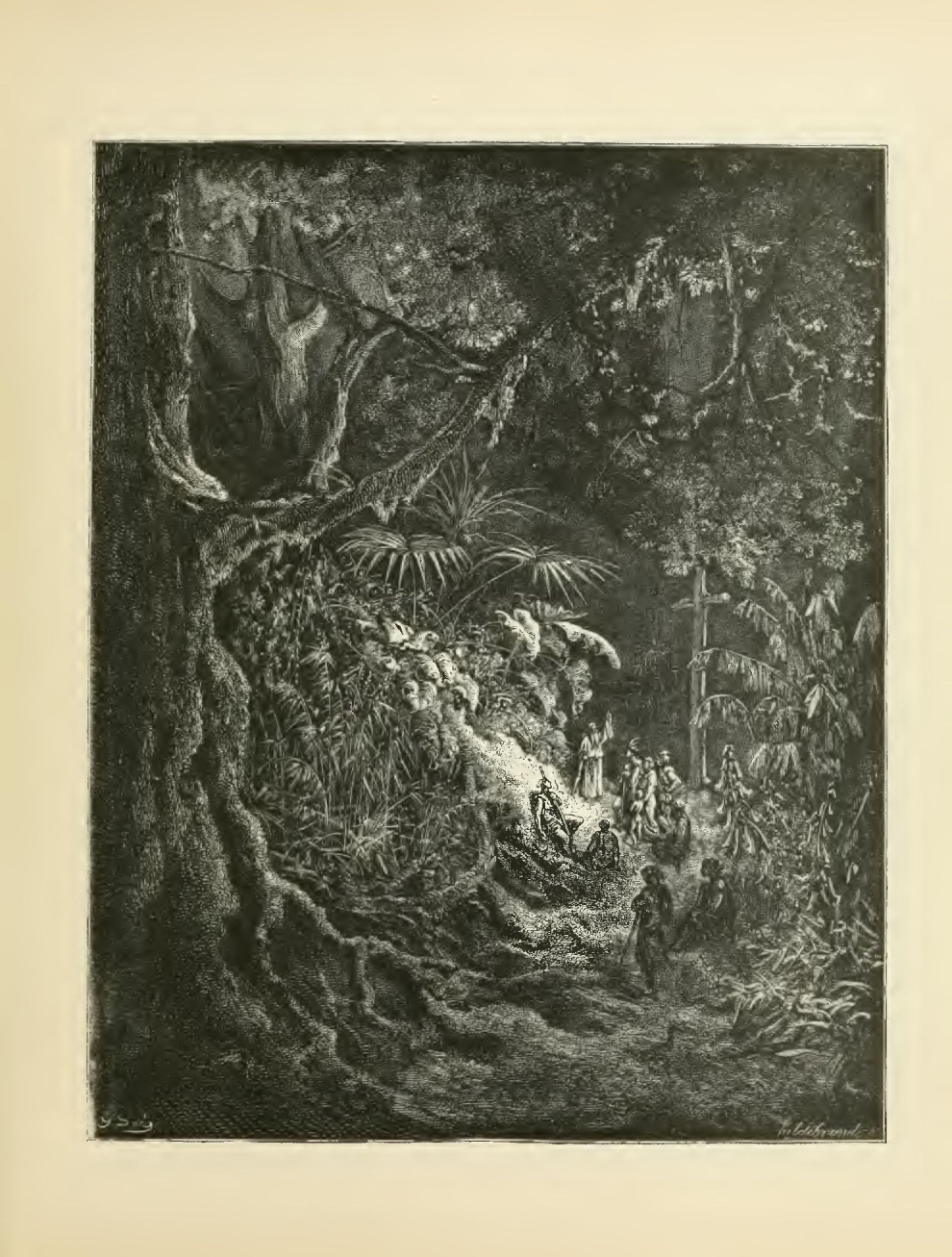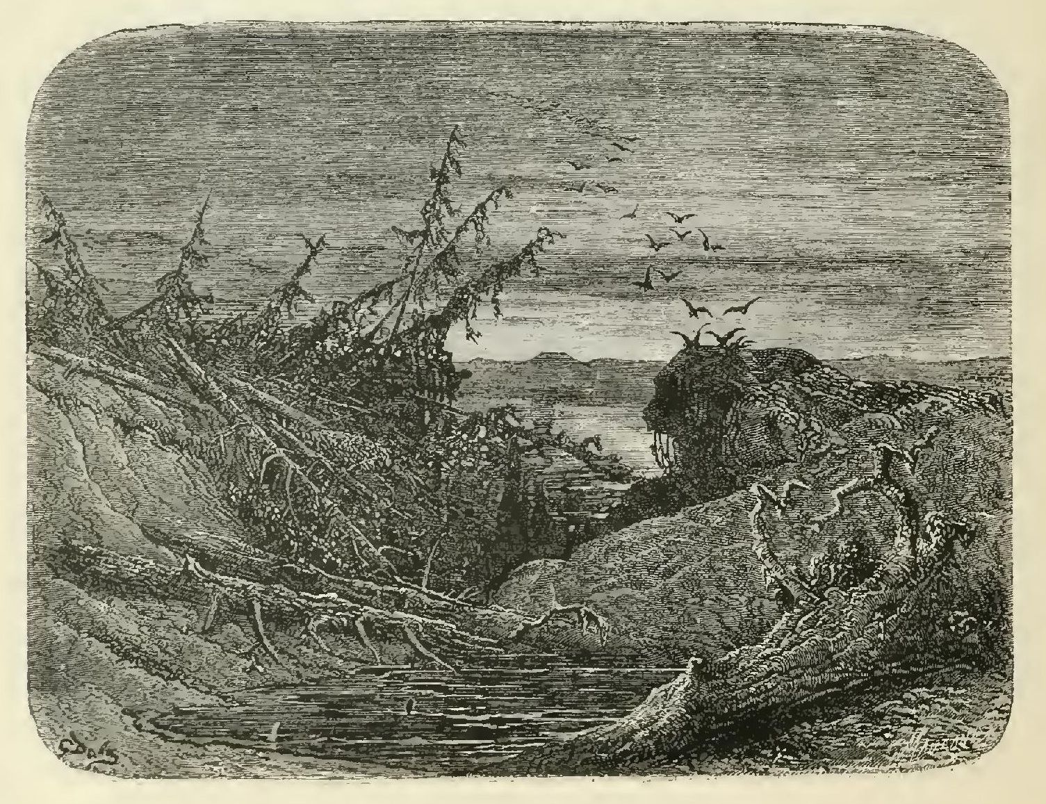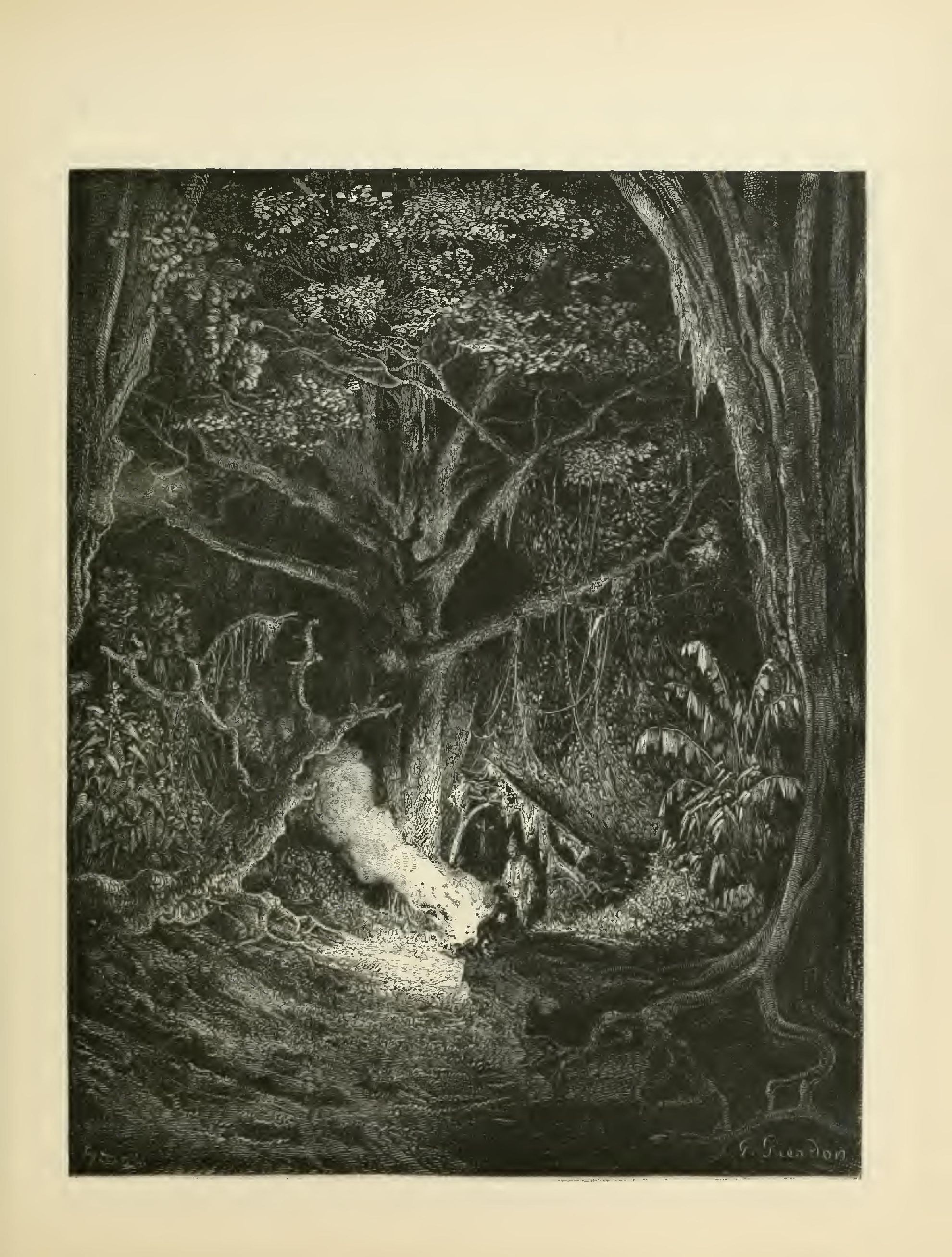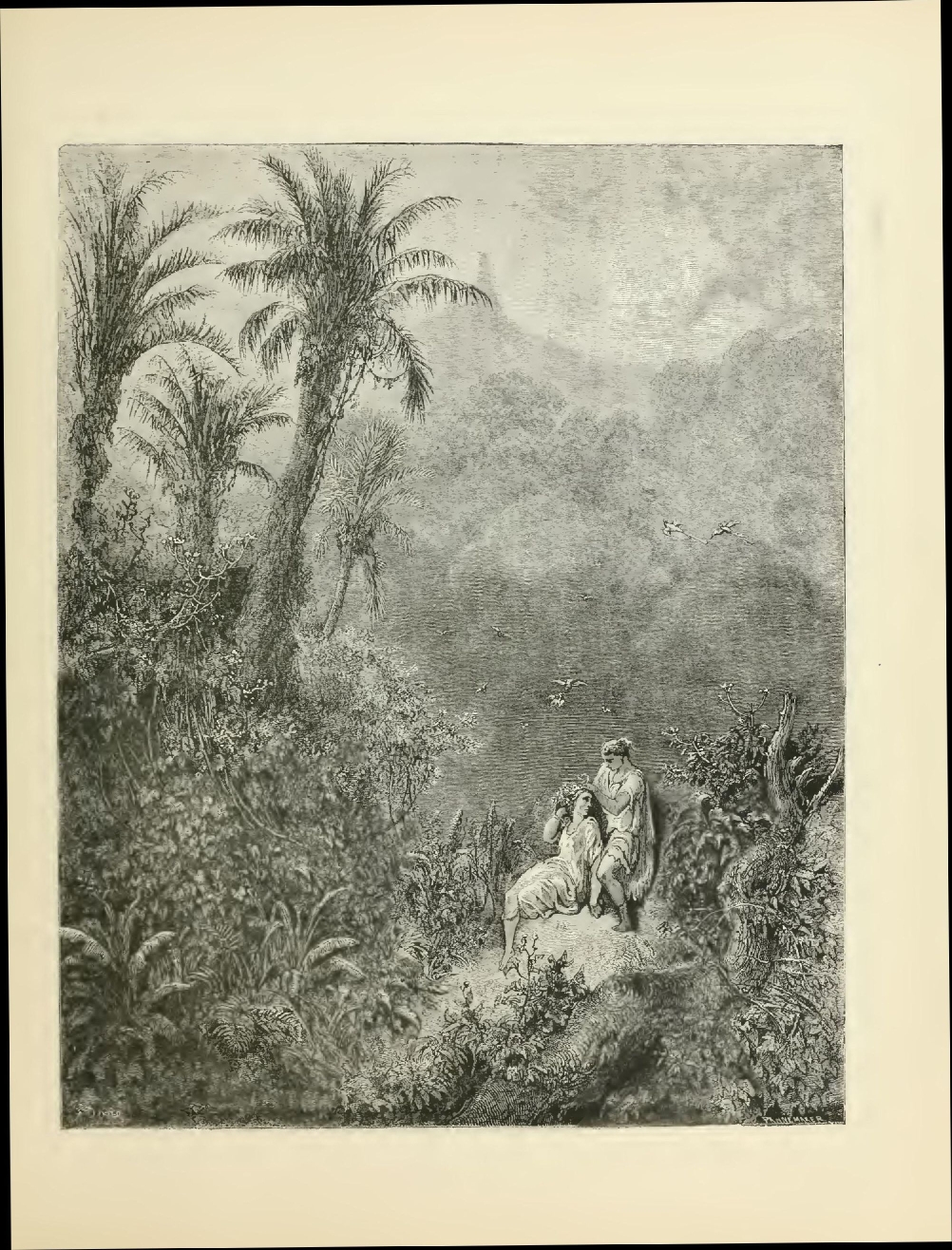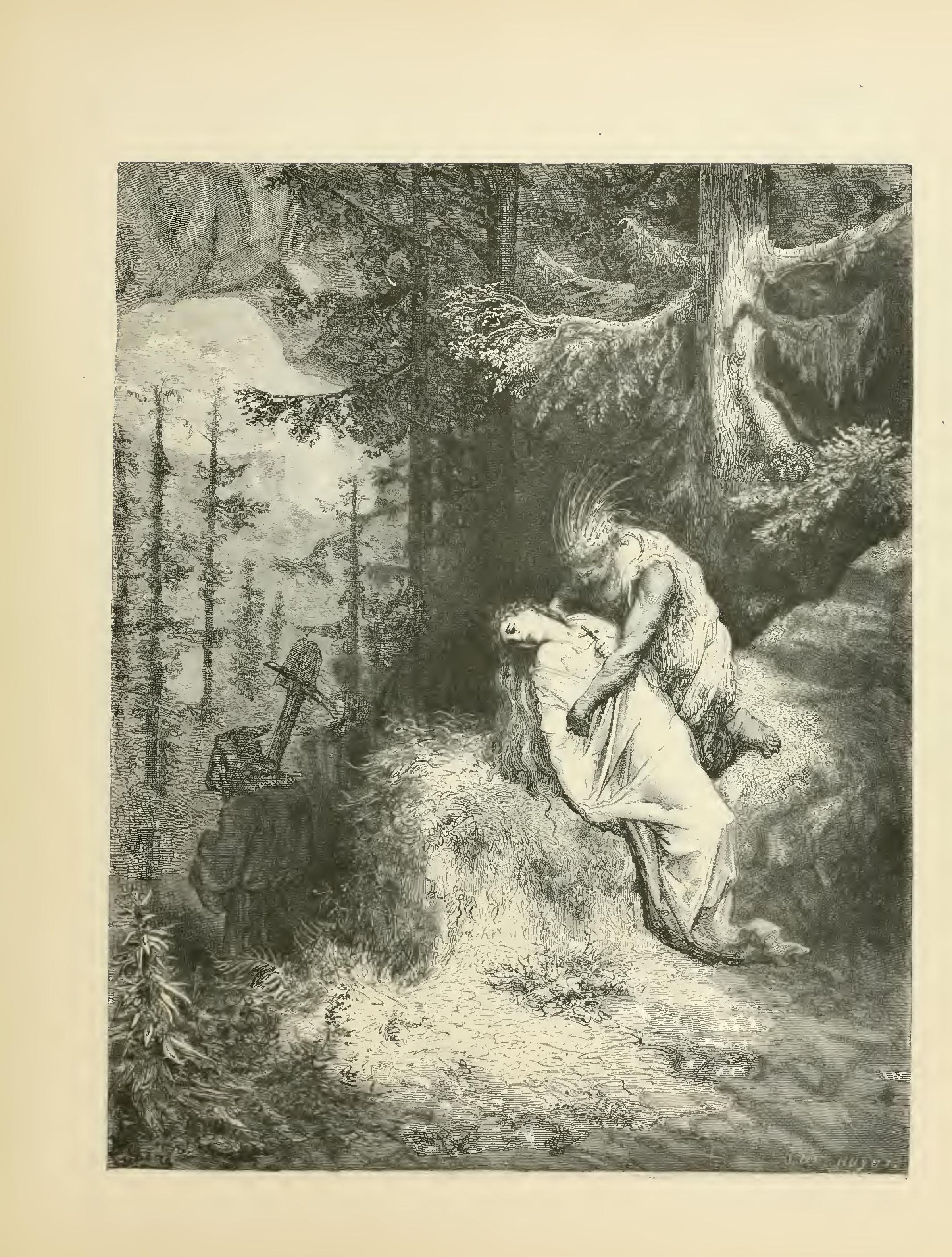 The illustrations of M. Doré have given an additional value to this tale, so simple, so unsophisticated, yet blooming with all the wild luxuriance of nature. The artist has added his gifts to those of the poet; and those acquainted only with his ready and original powers as the delineator of farce and drollery, or of the exceptionally tragic and horrible, will find new cause for admiration in these quiet renderings of the primeval beauties of the American wild—its plains and forests, its still lagoons and roaring cataracts, its mountain slopes and deep defiles—all its aspects of rudest workmanship—and will welcome these efforts of his genius in the lovely realm of descriptive art, wedded as they are to the exquisite simplicity of this Indian romance. As in his other works, here may be noted the same surpassing fertility of resource, the same alertness of intellect and readiness and swiftness of touch; but there may also be found new proofs of his complete sympathy with all that is picturesque in forest beauty and his high intuitive perception of every possible phase of nature in her wildest caprice and most tender bloom.