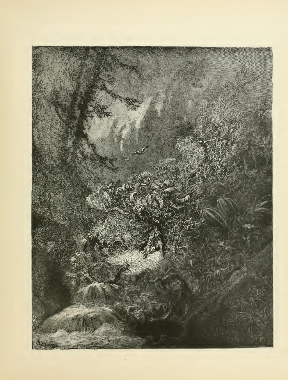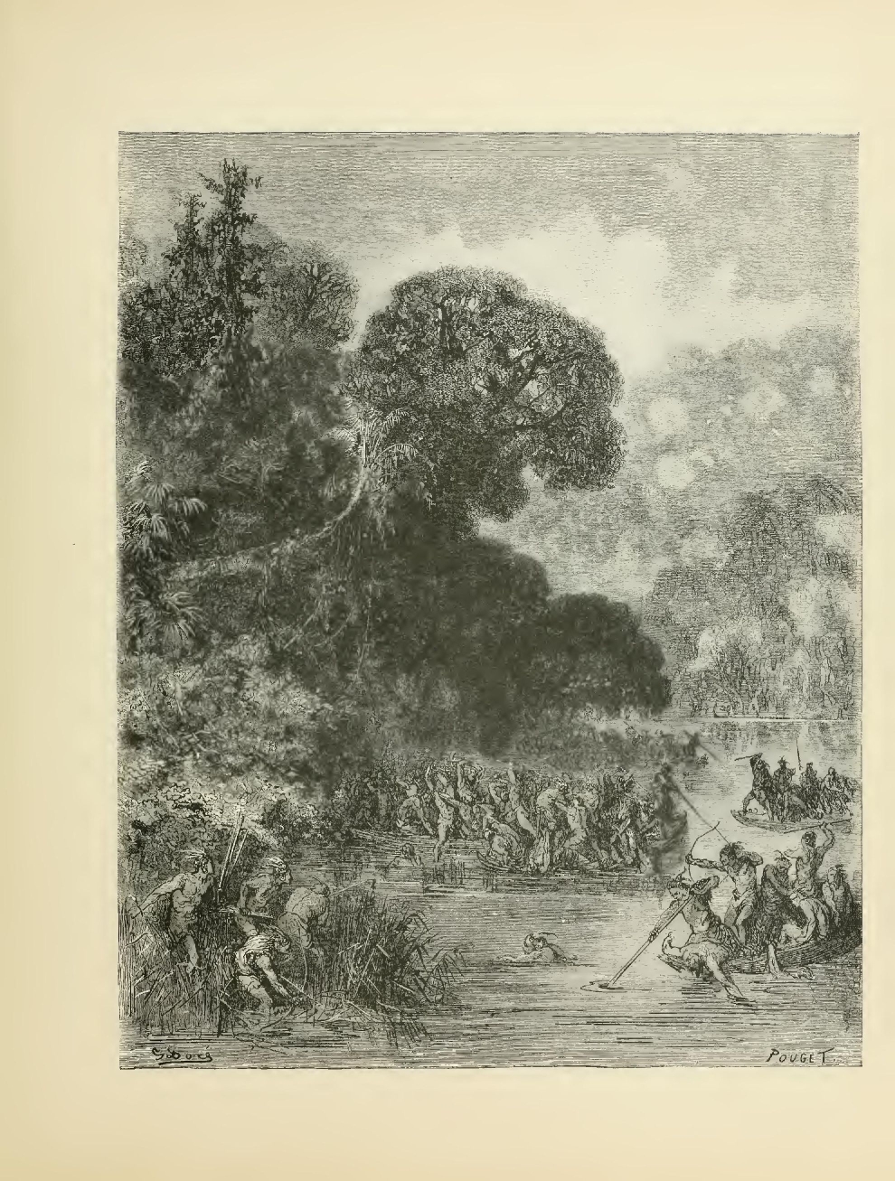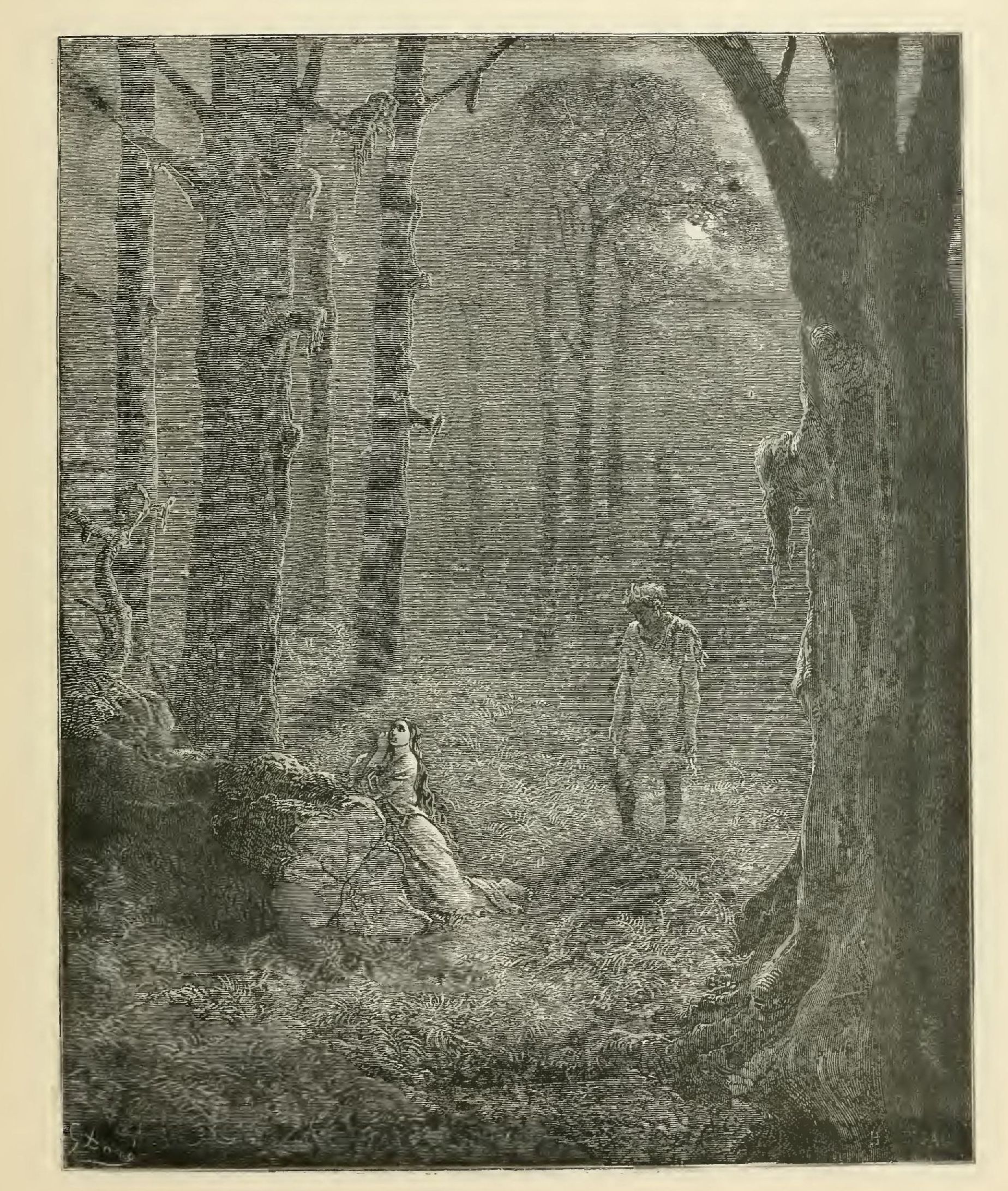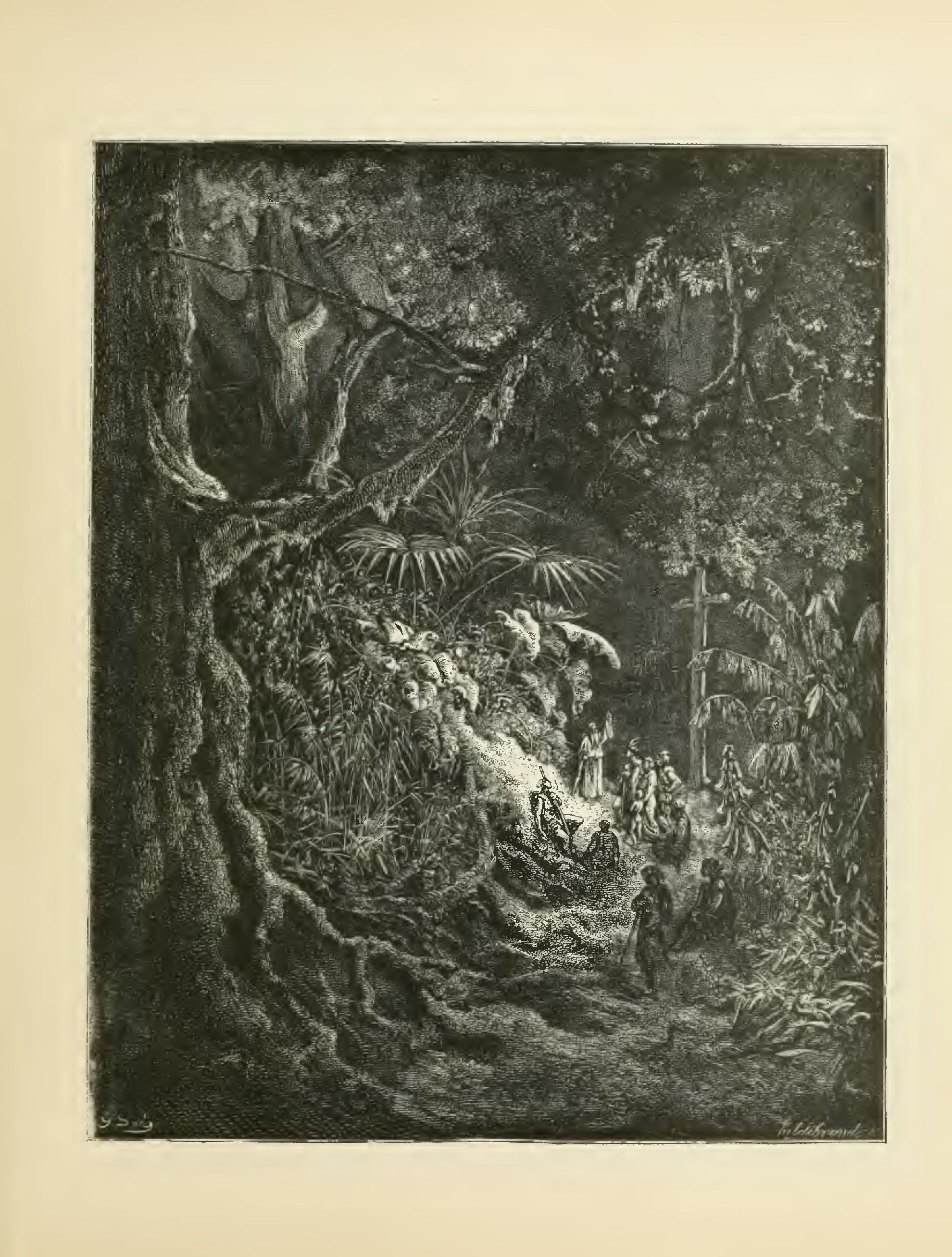 The illustrations of M. Doré have given an additional value to this tale, so simple, so unsophisticated, yet blooming with all the wild luxuriance of nature. The artist has added his gifts to those of the poet; and those acquainted only with his ready and original powers as the delineator of farce and drollery, or of the exceptionally tragic and horrible, will find new cause for admiration in these quiet renderings of the primeval beauties of the American wild—its plains and forests, its still lagoons and roaring cataracts, its mountain slopes and deep defiles—all its aspects of rudest workmanship—and will welcome these efforts of his genius in the lovely realm of descriptive art, wedded as they are to the exquisite simplicity of this Indian romance. As in his other works, here may be noted the same surpassing fertility of resource, the same alertness of intellect and readiness and swiftness of touch; but there may also be found new proofs of his complete sympathy with all that is picturesque in forest beauty and his high intuitive perception of every possible phase of nature in her wildest caprice and most tender bloom.