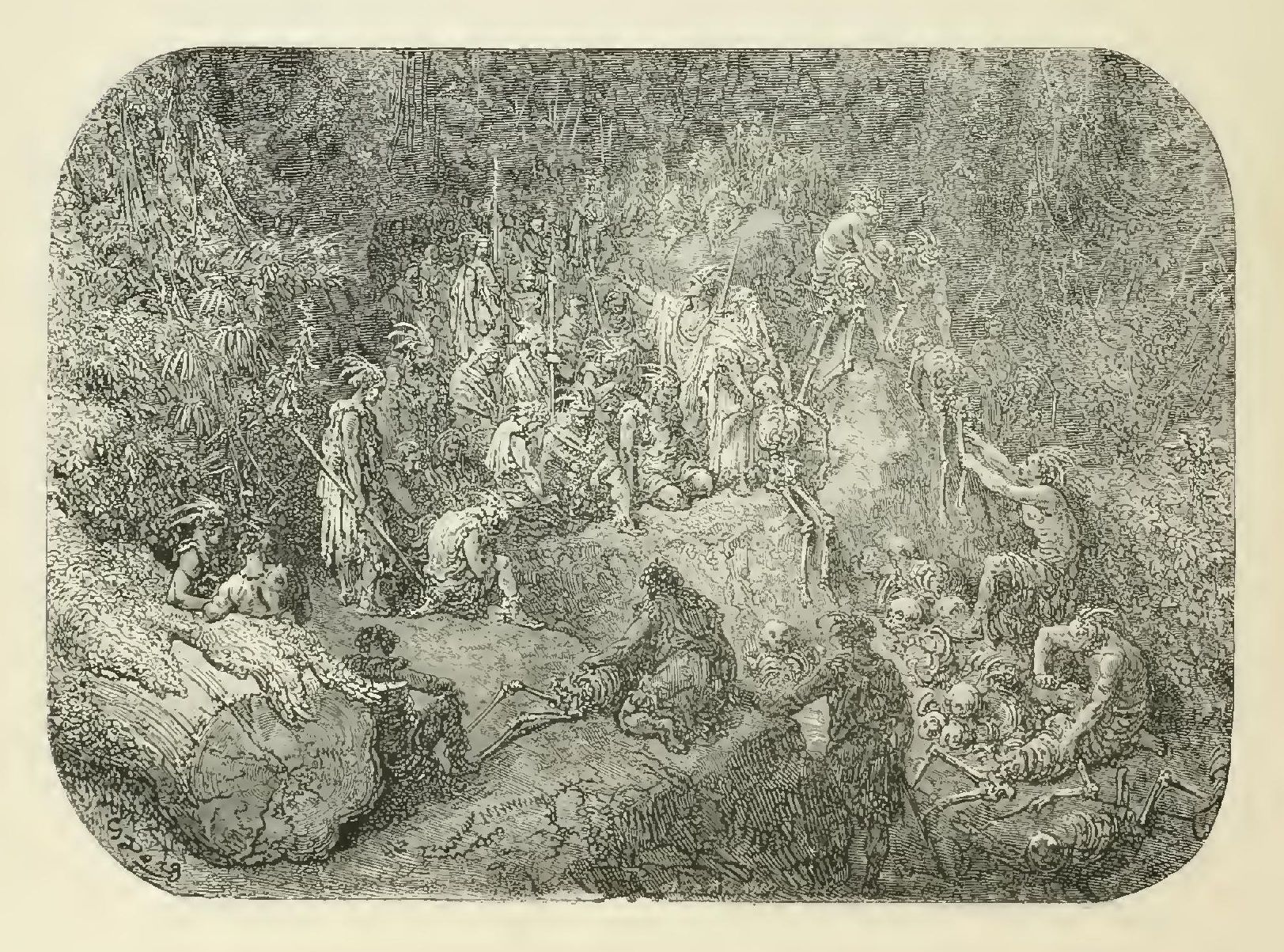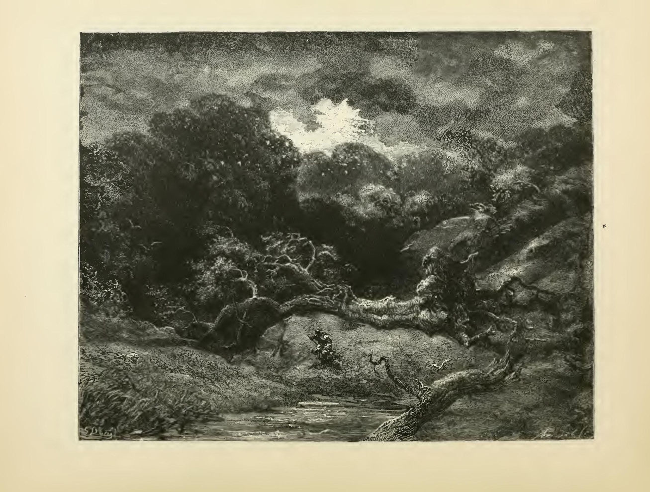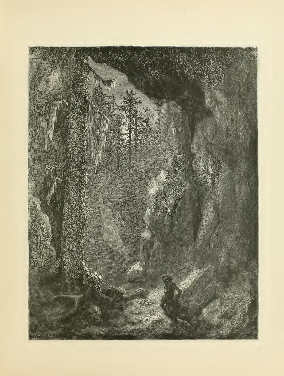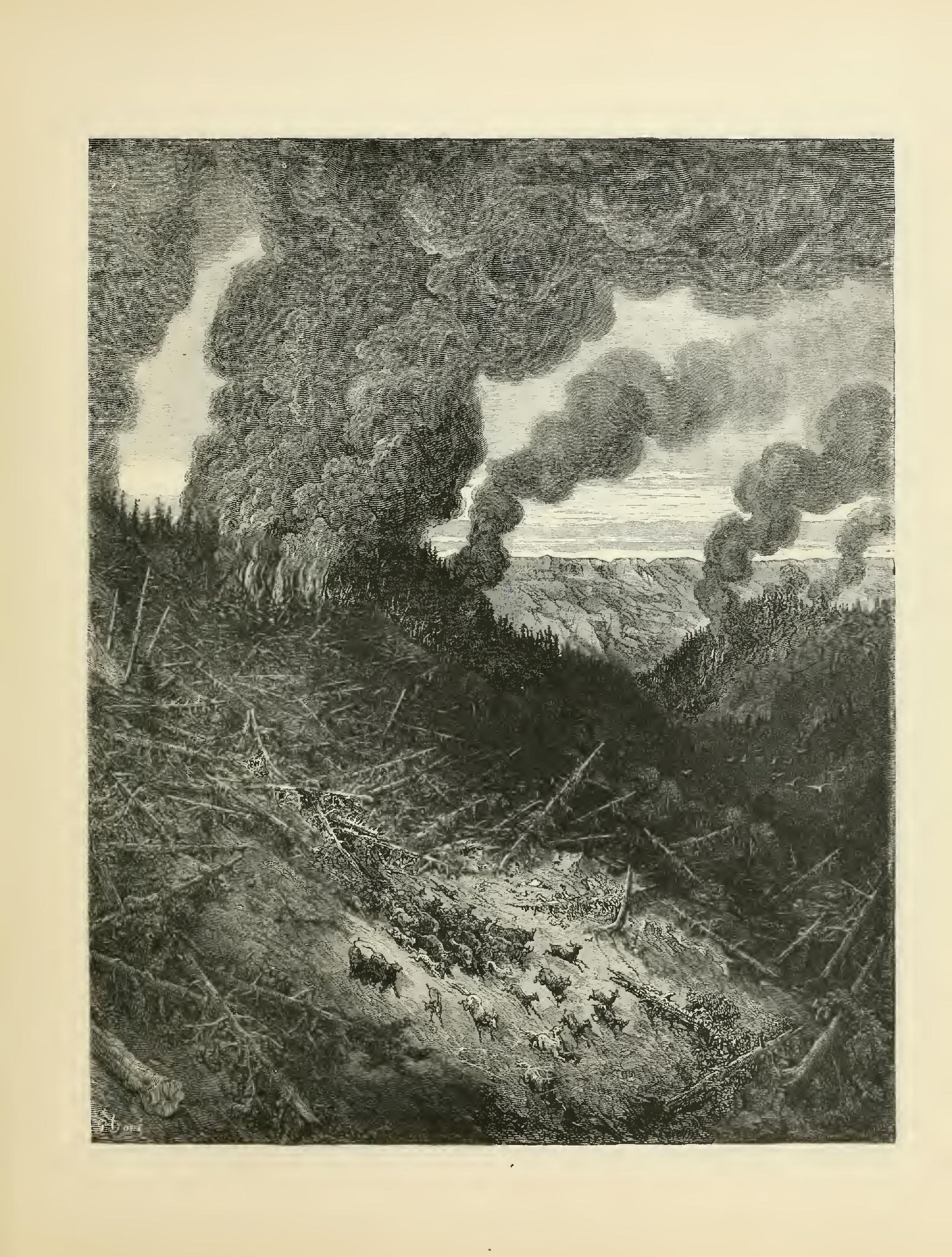 The illustrations of M. Doré have given an additional value to this tale, so simple, so unsophisticated, yet blooming with all the wild luxuriance of nature. The artist has added his gifts to those of the poet; and those acquainted only with his ready and original powers as the delineator of farce and drollery, or of the exceptionally tragic and horrible, will find new cause for admiration in these quiet renderings of the primeval beauties of the American wild—its plains and forests, its still lagoons and roaring cataracts, its mountain slopes and deep defiles—all its aspects of rudest workmanship—and will welcome these efforts of his genius in the lovely realm of descriptive art, wedded as they are to the exquisite simplicity of this Indian romance. As in his other works, here may be noted the same surpassing fertility of resource, the same alertness of intellect and readiness and swiftness of touch; but there may also be found new proofs of his complete sympathy with all that is picturesque in forest beauty and his high intuitive perception of every possible phase of nature in her wildest caprice and most tender bloom.