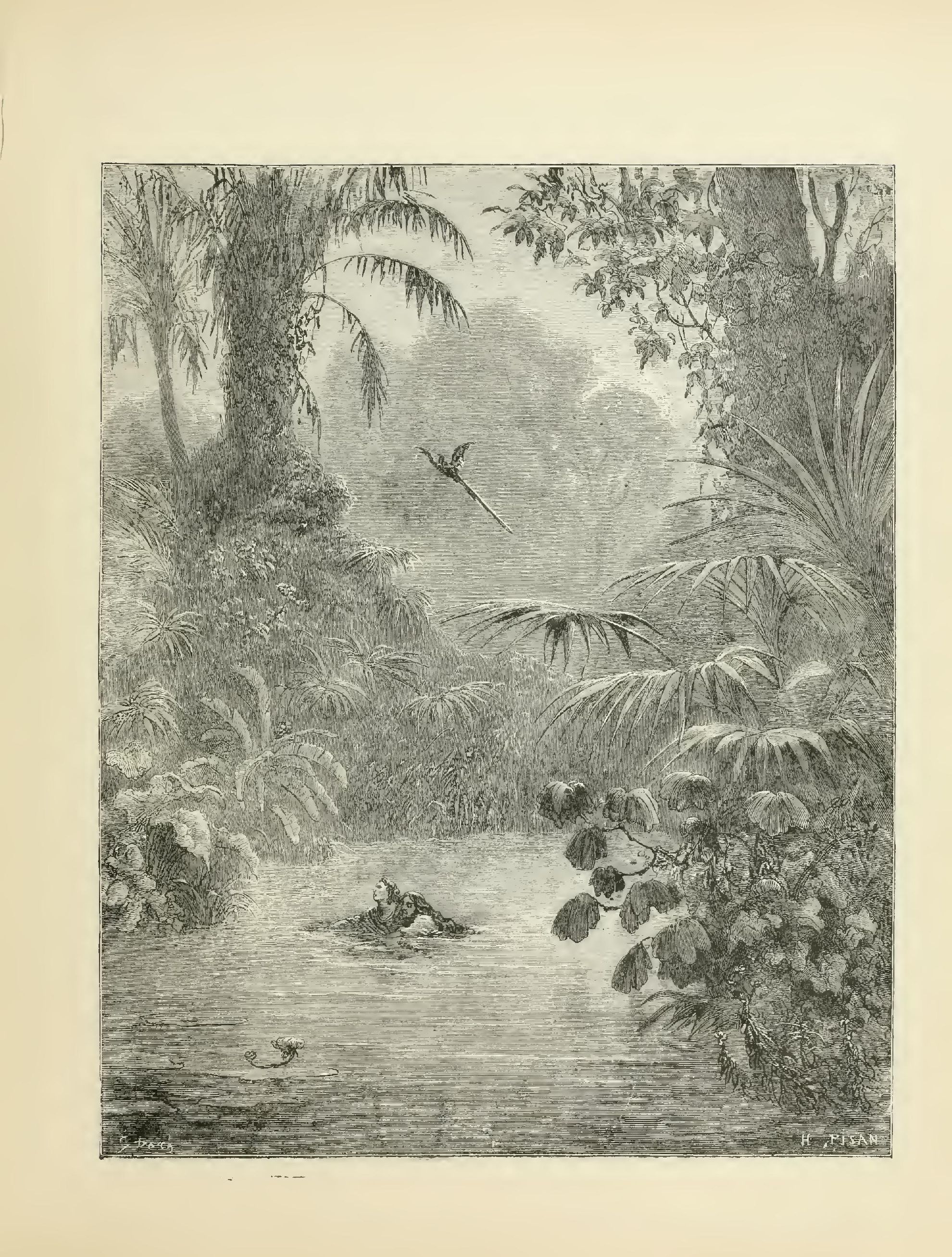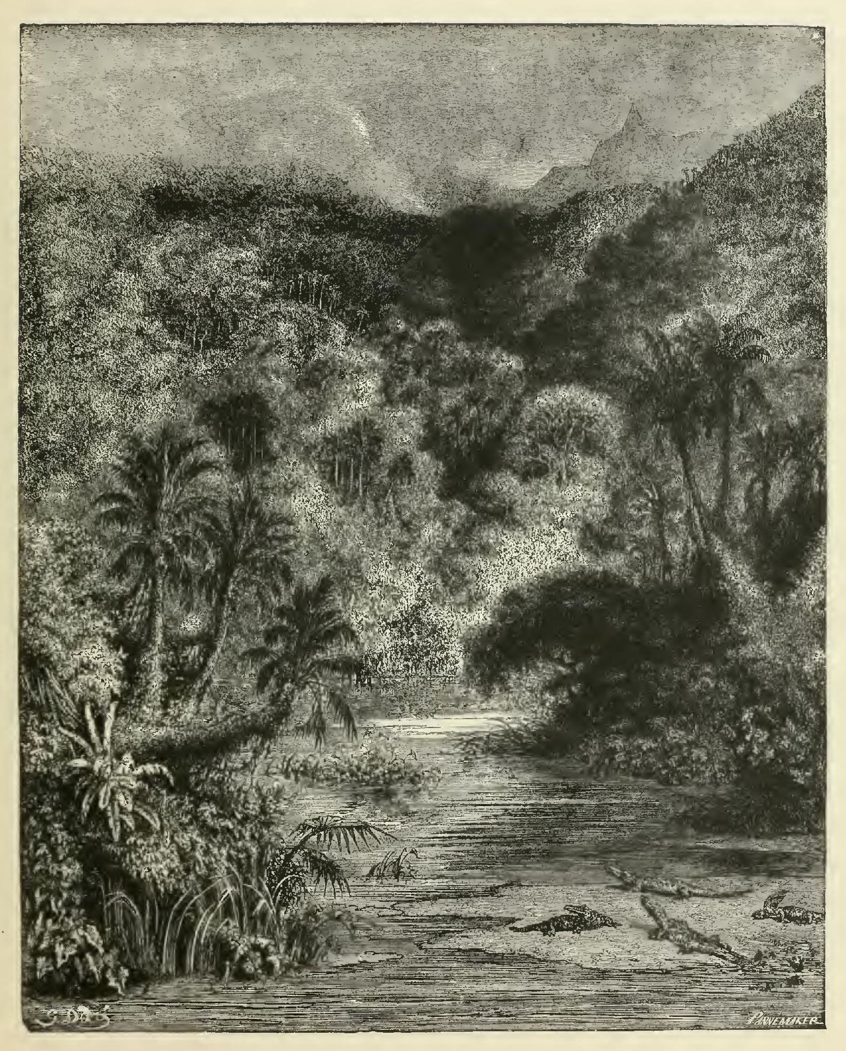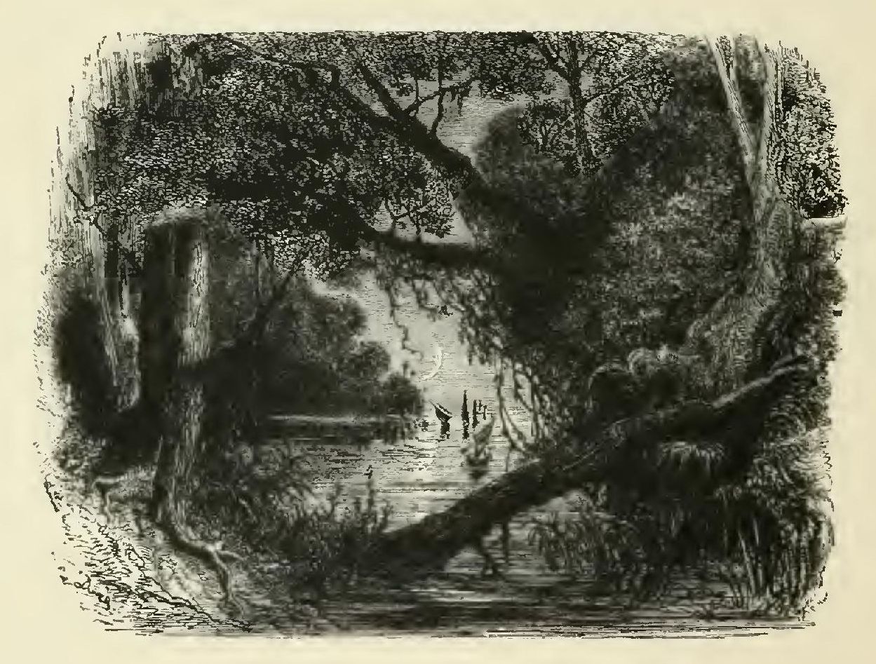 The last-named river, in its course of more than a thousand leagues, waters a delicious country, called by the inhabitants of the United States the New Eden, to which the French left the pretty appellation of Louisiana. A thousand other rivers, tributaries of the Mississippi—the Missouri, the Illinois, the Arkansas, the Wabache, the Tennessee—enrich it with their mud and fertilize it with their waters. When all these rivers have been swollen by the deluges of winter, uprooted trees, forming large portions of forests torn down by tempests, crowd about their sources. In a short time the mud cements the torn trees together, and they become enchained by creepers, which, taking root in every direction, bind and consolidate the débris. Carried away by the foaming waves, the rafts descend to the Mississippi, which, taking possession of them, hurries them down towards the Gulf of Mexico, throws them upon sandbanks, and so increases the number of its mouths. At intervals the swollen river raises its voice whilst passing over the resisting heaps, and spreads its overflowing waters around the colonnades of the forests, and the pyramids of the Indian tombs: and so the Mississippi is the Nile of these deserts. But grace is always united to splendor in the scenes of Nature: while the mid-stream bears away towards the sea the dead trunks of pine-trees and oaks, the lateral currents on either side convey along the shores floating islands of pistias and nenuphars, whose yellow roses stand out like little pavilions. Green serpents, blue herons, pink flamingoes, and baby crocodiles embark as passengers on these rafts of flowers; and the brilliant colony, unfolding to the wind its golden sails, glides along slumberingly till it arrives at some retired creek in the river.