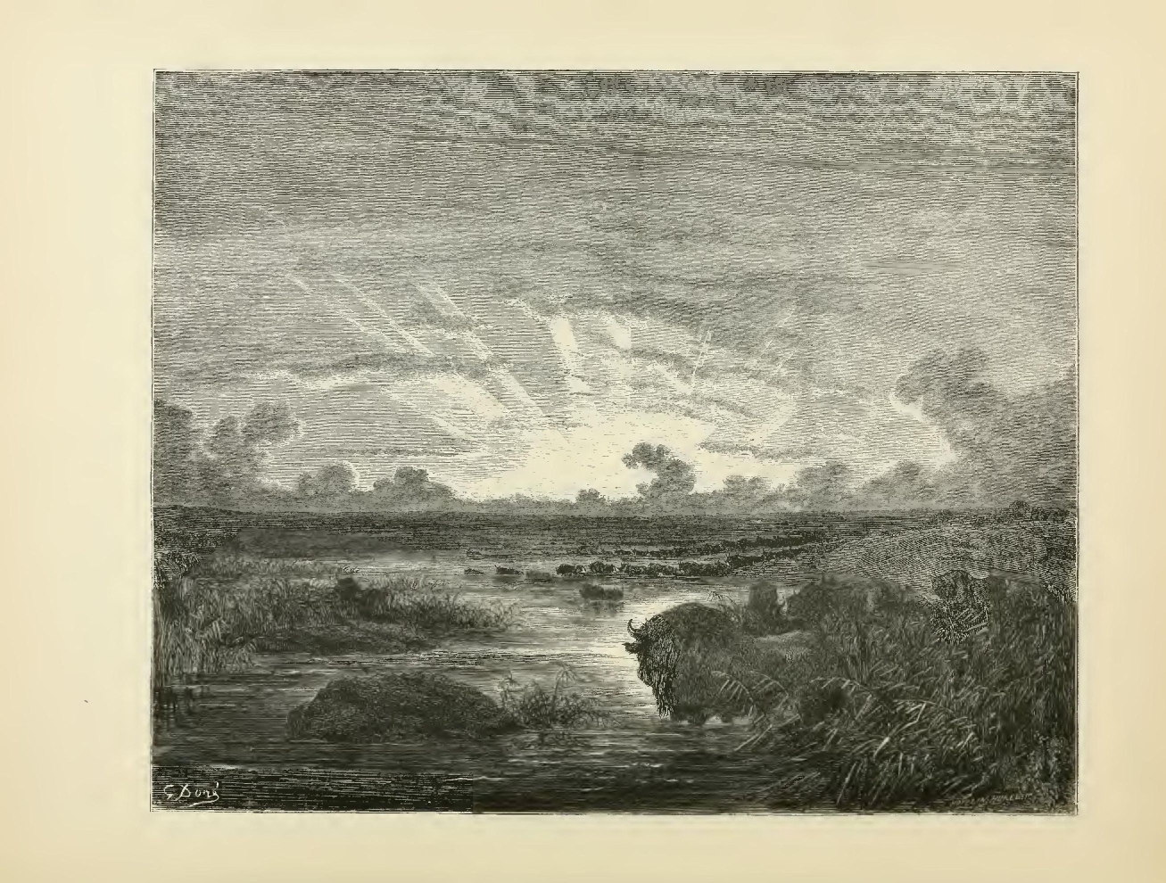 The two shores of the Mississippi present the most extraordinary picture. On the western border vast savannahs spread away farther than the eye can reach, and their waves of verdure, as they recede, appear to rise gradually into the azure sky, where they fade away. In these limitless meadows herds of three or four thousand wild buffaloes wander at random. Sometimes, cleaving the waters as it swims, a bison, laden with years, comes to repose among the high grass on an island of the Mississippi, its forehead ornamented with two crescents, and its ancient and slimy beard giving it the appearance of a god of the river throwing an eye of satisfaction upon the grandeur of its waters, and the wild abundance of its shores.