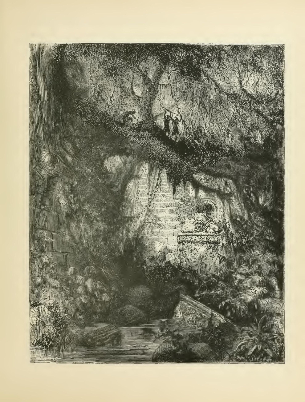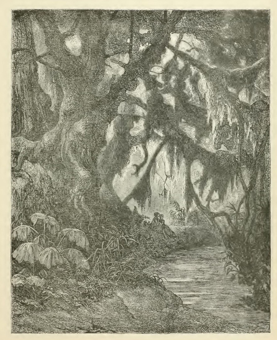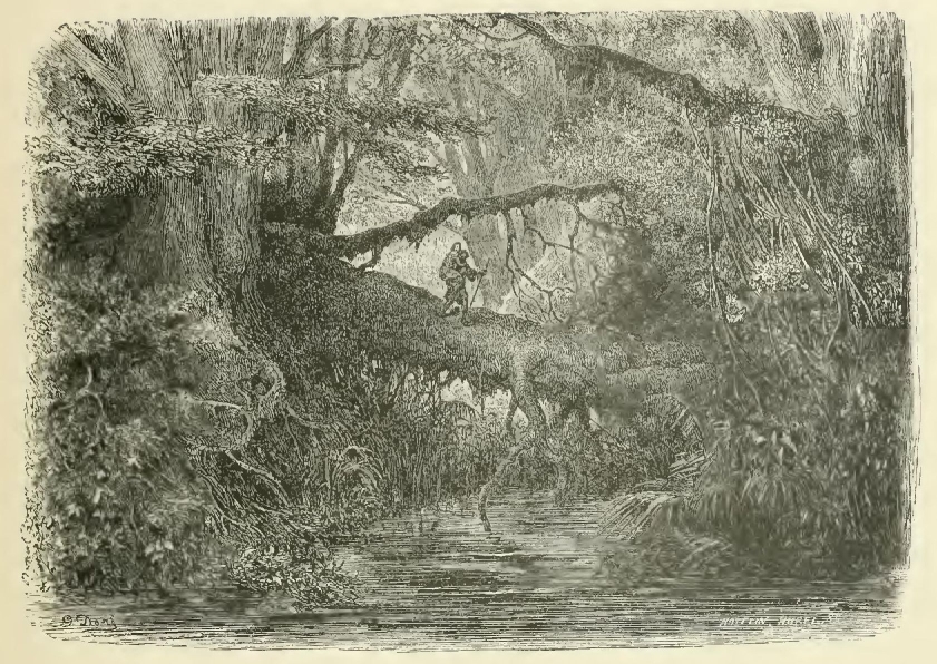 Such is the scene upon the western border; but it changes on the opposite side, which forms an admirable contrast with the other shore. Suspended along the course of the waters, grouped upon the rocks and upon the mountains, and dispersed in the valleys, trees of every form, of every color, and of every perfume, throng and grow together, stretching up into the air to heights that weary the eye to follow. Wild vines, bignonias, coloquintidas, intertwine each other at the feet of these trees, escalade their trunks, and creep along to the extremity of their branches, stretching from the maple to the tulip-tree, from the tulip-tree to the holly-hock, and thus forming thousands of grottoes, arches and porticoes. Often, in their wanderings from tree to tree, these creepers cross the arm of a river, over which they throw a bridge of flowers. Out of the midst of these masses, the magnolia, raising its motionless cone, surmounted by large white buds, commands all the forest, where it has no other rival than the palm-tree, which gently waves, close by, its fans of verdure.