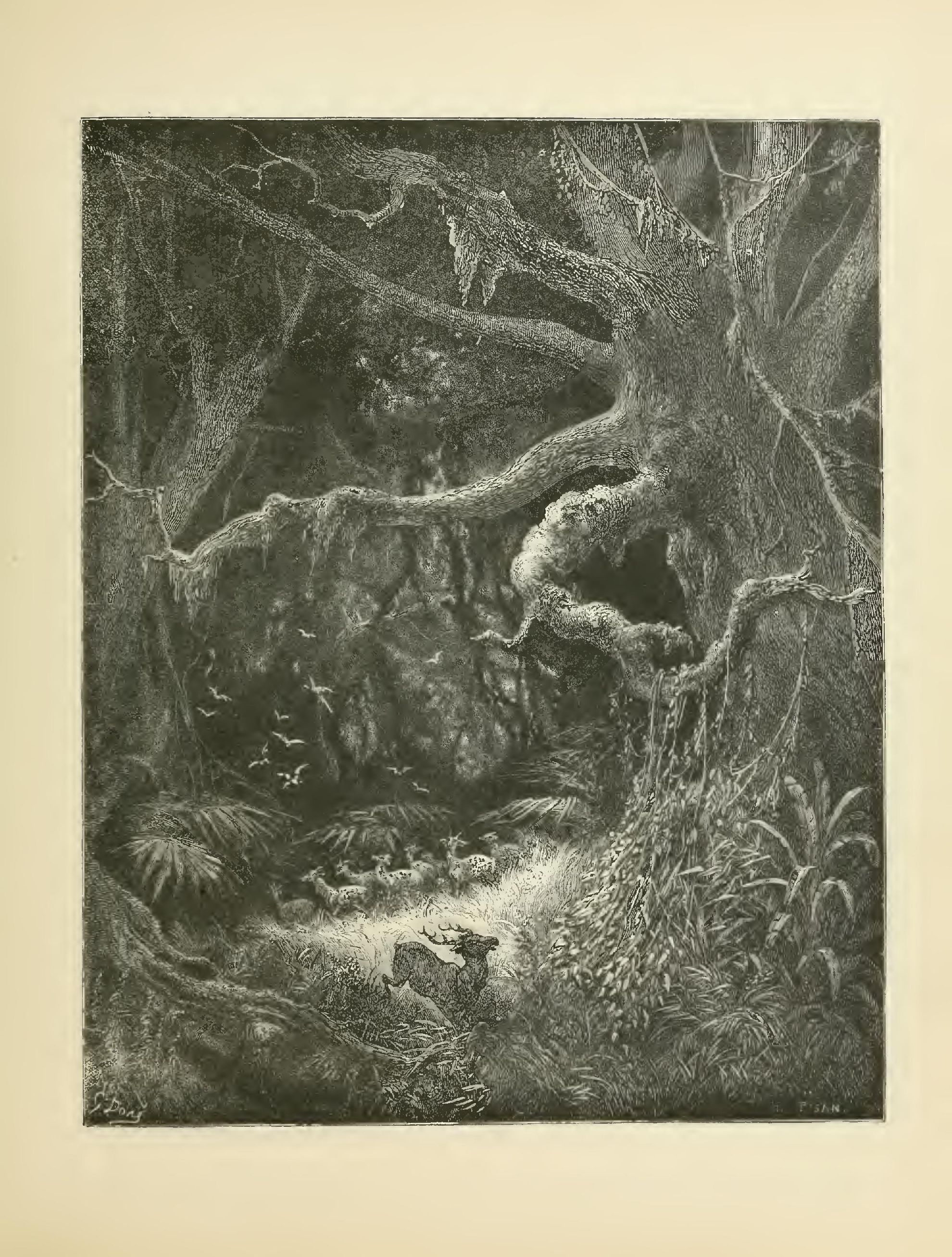 A multitude of animals, placed in these retreats by the hand of the Creator, spread about life and enchantment. From the extremities of the avenues may be seen bears, intoxicated with the grape, staggering upon the branches of the elm-trees; cariboos bathe in the lake; black-squirrels play among the thick foliage; mocking-birds, and Virginian pigeons not bigger than sparrows, fly down upon the turf, reddened with strawberries; green parrots with yellow heads, purple woodpeckers, cardinals red as fire, clamber up to the very tops of the cypress-trees; humming-birds sparkle upon the jessamine of the Floridas; and bird-catching serpents hiss while suspended to the domes of the woods, where they swing about like the creepers themselves.