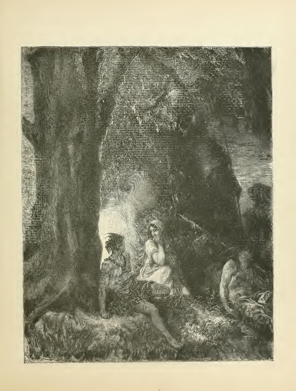 “The next day, which decided the fate of my life, we halted in a valley not far from Cuscowilla, the capital of the Seminoles. These Indians, together with the Muscogulges, form the confederation of the Creeks. The daughter of the land of palm-trees came to find me in the middle of the night. She conducted me to a great pine-forest, and renewed her entreaties to induce me to escape. Without replying to her, I took her hand in mine, and forced the thirsting fawn to wander with me into the forest. The night was delicious. The genius of the air appeared to be shaking the blue canopy, embalmed with the odor of the pines; and we breathed a slight perfume of amber emitted by the crocodiles asleep beneath the tamarind-trees by the river-side. The moon was shining in the midst of a spotless azure, and the pearl-grey light fell upon the undefined summit of the forests. Not a sound was to be heard, except I know not what distant harmony that reigned in the depth of the woods. It seemed as though the soul of solitude was sighing throughout the entire extent of the desert.