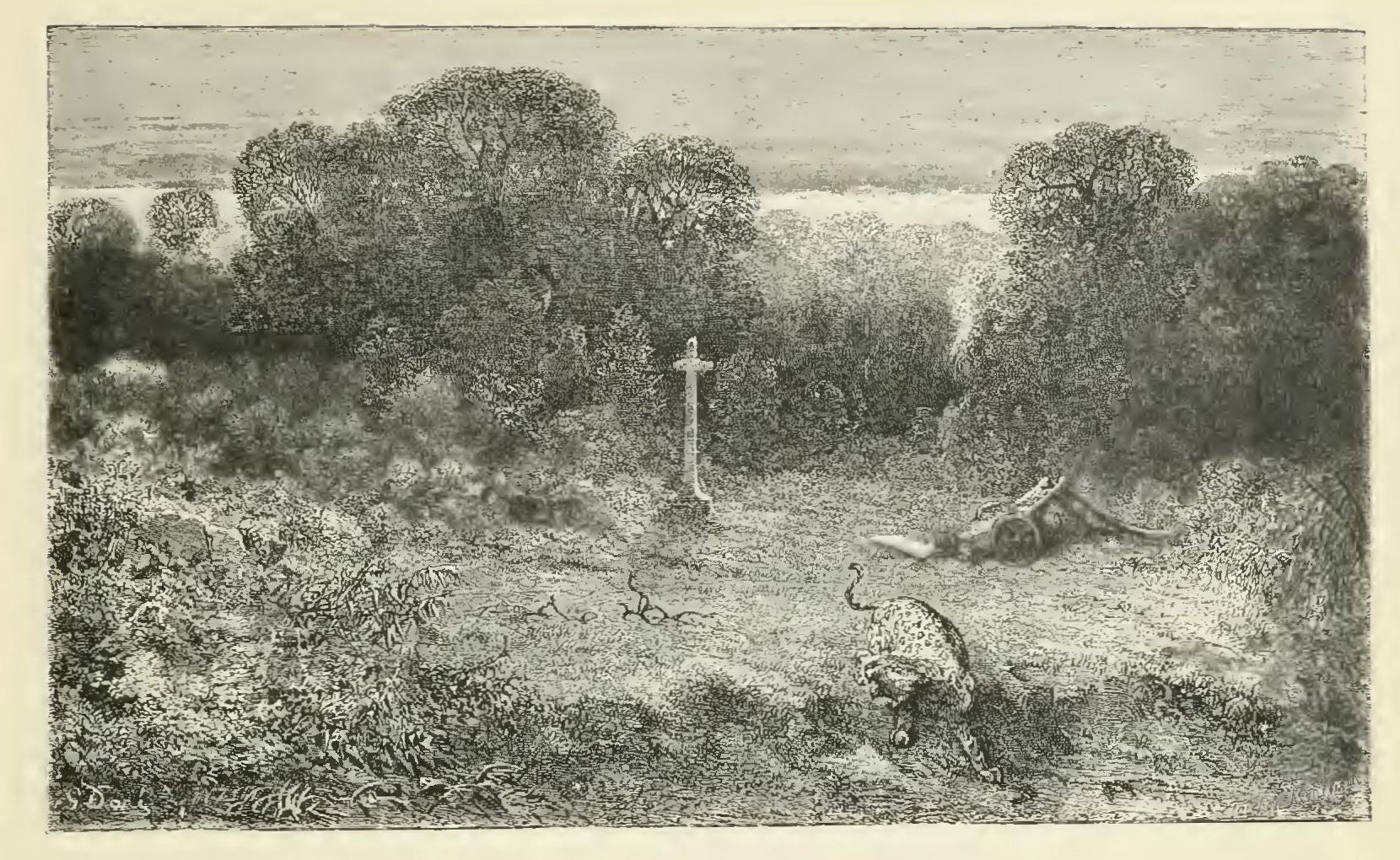“After having sought the tomb of his sister and of the hermit in vain, he was on the point of abandoning the spot, when the fawn from the grotto set to leaping in front of him. She stopped at the foot of the Mission cross. That cross was then half surrounded by water; the wood of it was covered with moss, and the pelican of the wilderness loved to perch upon its worm-eaten arms. Chactas judged that the graceful fawn had led him to the tomb of his host.