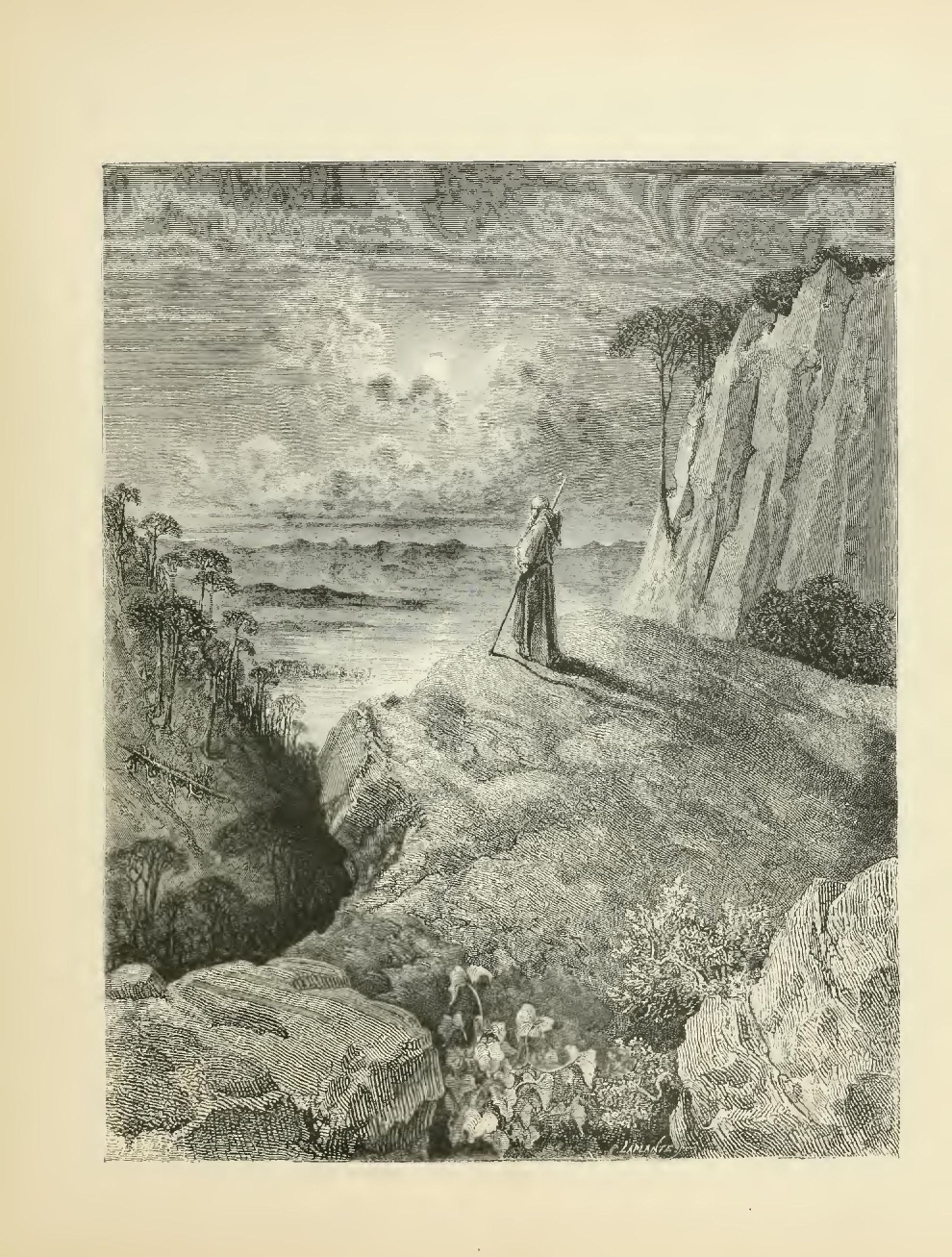 “During this time a child was presented to the missionary, who baptized it among the flowering jessamine on the border of a spring, whilst a coffin, in the midst of these joys and labors, was being carried to the Groves of Death. Two spouses received the nuptial benediction beneath an oak, and we afterwards went to install them in a corner of the desert. The pastor walked in front of us, blessing here and there a rock, a tree or a fountain, as of old, according to the book of the Christians, God blessed the untilled land when He gave it to Adam for an inheritance. This procession, which, with the flocks, was following its venerable chief from rock to rock, represented to my affected heart the migrations of the first families, when Shem, with his children, advanced into an unknown world, following the sun as his guide.
