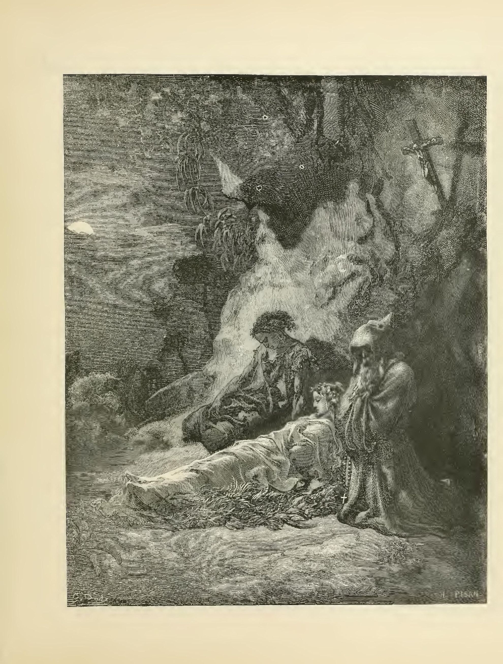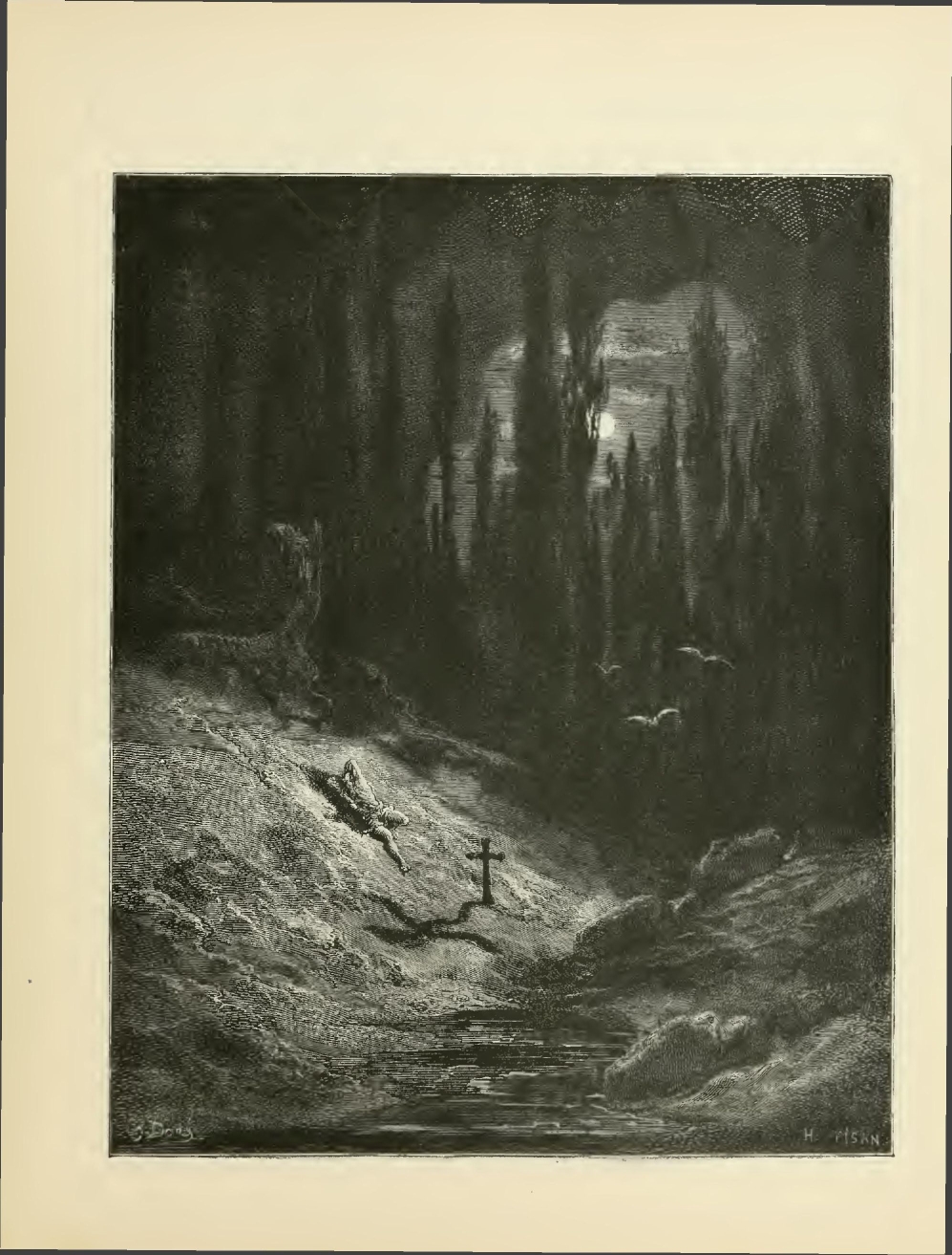 “The moon lent her pale light to this funereal watching; she rose in the middle of the night, like a white vestal come to weep over the coffin of a companion. From time to time the monk dipped a flowering branch into the holy water, and shaking its moistened leaves, perfumed the night air with heavenly balms. Occasionally also he repeated, to an ancient tune, these verses by an old poet named Job:
