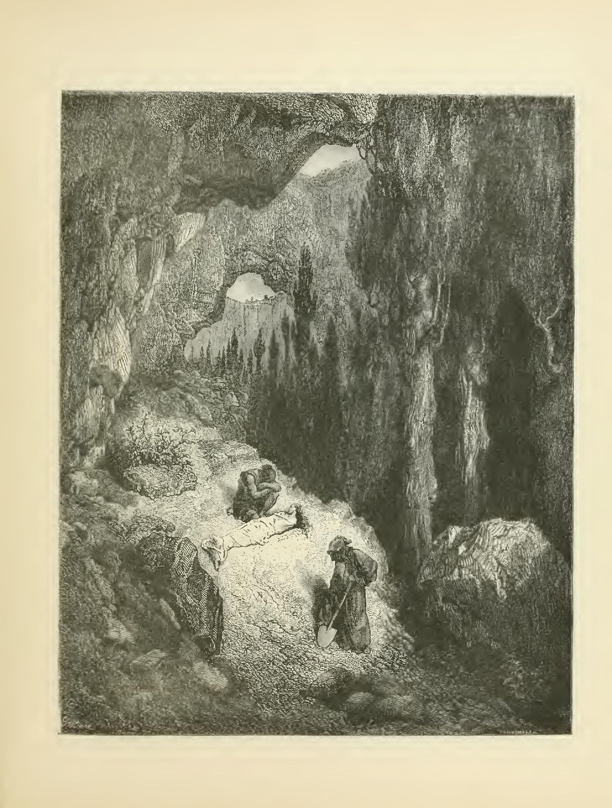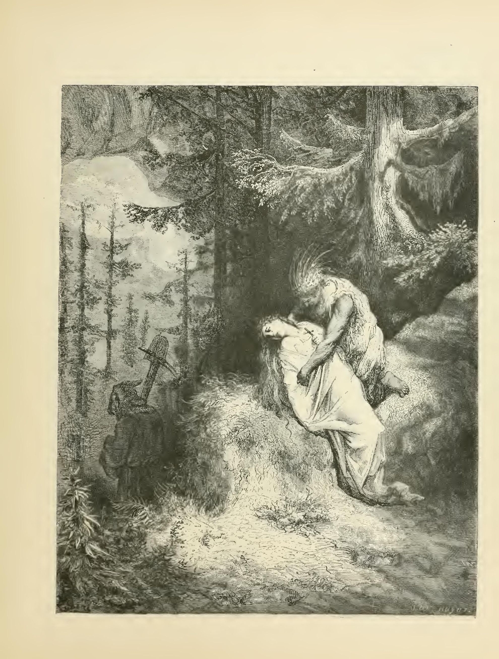 “Nevertheless, a bar of gold was forming in the east. The sparrow-hawks were crying upon the rocks, and the martins creeping back into the hollows of the elm-trees: these were so many signs that the time had come for Atala’s interment. I took the body on my shoulders; the hermit walked in front of me, carrying a spade in his hand. We commenced the descent from rock to rock; old age and death combined equally to slacken our pace. At the sight of the dog which had found us in the forest, and which now, jumping with joy, led us by another route, I melted into tears. Atala’s long hair, the plaything of the morning breezes, frequently threw its golden veil over my eyes, and, bending beneath the burden, I was obliged to lay it down often upon the moss, and sit awhile, to recover my strength. At length we arrived at the spot selected by my grief, and we entered beneath the arch of the bridge. O my son, you should have seen the youthful savage and the old hermit, on their knees in front of each other, in the desert, digging with their hands a grave for the poor girl whose body lay stretched out close at hand, in the dried-up bed of a torrent!