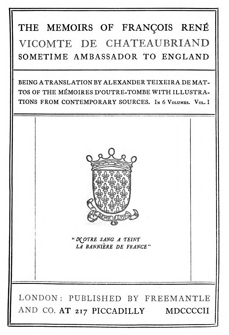 The British Museum Library contains two attempts at a translation. One, published in the "Parlour Library of Instruction," is entitled, "An Autobiography. By François René, Viscount de Chateaubriand.[Pg xv] London and Belfast: Simms & M'Intyre, 1849." It consists of four slim volumes containing in all less than half of the work. The other appeared, under the title of "Memoirs of Chateaubriand. Written by Himself. London: Henry Colburn, 1848-49. To be completed in ten parts," in "Colburn's Standard Library." Only three parts were published, embracing not more than a quarter of the Mémoires d'Outre-tombe.