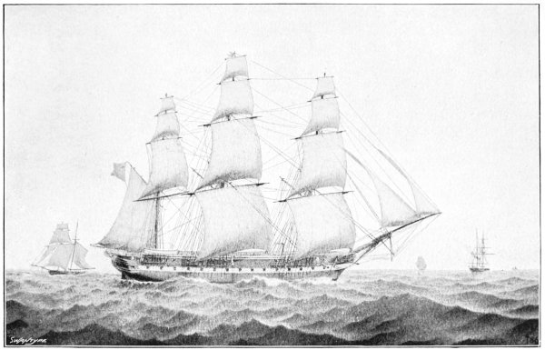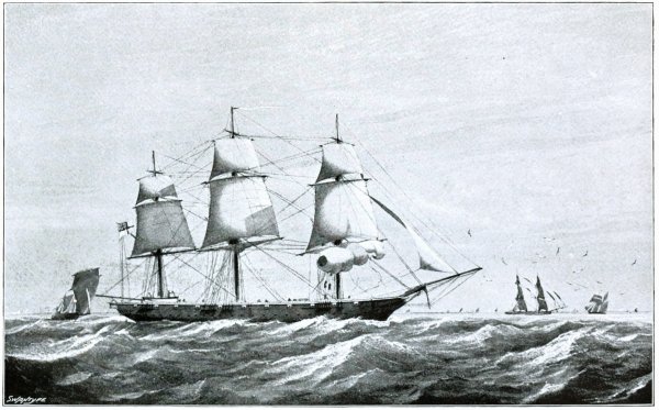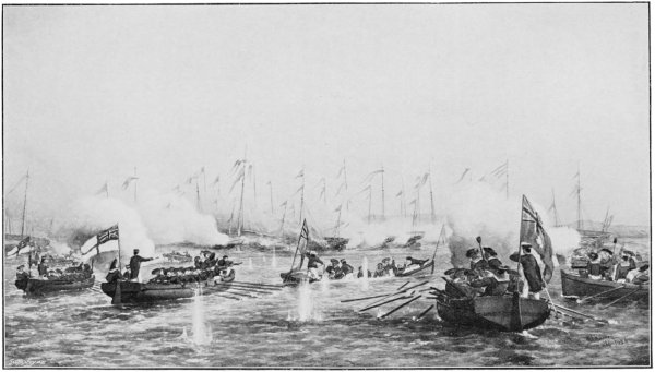 It was blowing a fresh gale when we took our wherry from the Hard at Portsmouth, and the double-fare flag was flying on the official tower; but go we must, though our boatman seemed to suggest that we should have a bad time of it outside; and so it turned out, for, besides being drenched to the skin on a cold December day, the butler and I, when we got alongside the noble10 ship, were sea-sick. My first obeisance to the Quarter-Deck—(I had been warned to be very particular about this)—must have lacked finish. My troubles were not over with that ceremony. I had hardly finished saluting the officer of the watch when a blue-jacket fell from out of the main-rigging on to a quarter-deck gun within a yard of me. He was killed instantly, and the sight was very painful.
