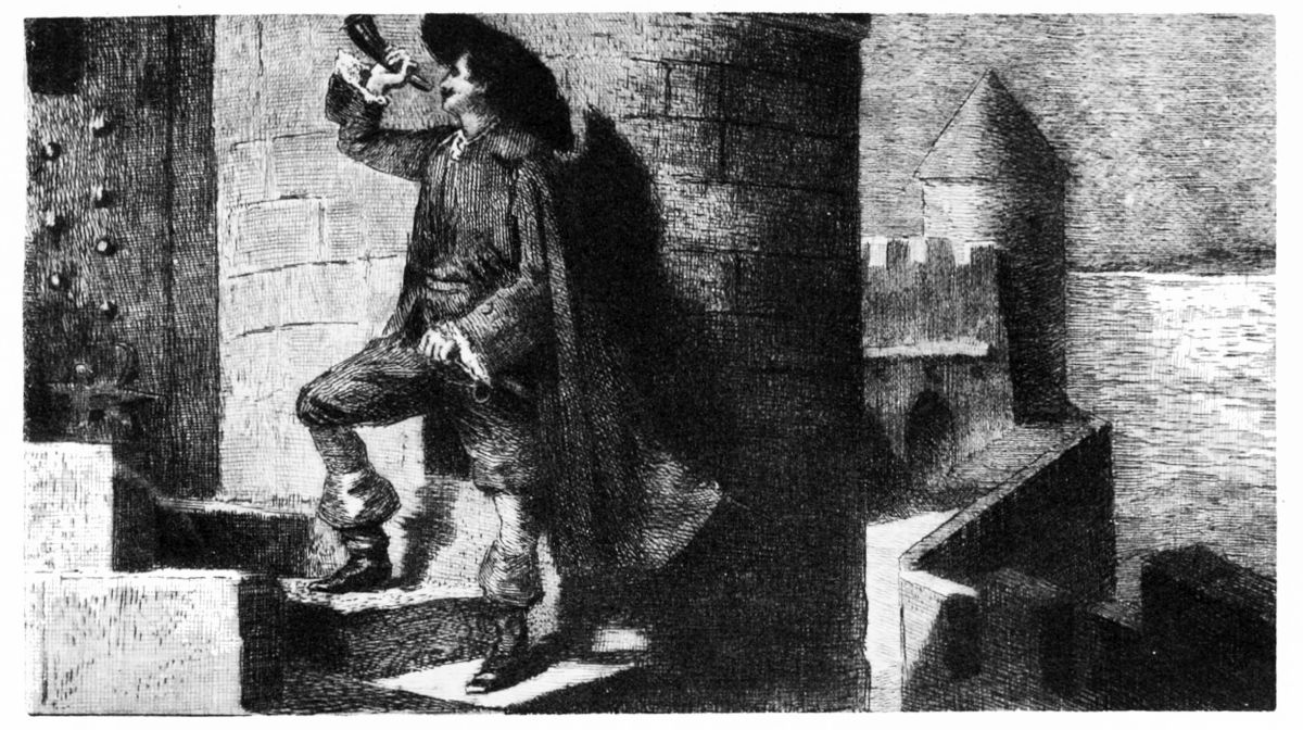 The crowd steadily increased. Just at this instant, a young man who was crossing the wharf, seeing the mob of people, dismounted from his horse, handed the bridle to the servant behind him, and entered the Spladgest. He wore a simple travelling dress, was armed with a sword, and wrapped in a large green cloak; a black plume, fastened to his hat by a diamond buckle, fell over his noble face and waved to and fro upon his lofty brow, shaded by{32} chestnut hair; his boots and spurs, soiled with mud, showed that he had come a long distance.