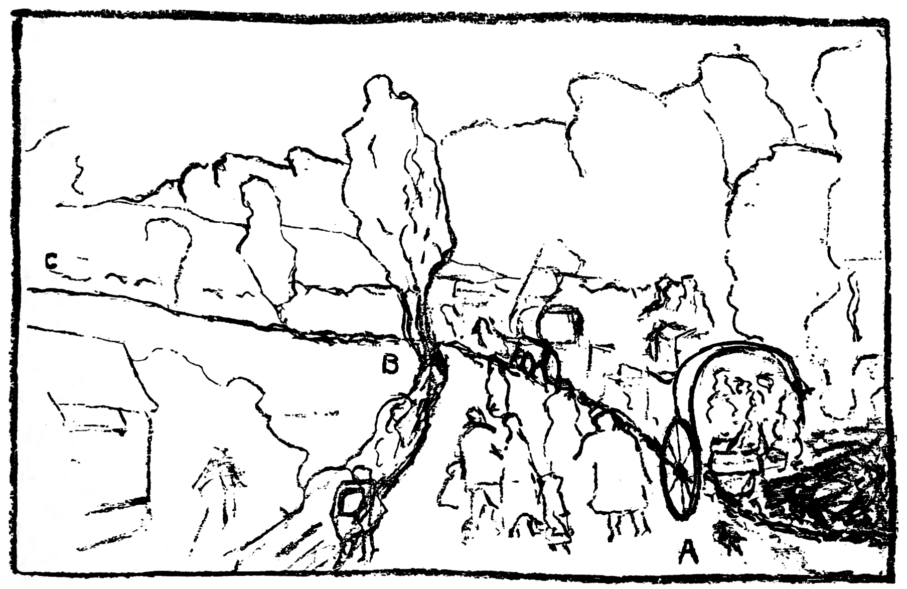 Study the plan of the pictorial design and you will see that as soon as the man has emerged from the shadows in the background he becomes the strongest accent in an area of white. The end of the alley from which he comes is accented by the jagged white shape above the shadows, and the doorway through which167 he goes is similarly accented by irregular shapes. These two accents keep the composition in balance, and when our glance passes from one to the other the path of attention must cross the area of central interest. There is rhythm in the composition, too, though one would scarcely realize it at first glance. Note the swinging curves in the white patch on the street and in the corresponding patch on the wall, and note also how some of these curves harmonize with the lines of the actor’s body and with his shadow upon the wall.