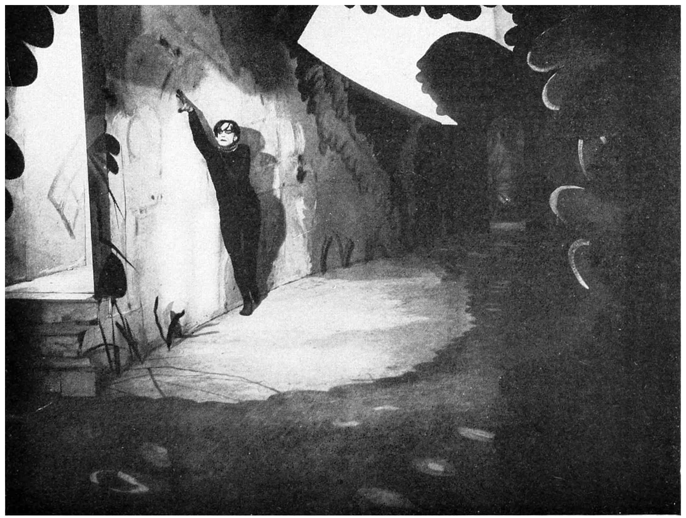 In the presence of all this the spectator feels that the screen has gone mad; yet he does not leave the theater, because his attention is chained and his emotions are beginning to surge with a peculiarly pleasing unrest. He stays and stares at the remarkable fitness of these crazy people in crazy places; for the story is, in fact, a madman’s fantasy of crimes committed by a sleep-walker under the hypnotic control of a physician who is the head of an insane asylum.