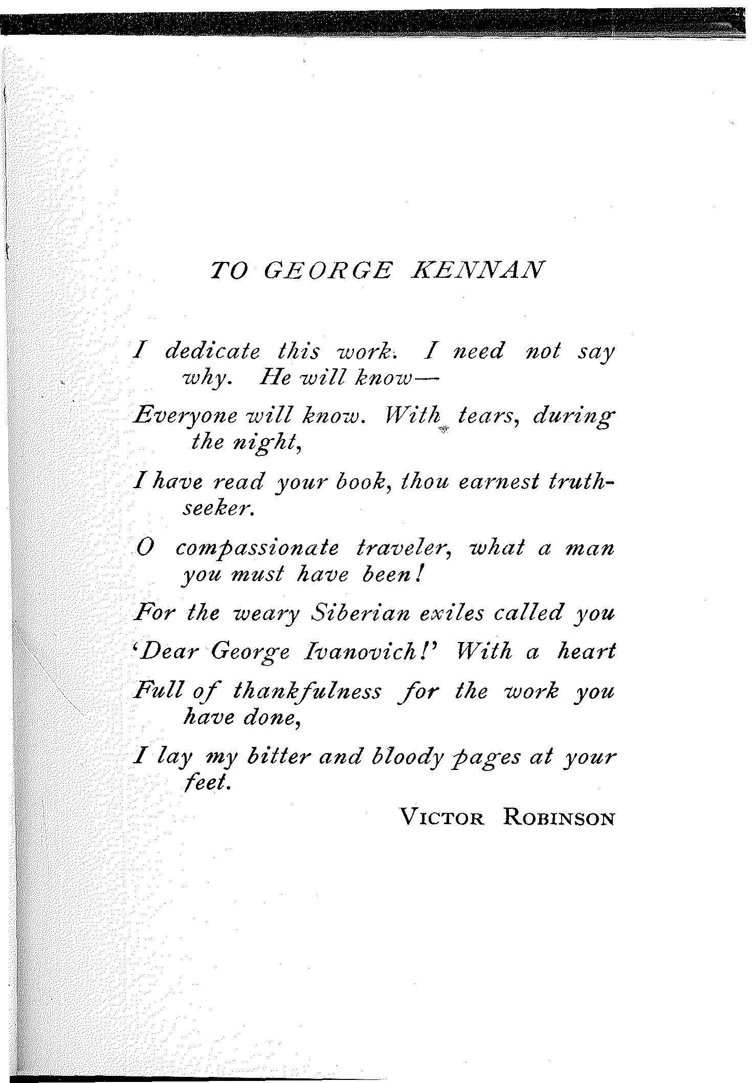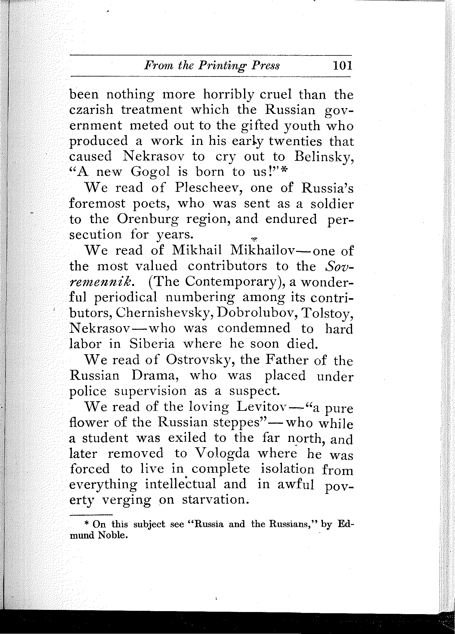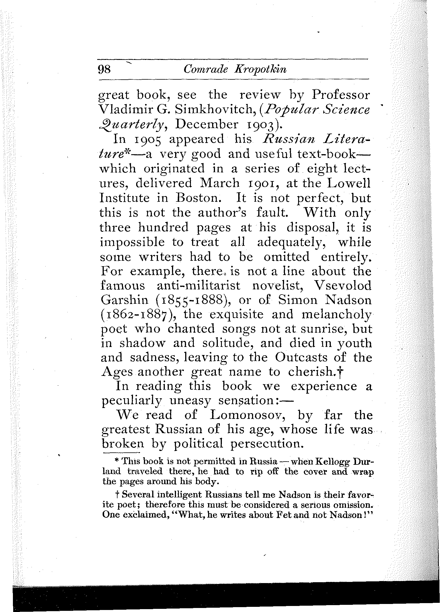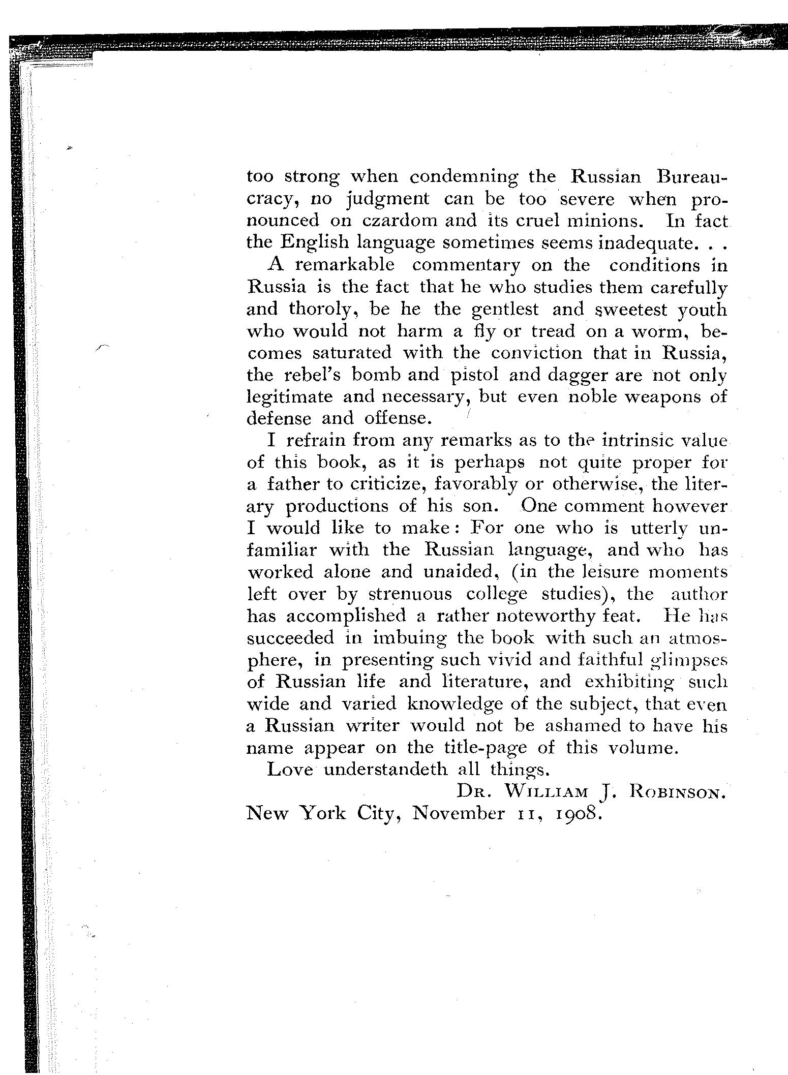 I refrain from any remarks as to the intrinsic value of this book, as it is perhaps not quite proper for a father to criticize, favorably or otherwise, the literary productions of his son. One comment however I would like to make: For one who is utterly unfamiliar with the Russian language, and who has worked alone and unaided, (in the leisure moments left over by strenuous college studies), the author has accomplished a rather noteworthy feat. He has succeeded in imbuing the book with such an atmosphere, in presenting such vivid and faithful glimpses of Russian life and literature, and exhibiting such wide and varied knowledge of the subject, that even a Russian writer would not be ashamed to have his name appear on the title-page of this volume.