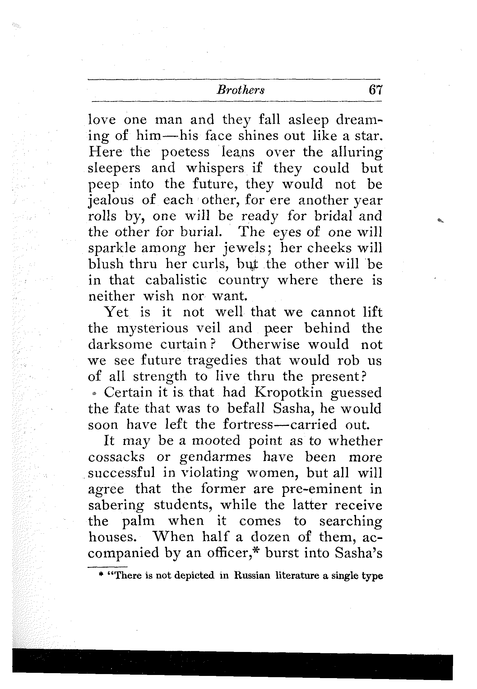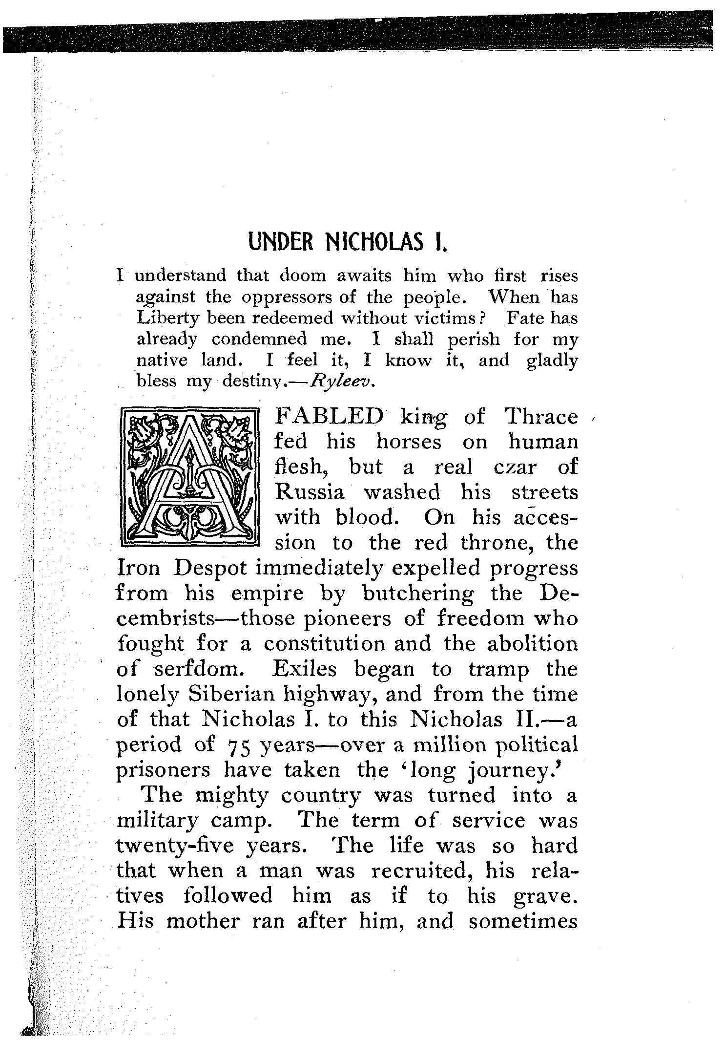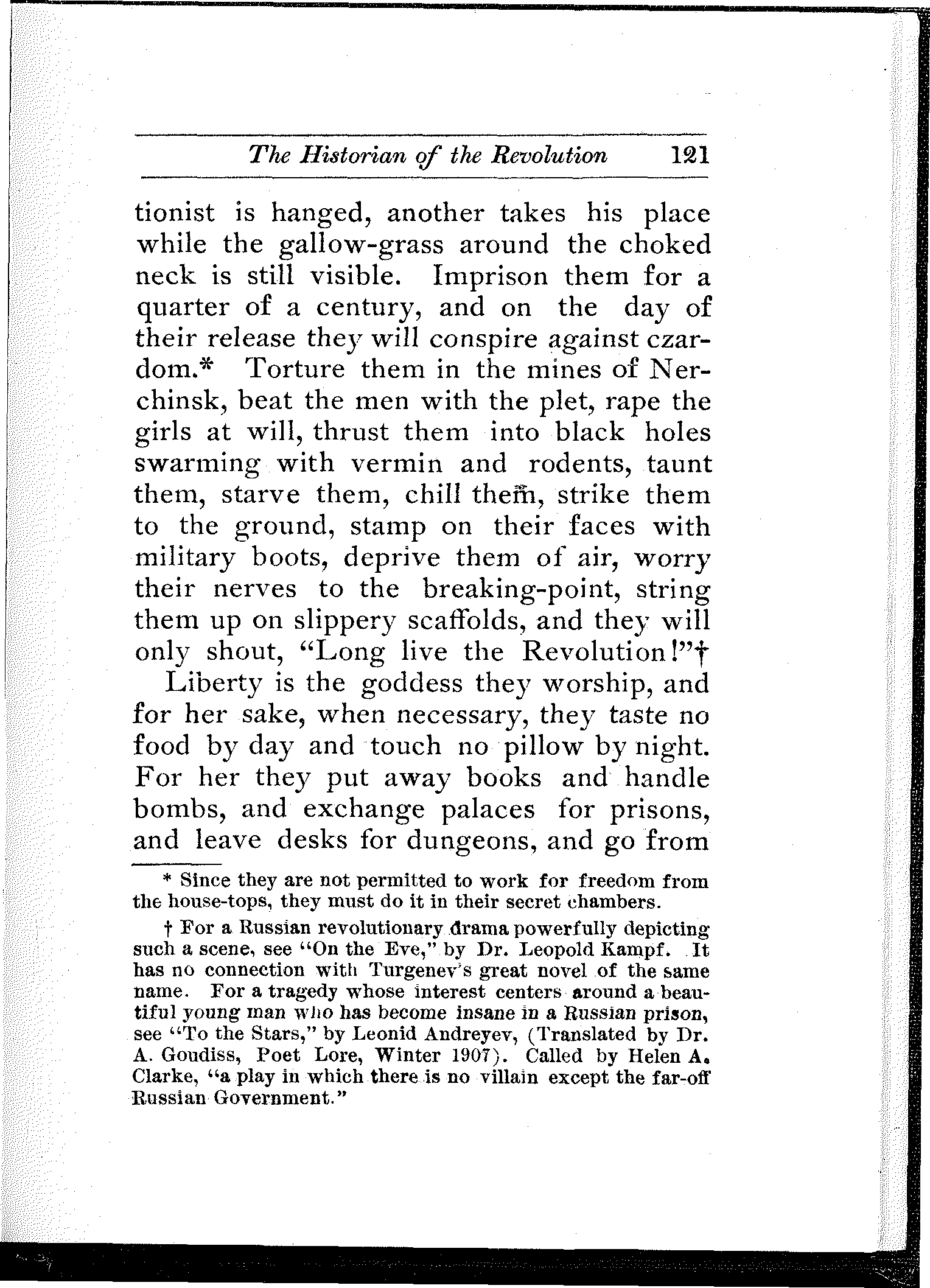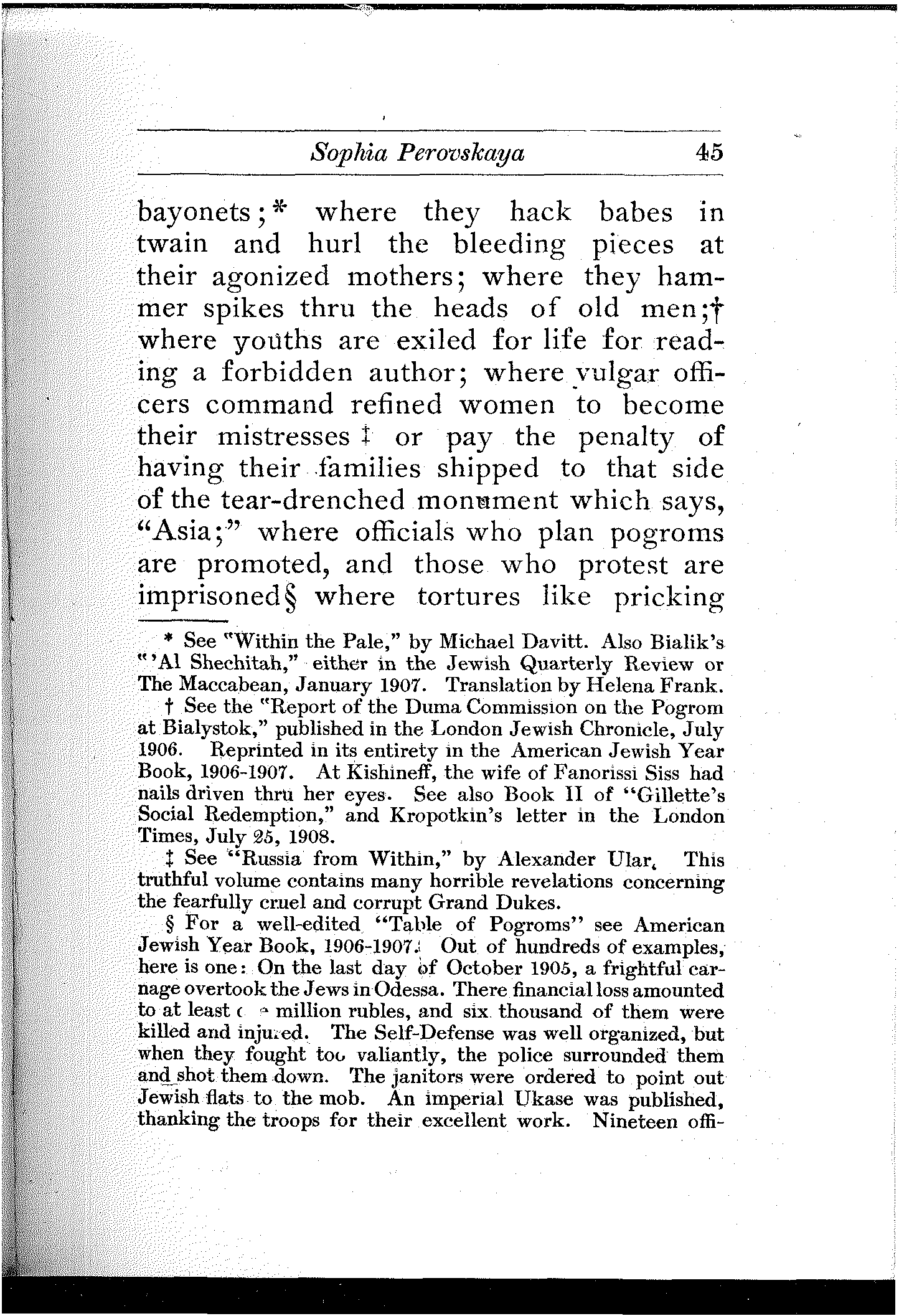 A wonderful and terrible thing is happening in the largest empire on earth; a downtrodden people is engaged in a death-grapple with its merciless rulers; and never were masters so inhuman, and never were people so heroic. In comparison with this titanic struggle the French Revolution itself sinks into insignificance. But what do we know about it? And what do we care? Russia is far away.... Once in a while the report of a particularly atrocious massacre, or a particularly cruel torture inflicted upon a young girl revolutionist will shock our sensibilities, will cause a pang in our hearts, will perhaps make our hair stand on end,—but in a day or two we forget all about it. We are so busy!