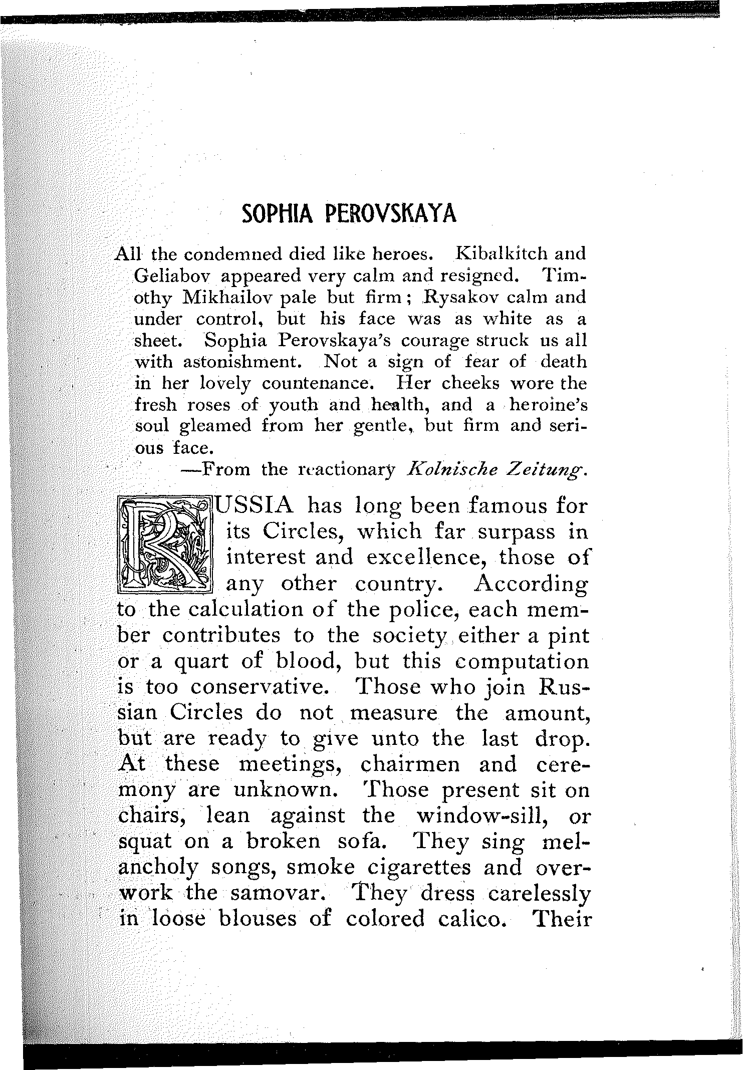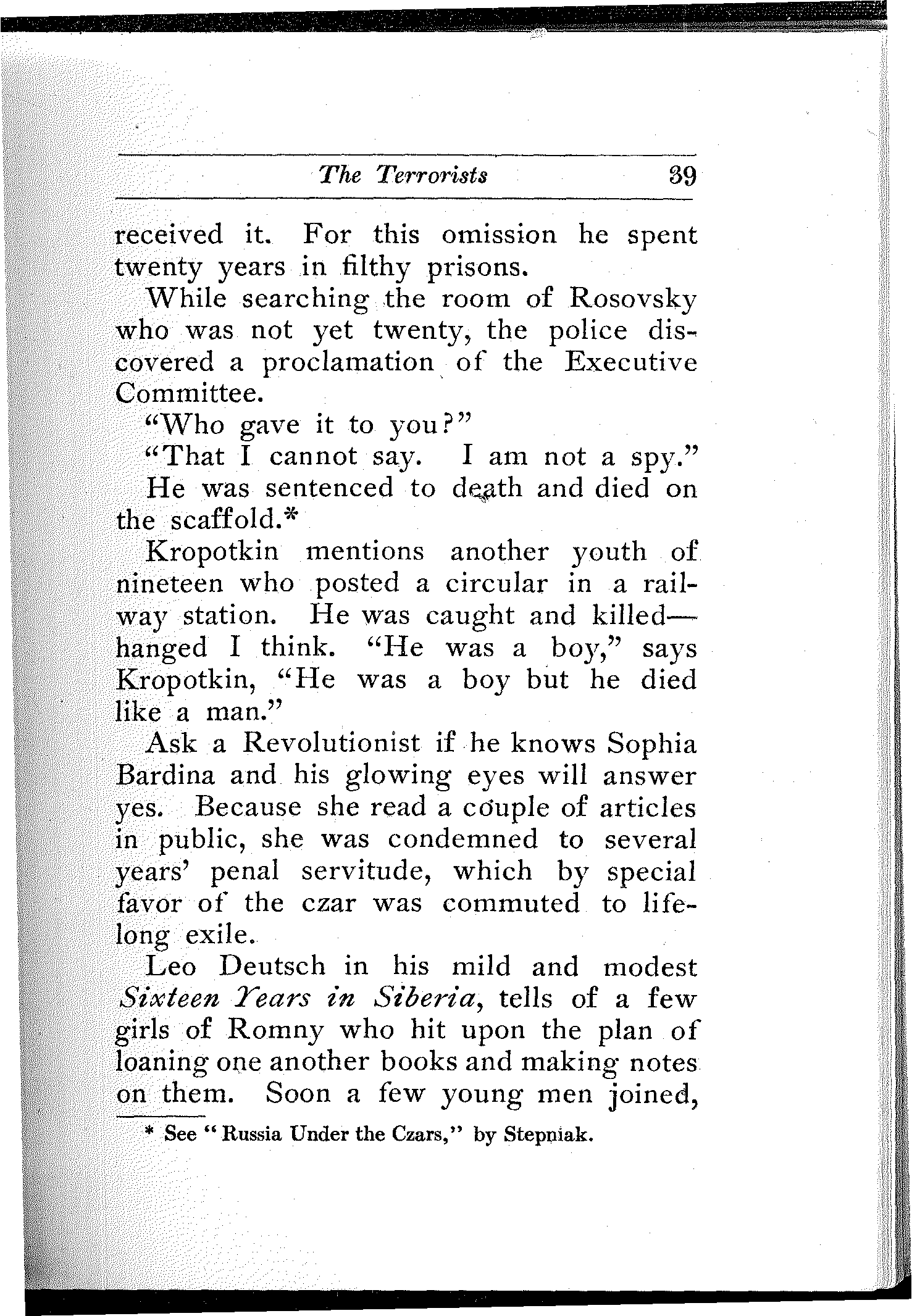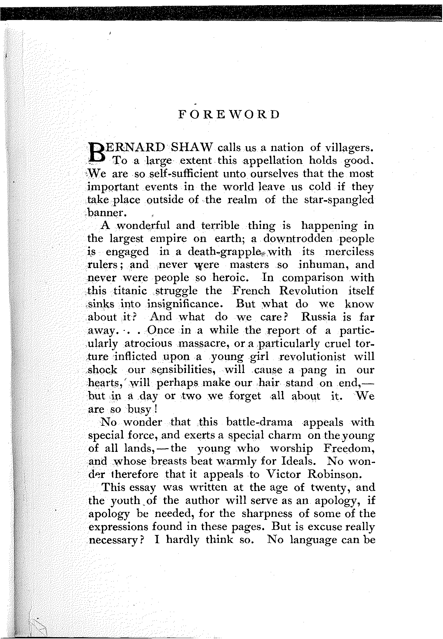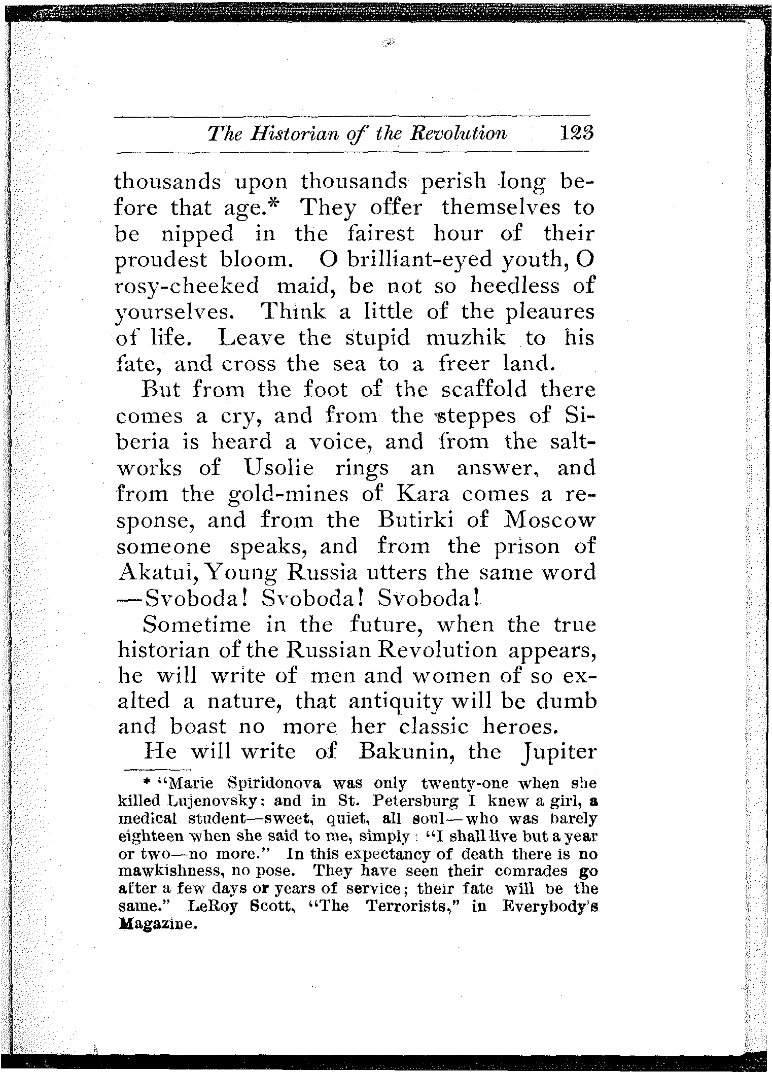 A wonderful and terrible thing is happening in the largest empire on earth; a downtrodden people is engaged in a death-grapple with its merciless rulers; and never were masters so inhuman, and never were people so heroic. In comparison with this titanic struggle the French Revolution itself sinks into insignificance. But what do we know about it? And what do we care? Russia is far away.... Once in a while the report of a particularly atrocious massacre, or a particularly cruel torture inflicted upon a young girl revolutionist will shock our sensibilities, will cause a pang in our hearts, will perhaps make our hair stand on end,—but in a day or two we forget all about it. We are so busy!
