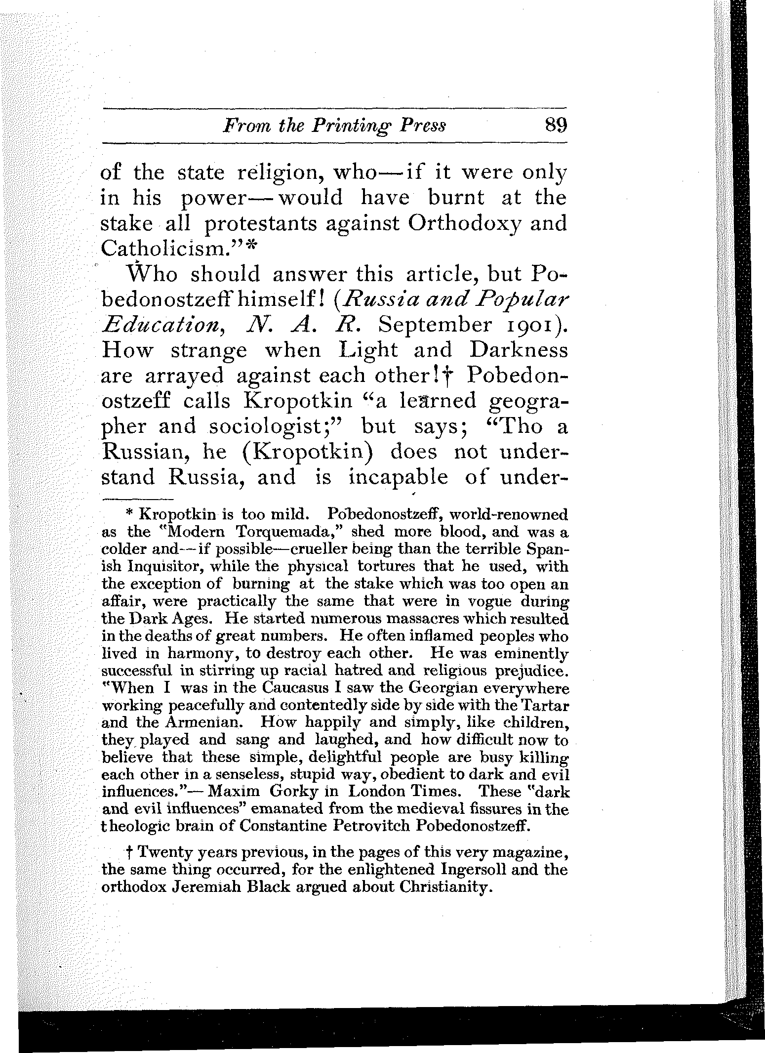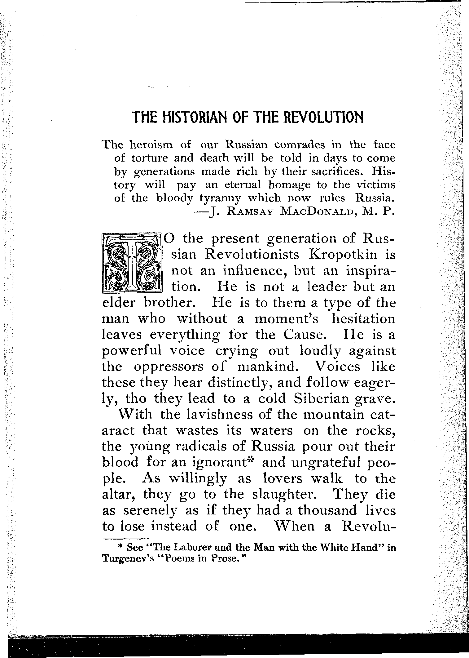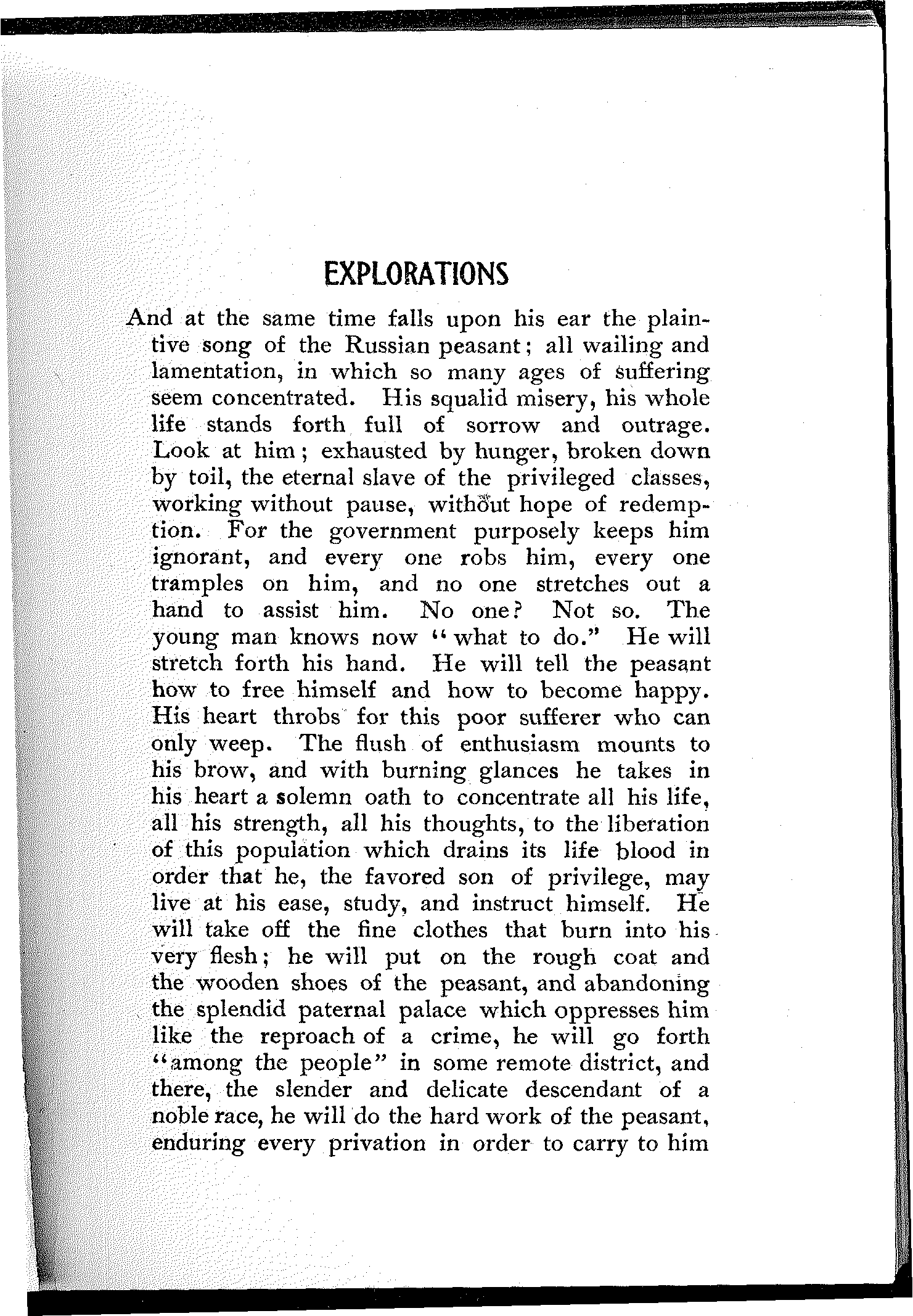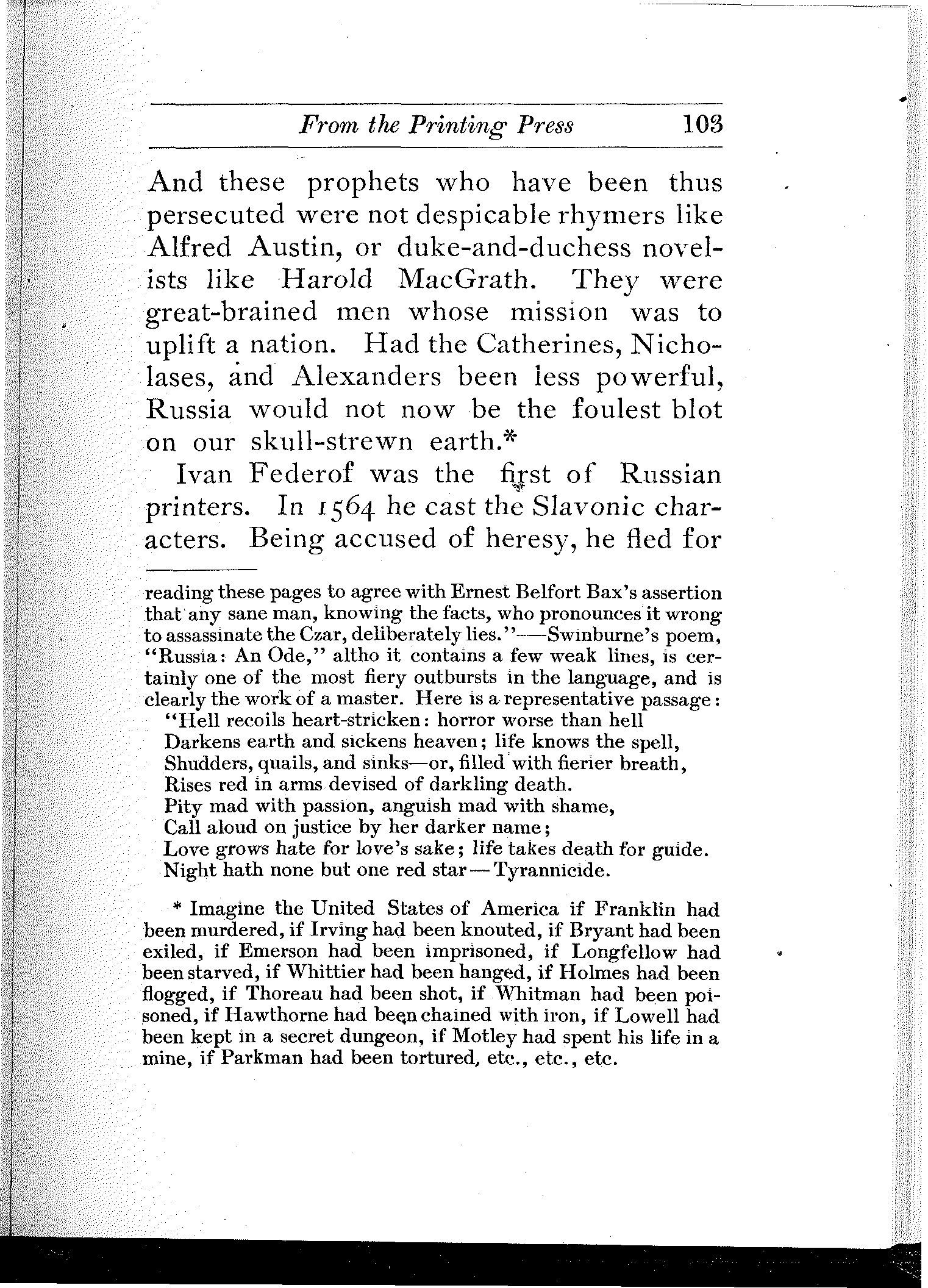 A wonderful and terrible thing is happening in the largest empire on earth; a downtrodden people is engaged in a death-grapple with its merciless rulers; and never were masters so inhuman, and never were people so heroic. In comparison with this titanic struggle the French Revolution itself sinks into insignificance. But what do we know about it? And what do we care? Russia is far away.... Once in a while the report of a particularly atrocious massacre, or a particularly cruel torture inflicted upon a young girl revolutionist will shock our sensibilities, will cause a pang in our hearts, will perhaps make our hair stand on end,—but in a day or two we forget all about it. We are so busy!