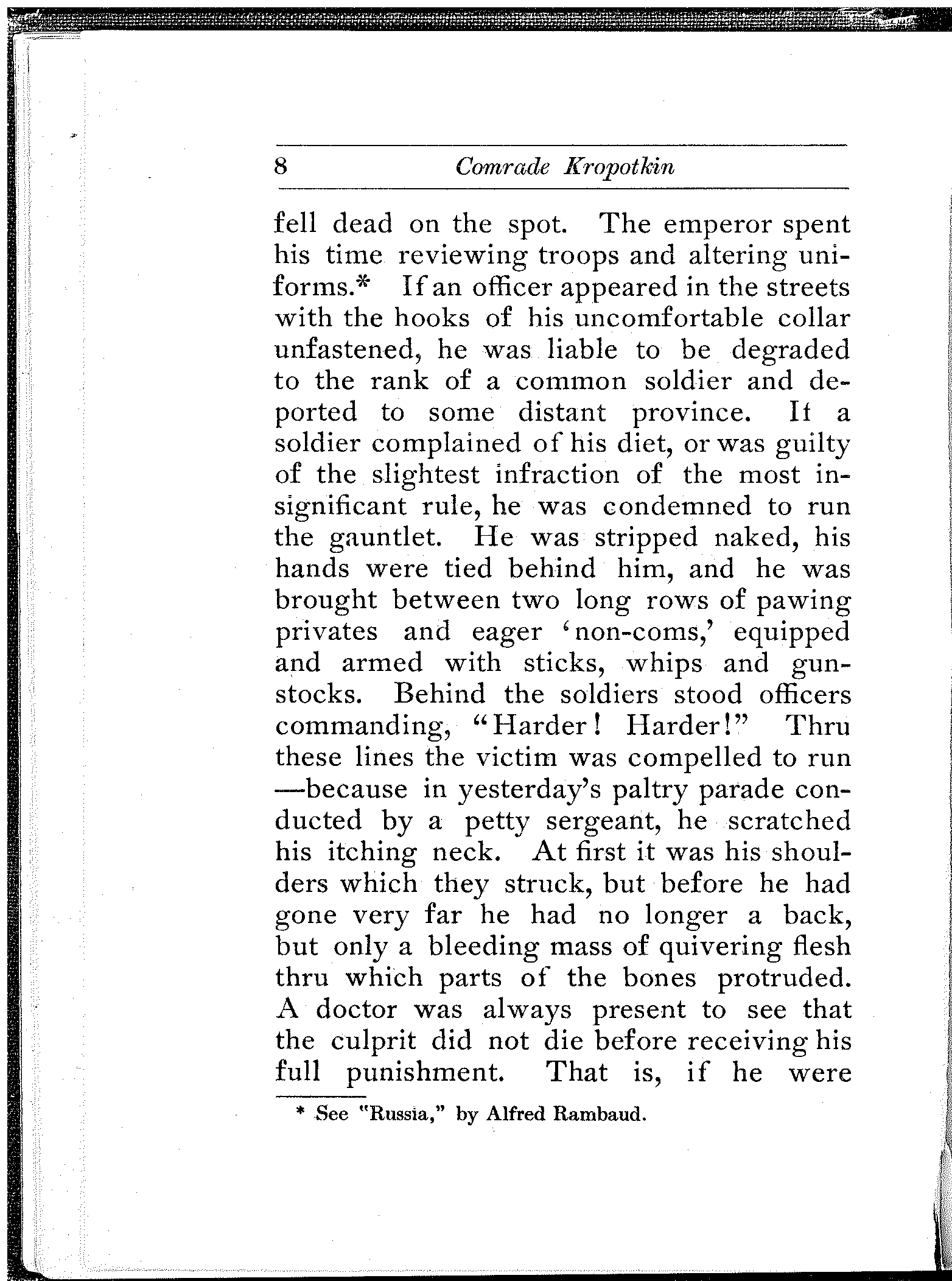 The mighty country was turned into a military camp. The term of service was twenty-five years. The life was so hard that when a man was recruited, his relatives followed him as if to his grave. His mother ran after him, and sometimes[8] fell dead on the spot. The emperor spent his time reviewing troops and altering uniforms.[1] If an officer appeared in the streets with the hooks of his uncomfortable collar unfastened, he was liable to be degraded to the rank of a common soldier and deported to some distant province. If a soldier complained of his diet, or was guilty of the slightest infraction of the most insignificant rule, he was condemned to run the gauntlet. He was stripped naked, his hands were tied behind him, and he was brought between two long rows of pawing privates and eager 'non-coms,' equipped and armed with sticks, whips and gun-stocks. Behind the soldiers stood officers commanding, "Harder! Harder!" Thru these lines the victim was compelled to run—because in yesterday's paltry parade conducted by a petty sergeant, he scratched his itching neck. At first it was his shoulders which they struck, but before he had gone very far he had no longer a back, but only a bleeding mass of quivering flesh thru which parts of the bones protruded. A doctor was always present to see that the culprit did not die before receiving his full punishment. That is, if he were[9] booked for 500 blows and was on the point of succumbing after receiving 300, it was the physician's duty to send him to a hospital to regain sufficient strength to allow the additional 200 to be administered. However, in spite of the medicus, the mangled men often perished before their time, and then there was nothing to do but beat the corpse.[2]