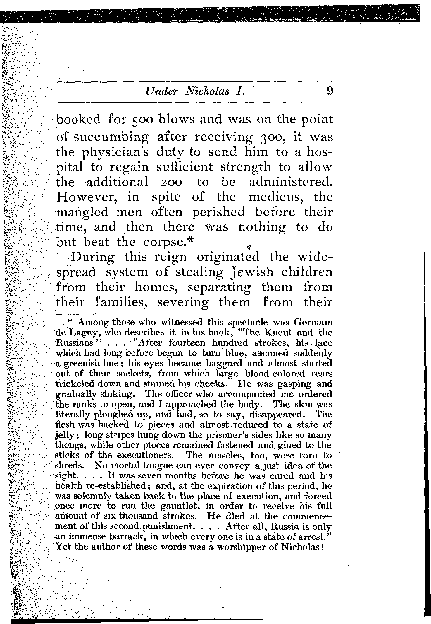 [2] Among those who witnessed this spectacle was Germain de Lagny, who describes it in his book, "The Knout and the Russians" ... "After fourteen hundred strokes, his face which had long before begun to turn blue, assumed suddenly a greenish hue; his eyes became haggard and almost started out of their sockets, from which large blood-colored tears trickeled down and stained his cheeks. He was gasping and gradually sinking. The officer who accompanied me ordered the ranks to open, and I approached the body. The skin was literally ploughed up, and had, so to say, disappeared. The flesh was hacked to pieces and almost reduced to a state of jelly; long stripes hung down the prisoner's sides like so many thongs, while other pieces remained fastened and glued to the sticks of the executioners. The muscles, too, were torn to shreds. No mortal tongue can ever convey a just idea of the sight.... It was seven months before he was cured and his health re-established; and, at the expiration of this period, he was solemnly taken back to the place of execution, and forced once more to run the gauntlet, in order to receive his full amount of six thousand strokes. He died at the commencement of this second punishment.... After all, Russia is only an immense barrack, in which every one is in a state of arrest." Yet the author of these words was a worshipper of Nicholas!