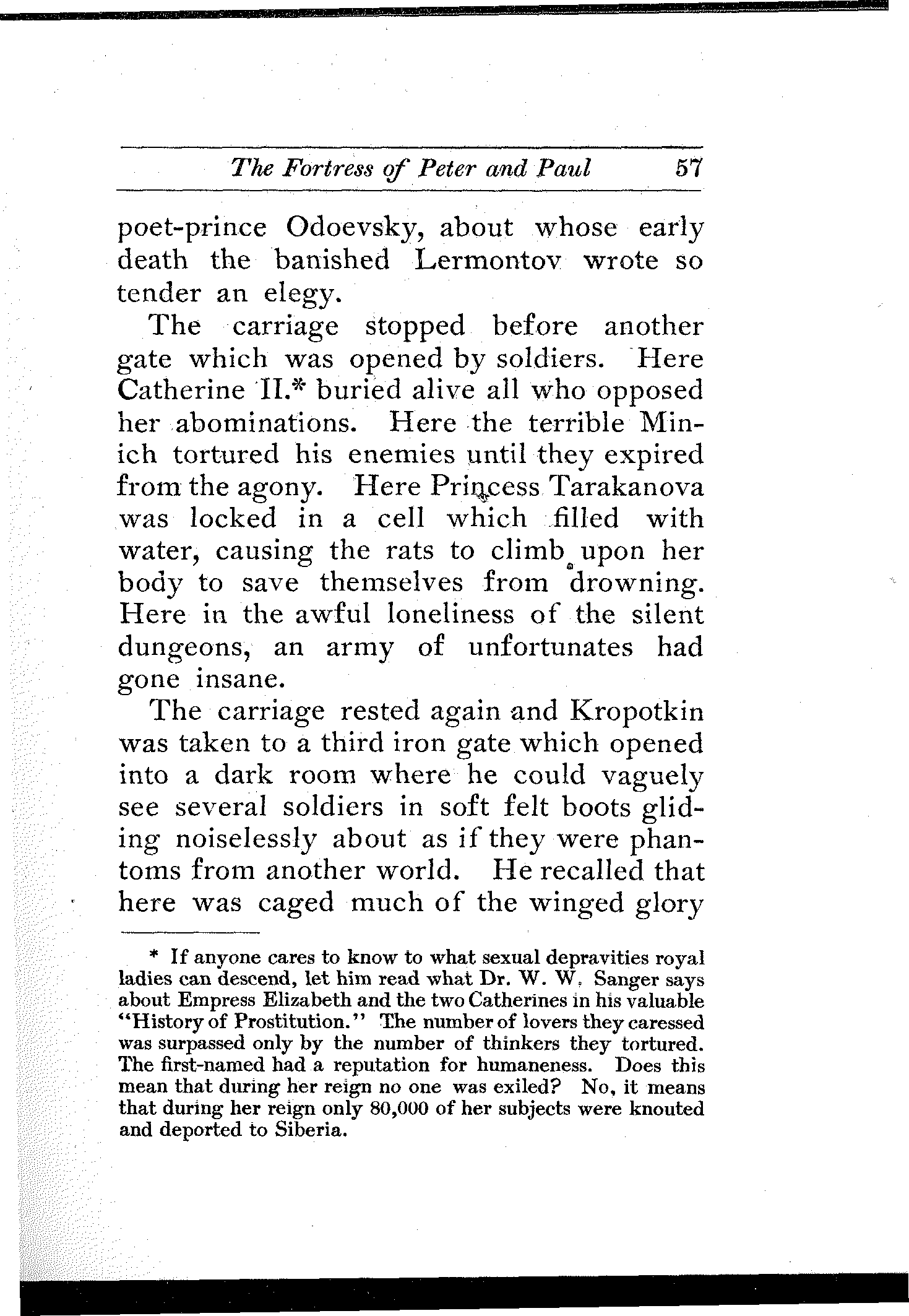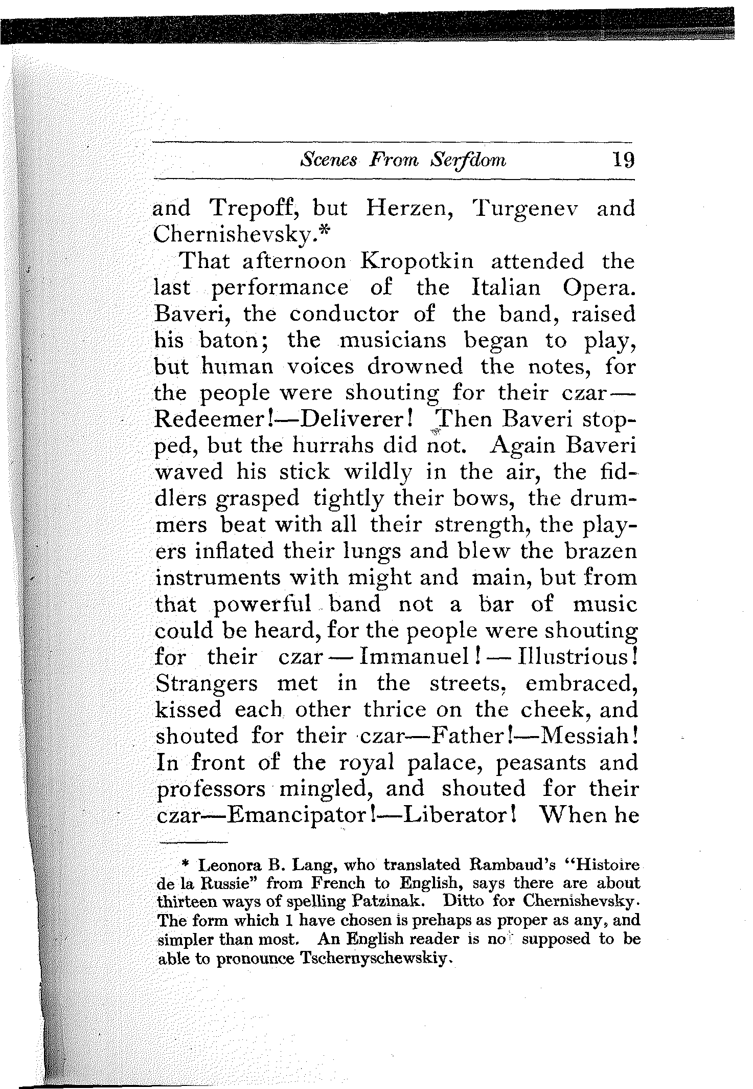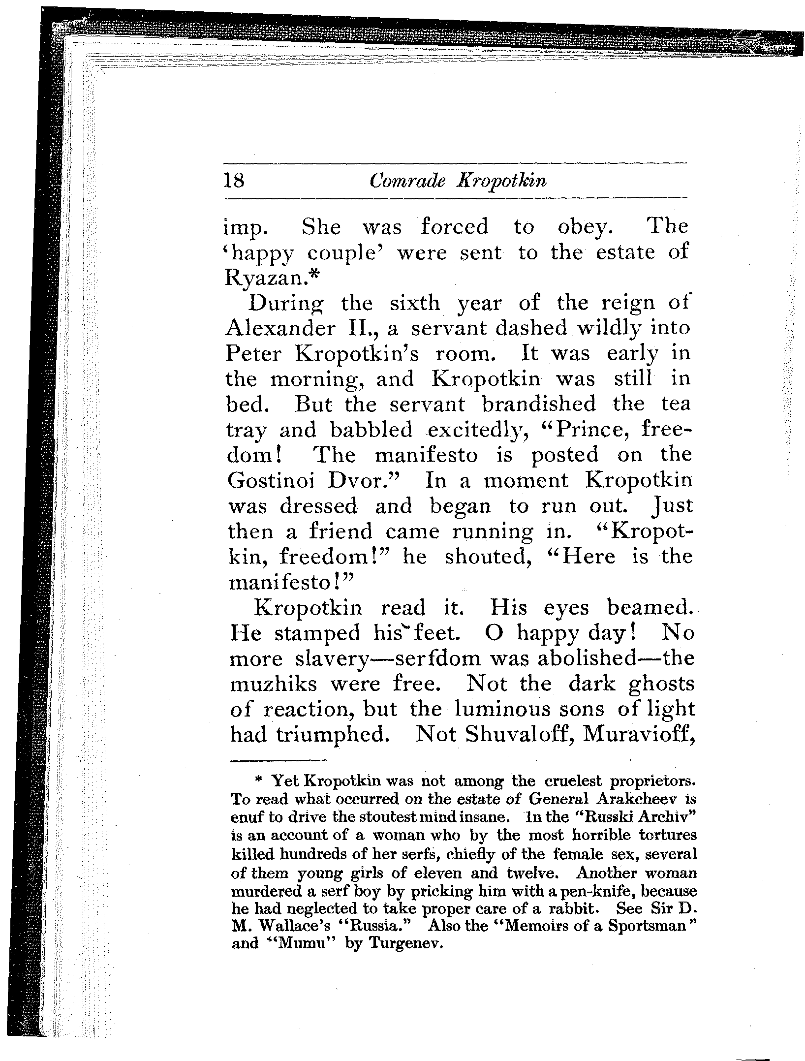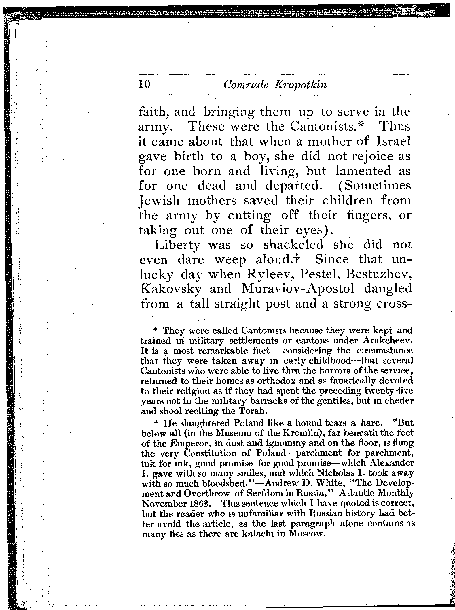 [4] He slaughtered Poland like a hound tears a hare. "But below all (in the Museum of the Kremlin), far beneath the feet of the Emperor, in dust and ignominy and on the floor, is flung the very Constitution of Poland—parchment for parchment, ink for ink, good promise for good promise—which Alexander I. gave with so many smiles, and which Nicholas I. took away with so much bloodshed."—Andrew D. White, "The Development and Overthrow of Serfdom in Russia," Atlantic Monthly November 1862. This sentence which I have quoted is correct, but the reader who is unfamiliar with Russian history had better avoid the article, as the last paragraph alone contains as many lies as there are kalachi in Moscow.