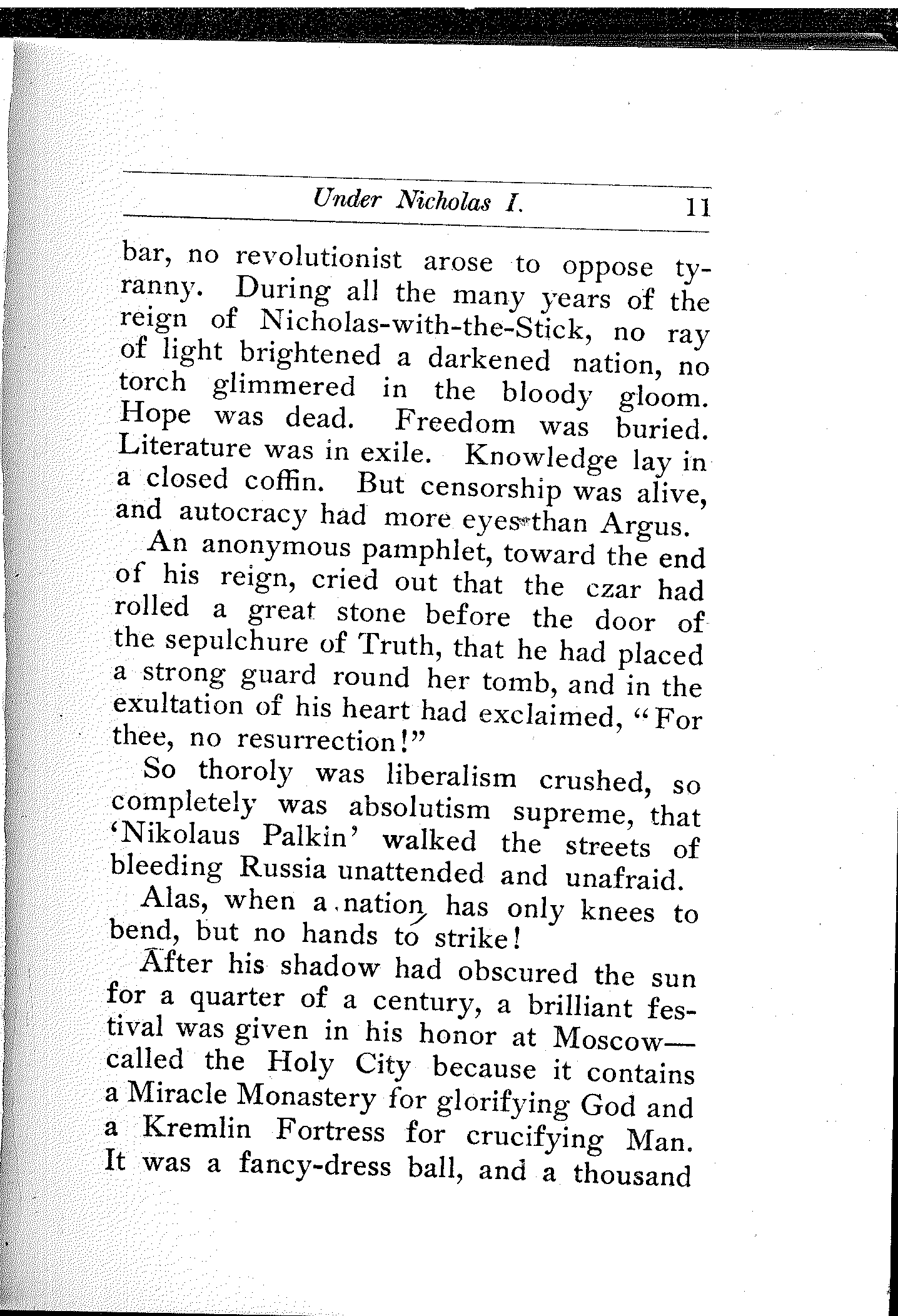 An anonymous pamphlet, toward the end of his reign, cried out that the czar had rolled a great stone before the door of the sepulchure of Truth, that he had placed a strong guard round her tomb, and in the exultation of his heart had exclaimed, "For thee, no resurrection!"