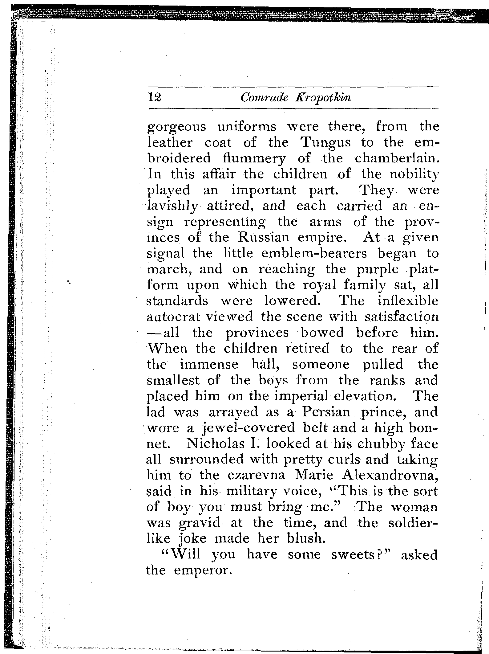 After his shadow had obscured the sun for a quarter of a century, a brilliant festival was given in his honor at Moscow—called the Holy City because it contains a Miracle Monastery for glorifying God and a Kremlin Fortress for crucifying Man. It was a fancy-dress ball, and a thousand[12] gorgeous uniforms were there, from the leather coat of the Tungus to the embroidered flummery of the chamberlain. In this affair the children of the nobility played an important part. They were lavishly attired, and each carried an ensign representing the arms of the provinces of the Russian empire. At a given signal the little emblem-bearers began to march, and on reaching the purple platform upon which the royal family sat, all standards were lowered. The inflexible autocrat viewed the scene with satisfaction—all the provinces bowed before him. When the children retired to the rear of the immense hall, someone pulled the smallest of the boys from the ranks and placed him on the imperial elevation. The lad was arrayed as a Persian prince, and wore a jewel-covered belt and a high bonnet. Nicholas I. looked at his chubby face all surrounded with pretty curls and taking him to the czarevna Marie Alexandrovna, said in his military voice, "This is the sort of boy you must bring me." The woman was gravid at the time, and the soldier-like joke made her blush.