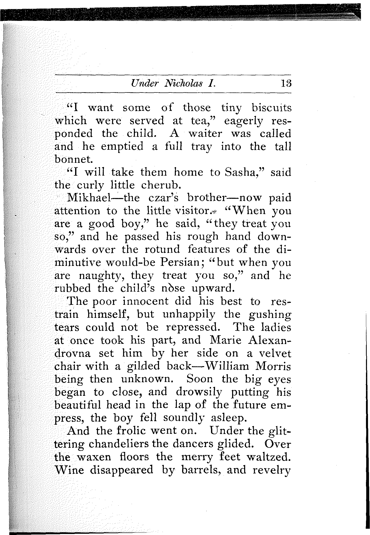 The poor innocent did his best to restrain himself, but unhappily the gushing tears could not be repressed. The ladies at once took his part, and Marie Alexandrovna set him by her side on a velvet chair with a gilded back—William Morris being then unknown. Soon the big eyes began to close, and drowsily putting his beautiful head in the lap of the future empress, the boy fell soundly asleep.