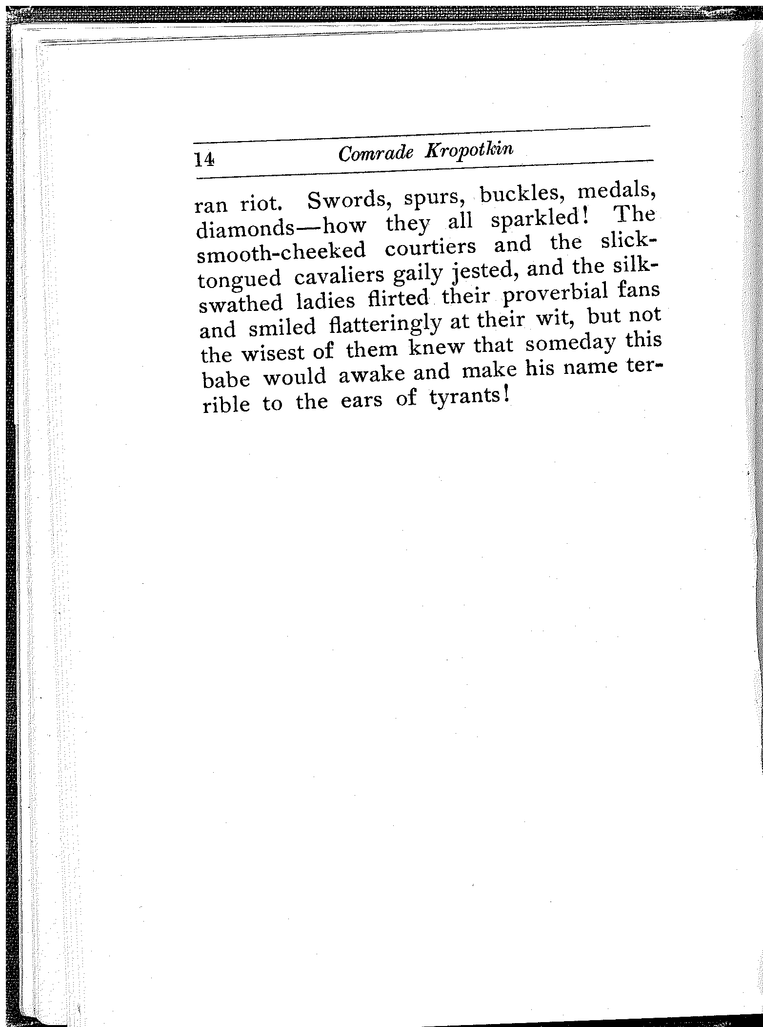 And the frolic went on. Under the glittering chandeliers the dancers glided. Over the waxen floors the merry feet waltzed. Wine disappeared by barrels, and revelry[14] ran riot. Swords, spurs, buckles, medals, diamonds—how they all sparkled! The smooth-cheeked courtiers and the slick-tongued cavaliers gaily jested, and the silk-swathed ladies flirted their proverbial fans and smiled flatteringly at their wit, but not the wisest of them knew that someday this babe would awake and make his name terrible to the ears of tyrants!
