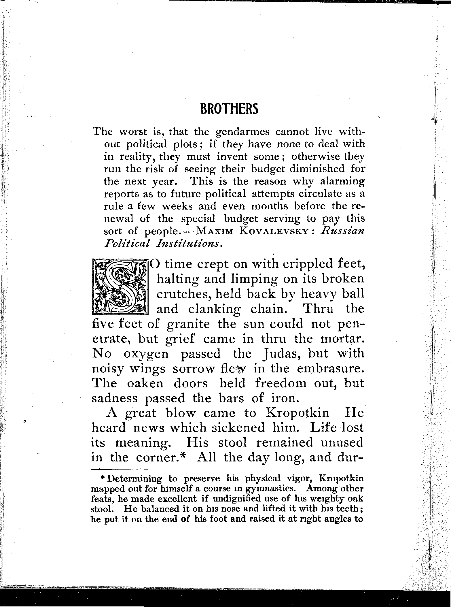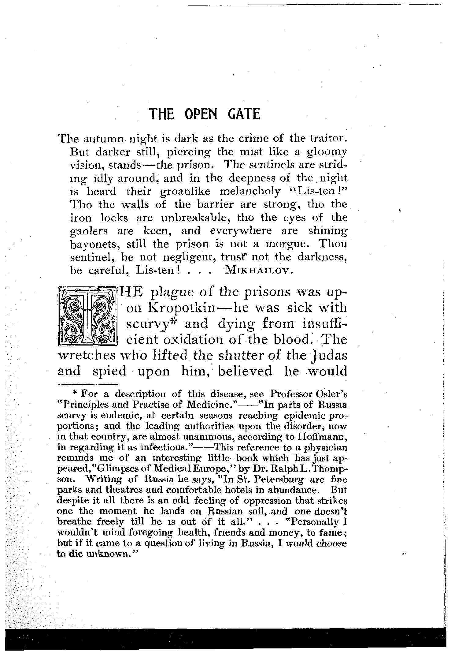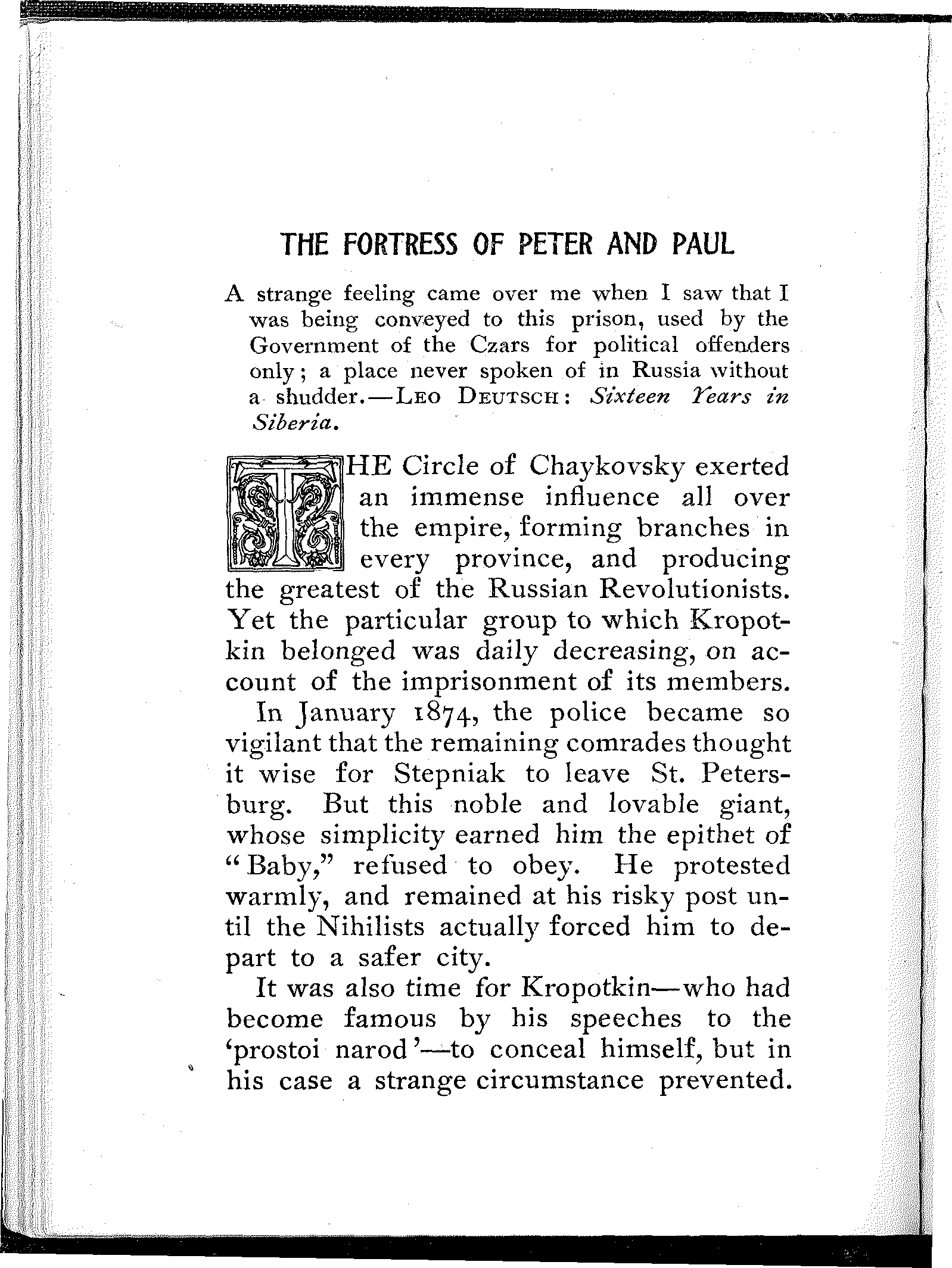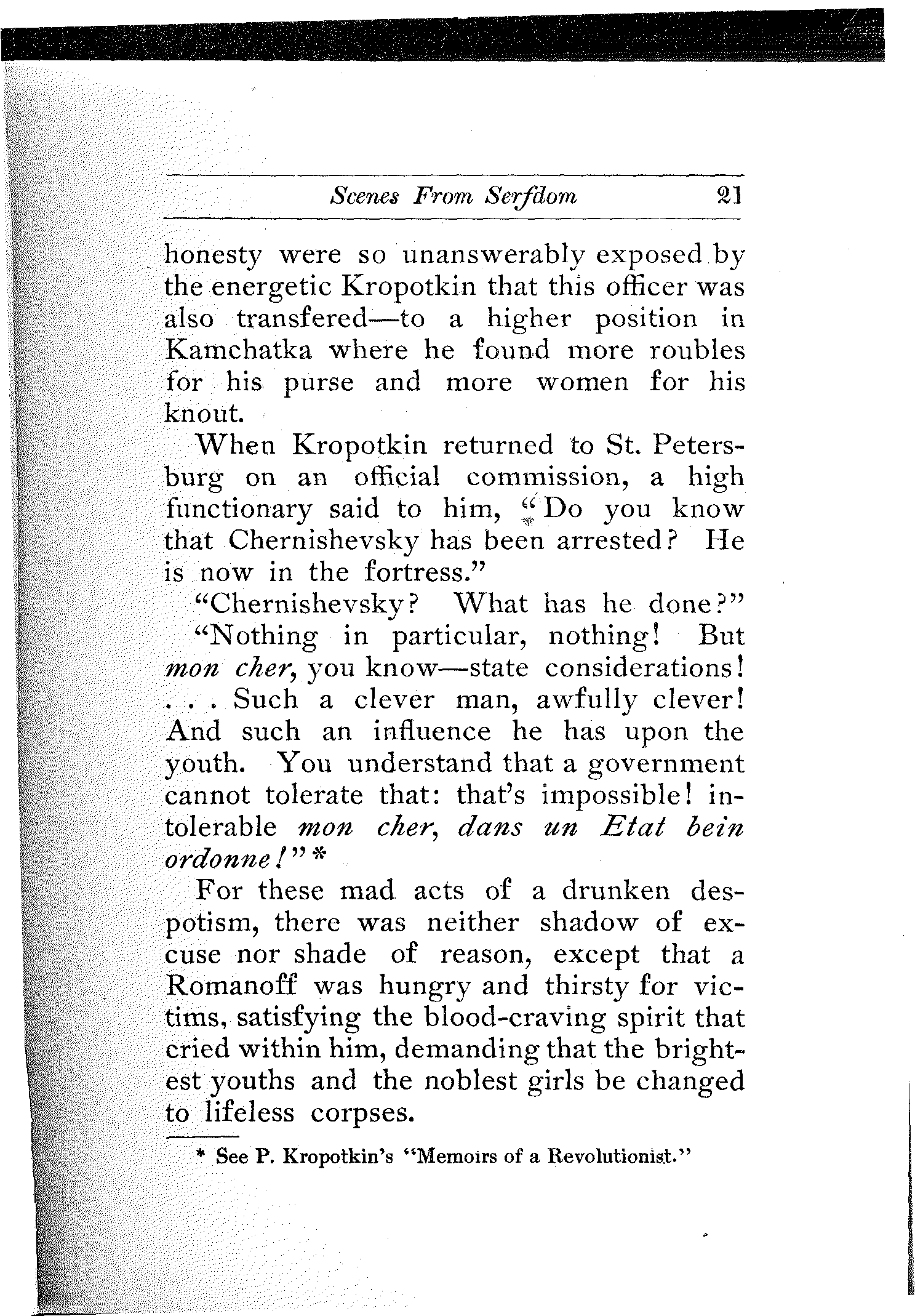 This essay was written at the age of twenty, and the youth of the author will serve as an apology, if apology be needed, for the sharpness of some of the expressions found in these pages. But is excuse really necessary? I hardly think so. No language can be[6] too strong when condemning the Russian Bureaucracy, no judgment can be too severe when pronounced on czardom and its cruel minions. In fact the English language sometimes seems inadequate....
