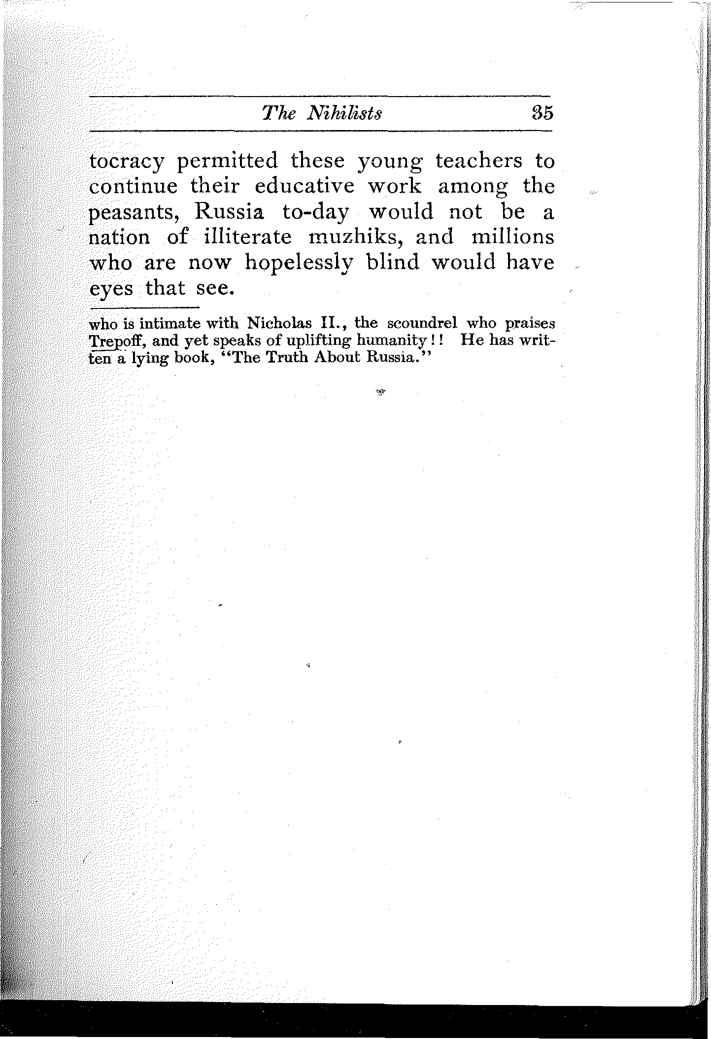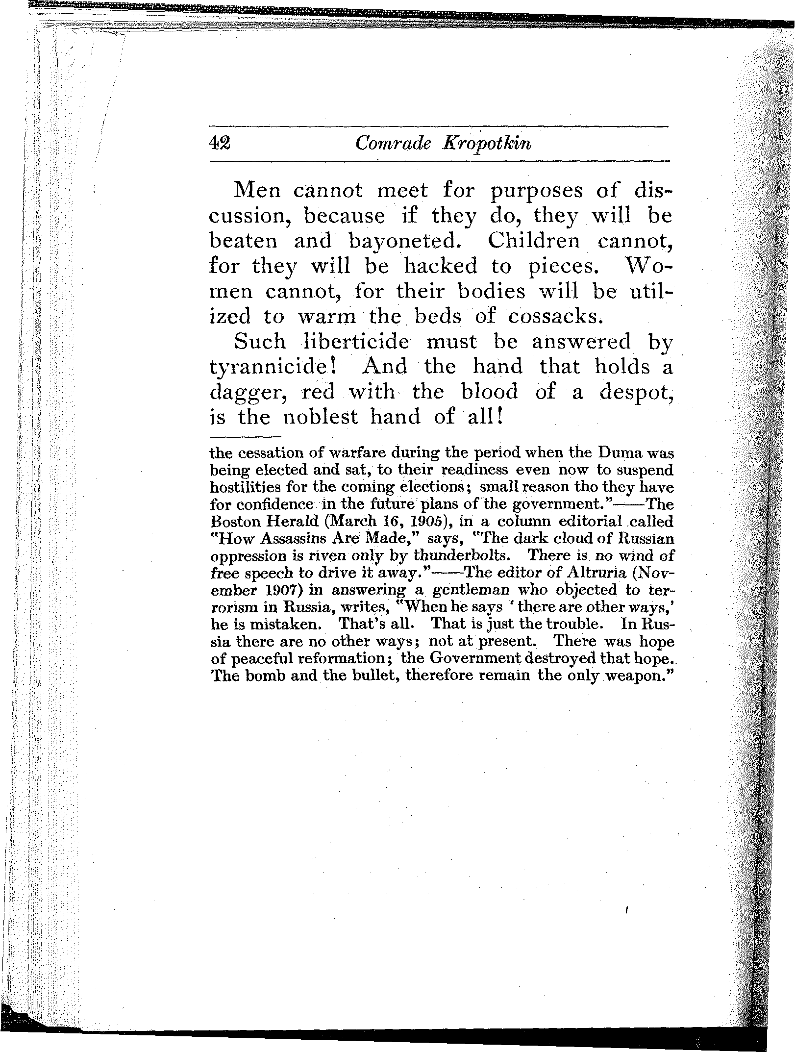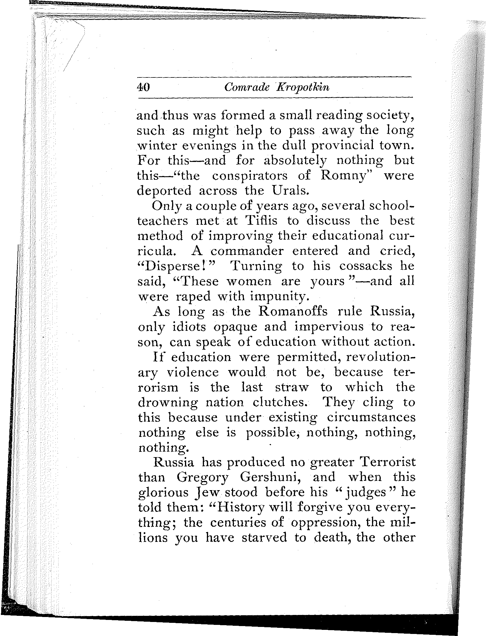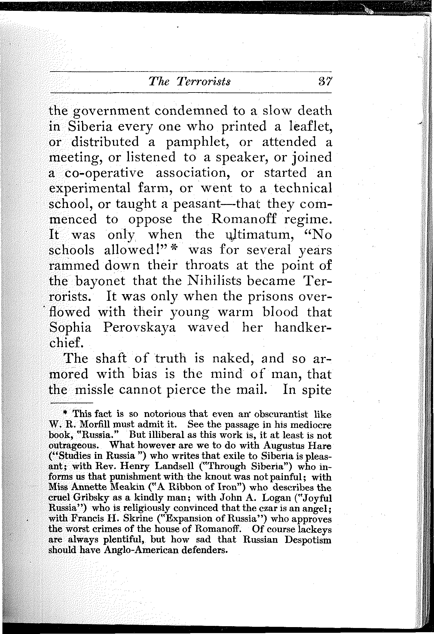 A remarkable commentary on the conditions in Russia is the fact that he who studies them carefully and thoroly, be he the gentlest and sweetest youth who would not harm a fly or tread on a worm, becomes saturated with the conviction that in Russia, the rebel's bomb and pistol and dagger are not only legitimate and necessary, but even noble weapons of defense and offense.