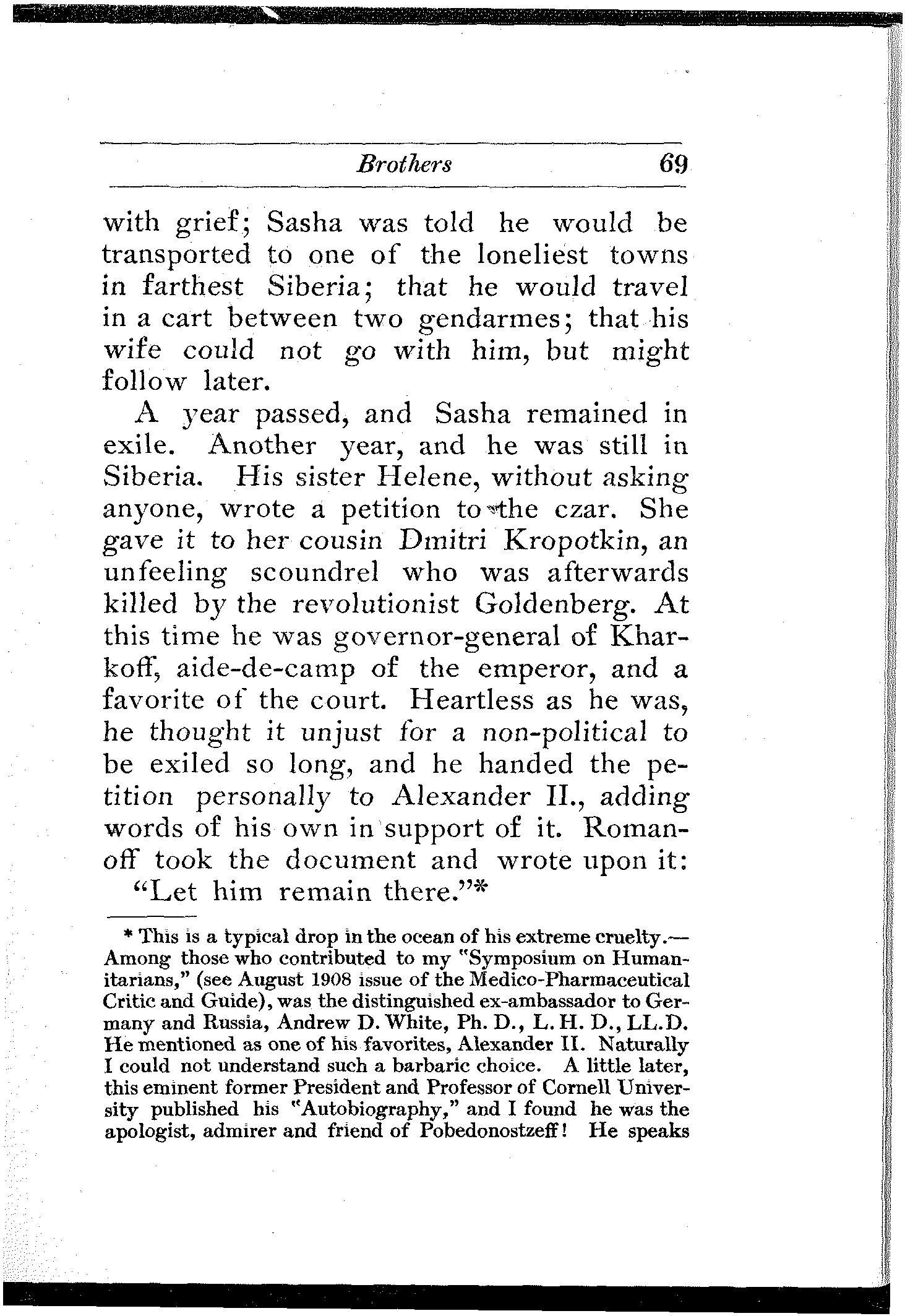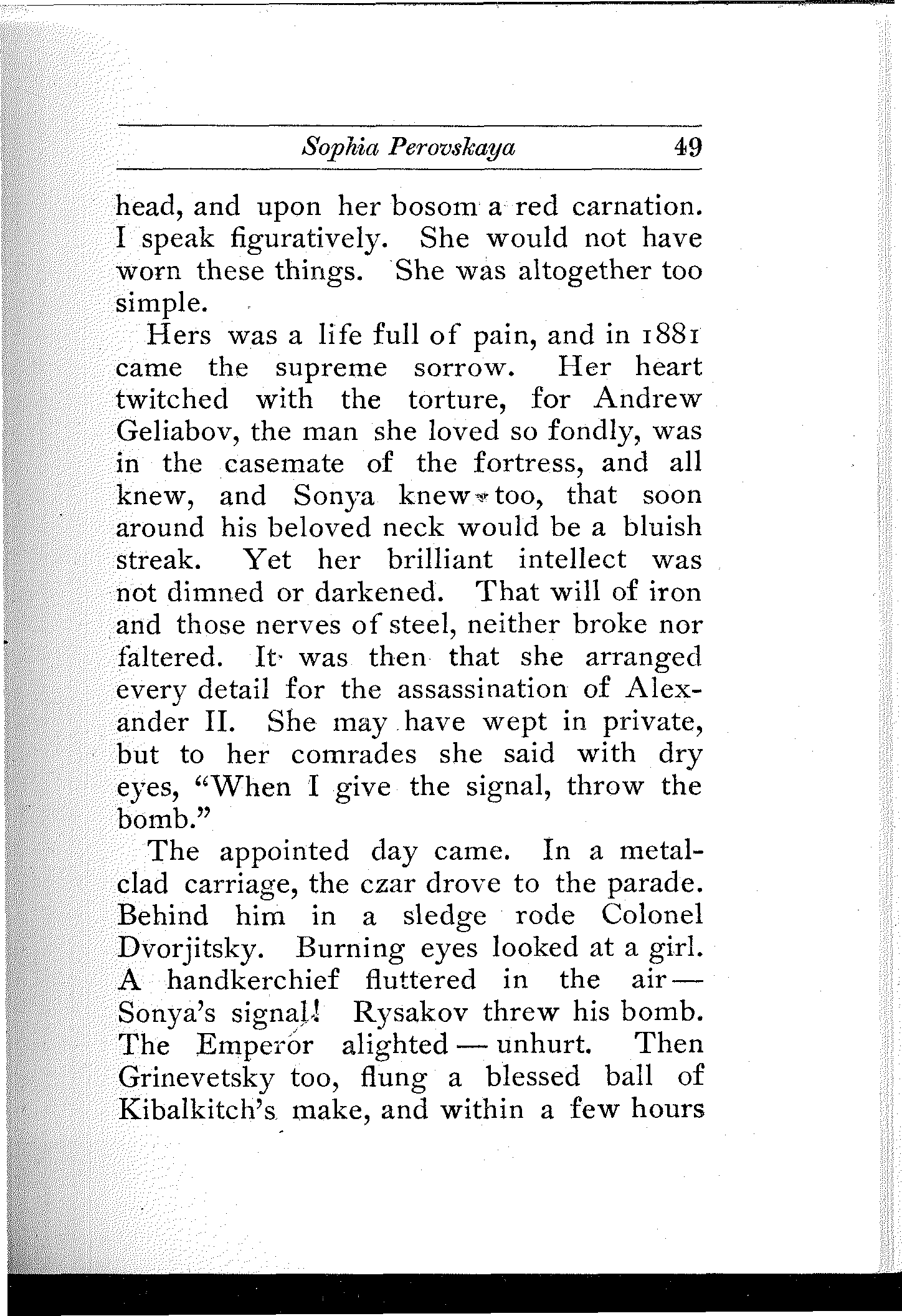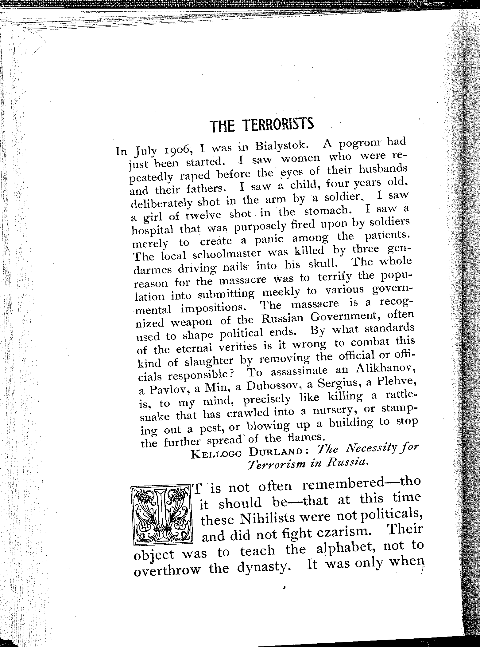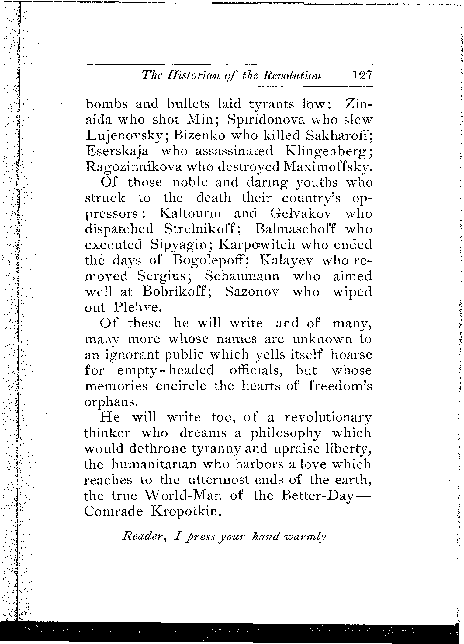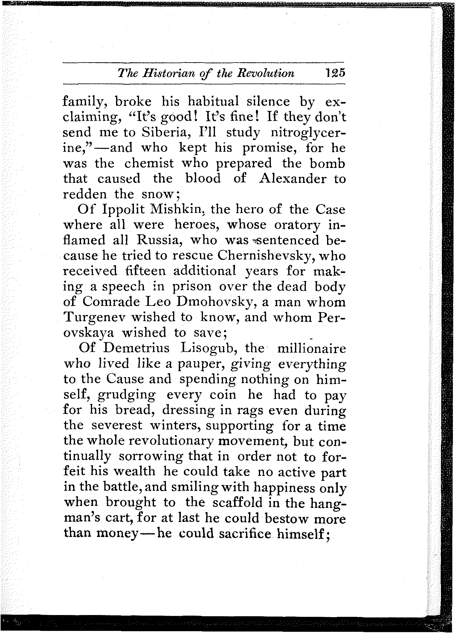 A remarkable commentary on the conditions in Russia is the fact that he who studies them carefully and thoroly, be he the gentlest and sweetest youth who would not harm a fly or tread on a worm, becomes saturated with the conviction that in Russia, the rebel's bomb and pistol and dagger are not only legitimate and necessary, but even noble weapons of defense and offense.