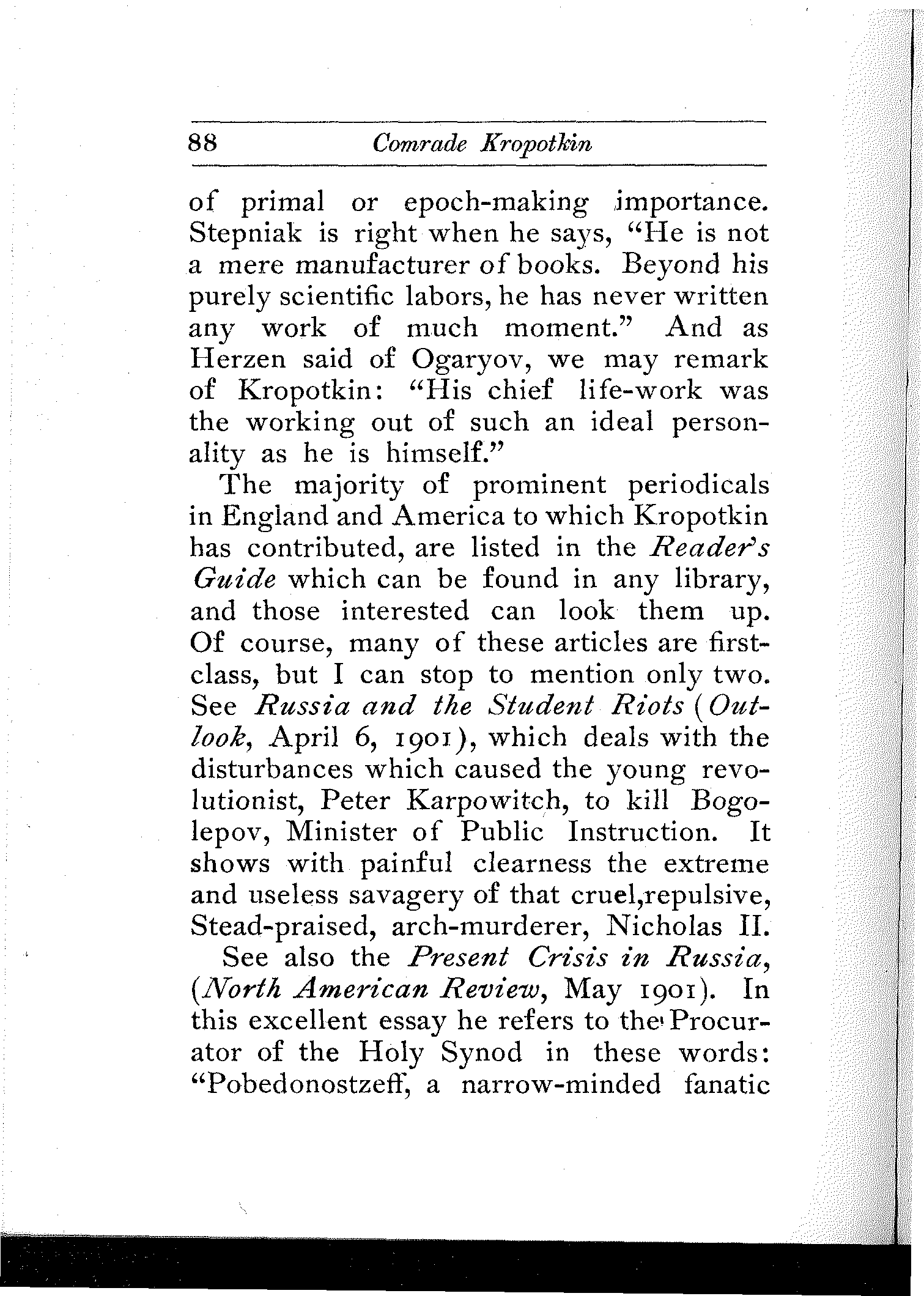 So thoroly was liberalism crushed, so completely was absolutism supreme, that 'Nikolaus Palkin' walked the streets of bleeding Russia unattended and unafraid.