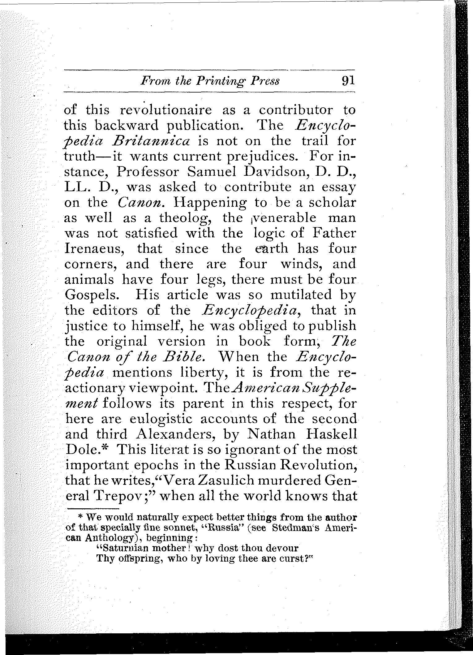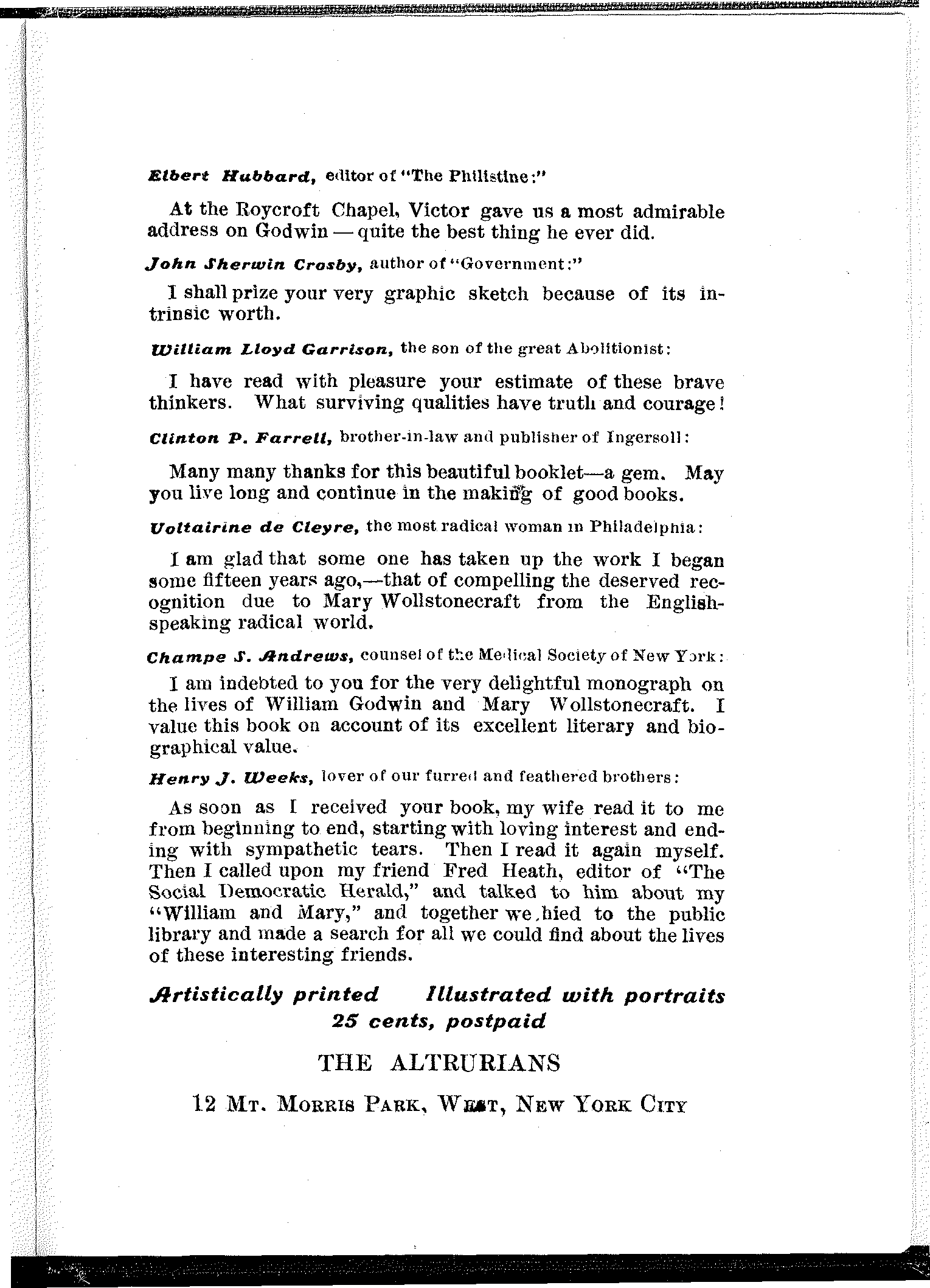 I am indebted to you for the very delightful monograph on the lives of William Godwin and Mary Wollstonecraft. I value this book on account of its excellent literary and biographical value.