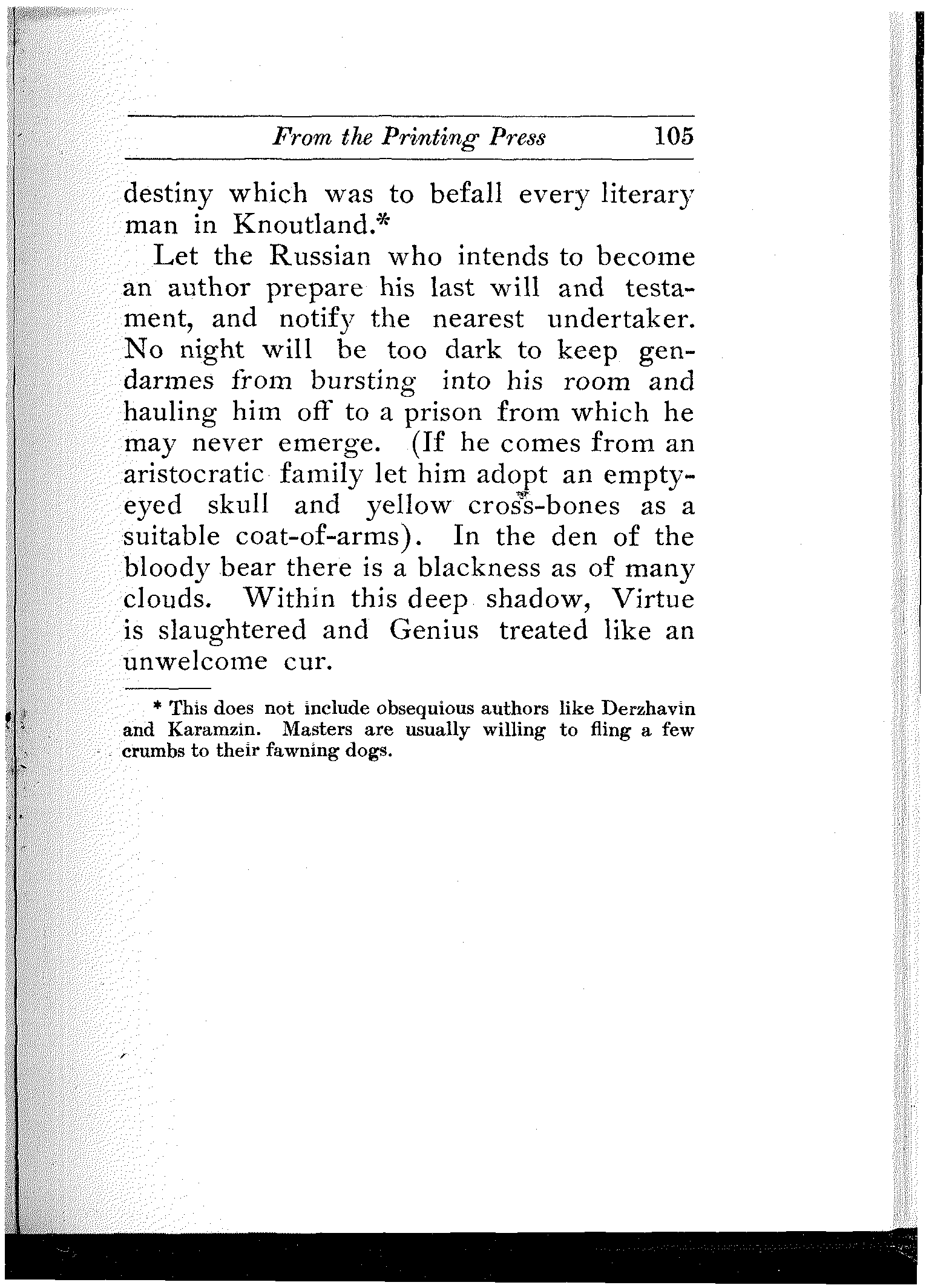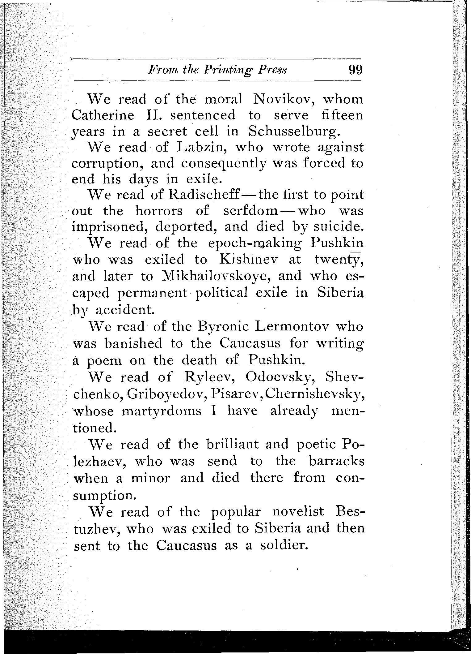 Liberty was so shackeled she did not even dare weep aloud.[4] Since that unlucky day when Ryleev, Pestel, Bestuzhev, Kakovsky and Muraviov-Apostol dangled from a tall straight post and a strong [11]crossbar, no revolutionist arose to oppose tyranny. During all the many years of the reign of Nicholas-with-the-Stick, no ray of light brightened a darkened nation, no torch glimmered in the bloody gloom. Hope was dead. Freedom was buried. Literature was in exile. Knowledge lay in a closed coffin. But censorship was alive, and autocracy had more eyes than Argus.