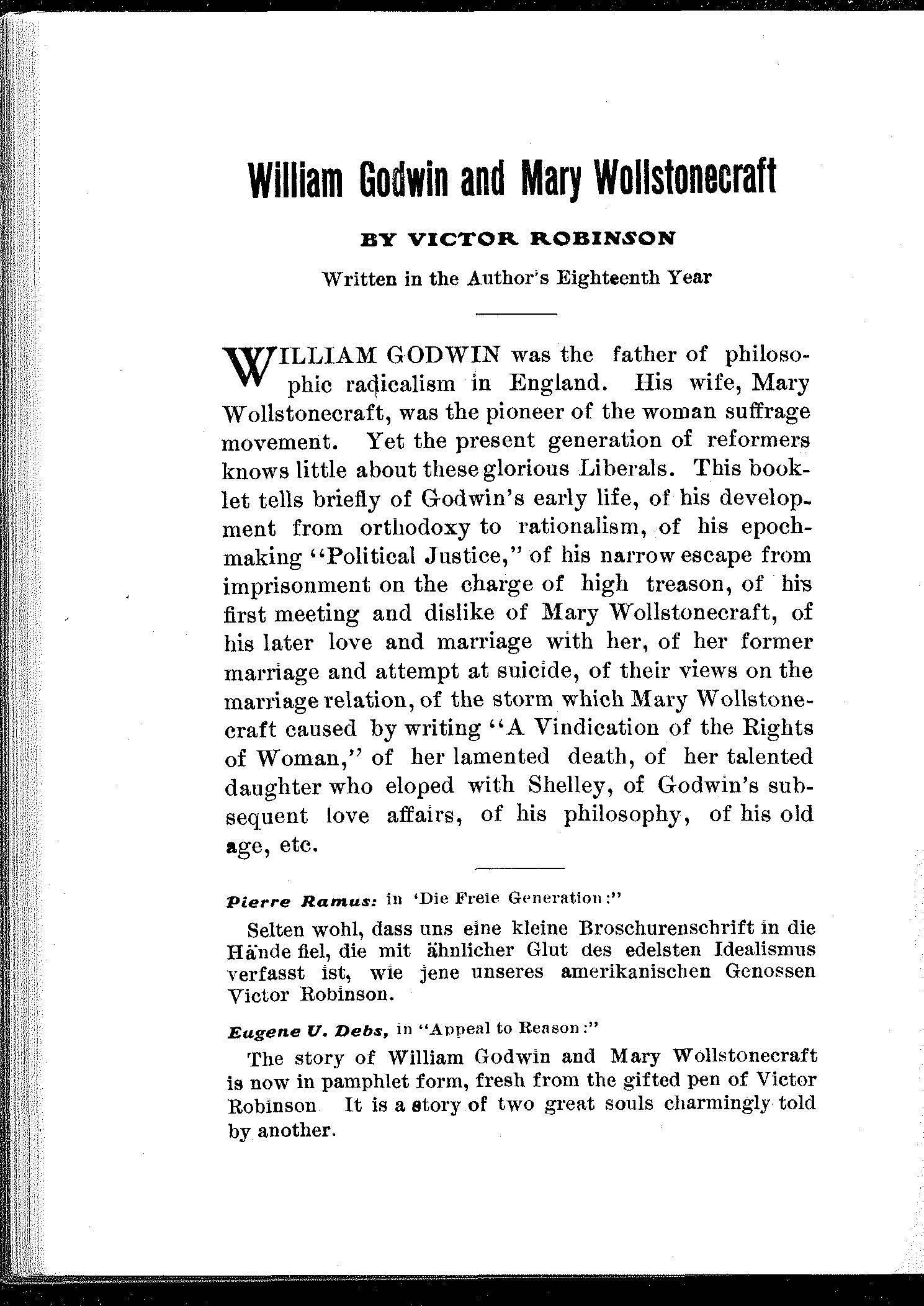 The story of William Godwin and Mary Wollstonecraft is now in pamphlet form, fresh from the gifted pen of Victor Robinson. It is a story of two great souls charmingly told by another.